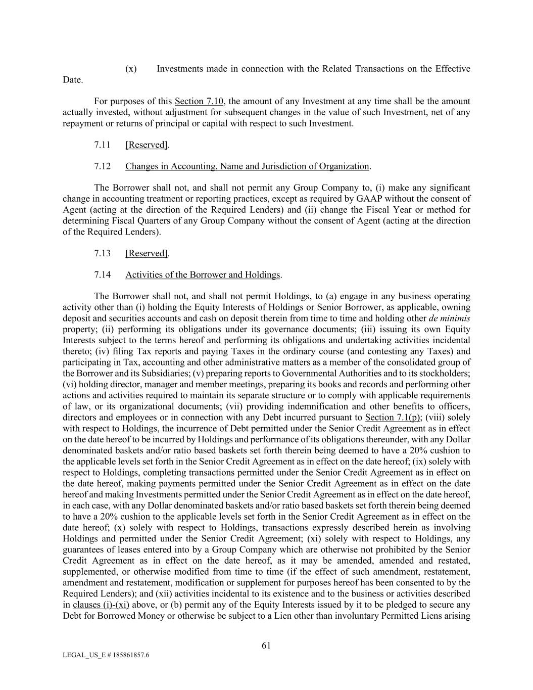 61 LEGAL_US_E # 185861857.6 (x) Investments made in connection with the Related Transactions on the Effective Date. For purposes of this Section 7.10, the amount of any Investment at any time shall be the amount actually invested, without adjustment for subsequent changes in the value of such Investment, net of any repayment or returns of principal or capital with respect to such Investment. 7.11 [Reserved]. 7.12 Changes in Accounting, Name and Jurisdiction of Organization. The Borrower shall not, and shall not permit any Group Company to, (i) make any significant change in accounting treatment or reporting practices, except as required by GAAP without the consent of Agent (acting at the direction of the Required Lenders) and (ii) change the Fiscal Year or method for determining Fiscal Quarters of any Group Company without the consent of Agent (acting at the direction of the Required Lenders). 7.13 [Reserved]. 7.14 Activities of the Borrower and Holdings. The Borrower shall not, and shall not permit Holdings, to (a) engage in any business operating activity other than (i) holding the Equity Interests of Holdings or Senior Borrower, as applicable, owning deposit and securities accounts and cash on deposit therein from time to time and holding other de minimis property; (ii) performing its obligations under its governance documents; (iii) issuing its own Equity Interests subject to the terms hereof and performing its obligations and undertaking activities incidental thereto; (iv) filing Tax reports and paying Taxes in the ordinary course (and contesting any Taxes) and participating in Tax, accounting and other administrative matters as a member of the consolidated group of the Borrower and its Subsidiaries; (v) preparing reports to Governmental Authorities and to its stockholders; (vi) holding director, manager and member meetings, preparing its books and records and performing other actions and activities required to maintain its separate structure or to comply with applicable requirements of law, or its organizational documents; (vii) providing indemnification and other benefits to officers, directors and employees or in connection with any Debt incurred pursuant to Section 7.1(p); (viii) solely with respect to Holdings, the incurrence of Debt permitted under the Senior Credit Agreement as in effect on the date hereof to be incurred by Holdings and performance of its obligations thereunder, with any Dollar denominated baskets and/or ratio based baskets set forth therein being deemed to have a 20% cushion to the applicable levels set forth in the Senior Credit Agreement as in effect on the date hereof; (ix) solely with respect to Holdings, completing transactions permitted under the Senior Credit Agreement as in effect on the date hereof, making payments permitted under the Senior Credit Agreement as in effect on the date hereof and making Investments permitted under the Senior Credit Agreement as in effect on the date hereof, in each case, with any Dollar denominated baskets and/or ratio based baskets set forth therein being deemed to have a 20% cushion to the applicable levels set forth in the Senior Credit Agreement as in effect on the date hereof; (x) solely with respect to Holdings, transactions expressly described herein as involving Holdings and permitted under the Senior Credit Agreement; (xi) solely with respect to Holdings, any guarantees of leases entered into by a Group Company which are otherwise not prohibited by the Senior Credit Agreement as in effect on the date hereof, as it may be amended, amended and restated, supplemented, or otherwise modified from time to time (if the effect of such amendment, restatement, amendment and restatement, modification or supplement for purposes hereof has been consented to by the Required Lenders); and (xii) activities incidental to its existence and to the business or activities described in clauses (i)-(xi) above, or (b) permit any of the Equity Interests issued by it to be pledged to secure any Debt for Borrowed Money or otherwise be subject to a Lien other than involuntary Permitted Liens arising