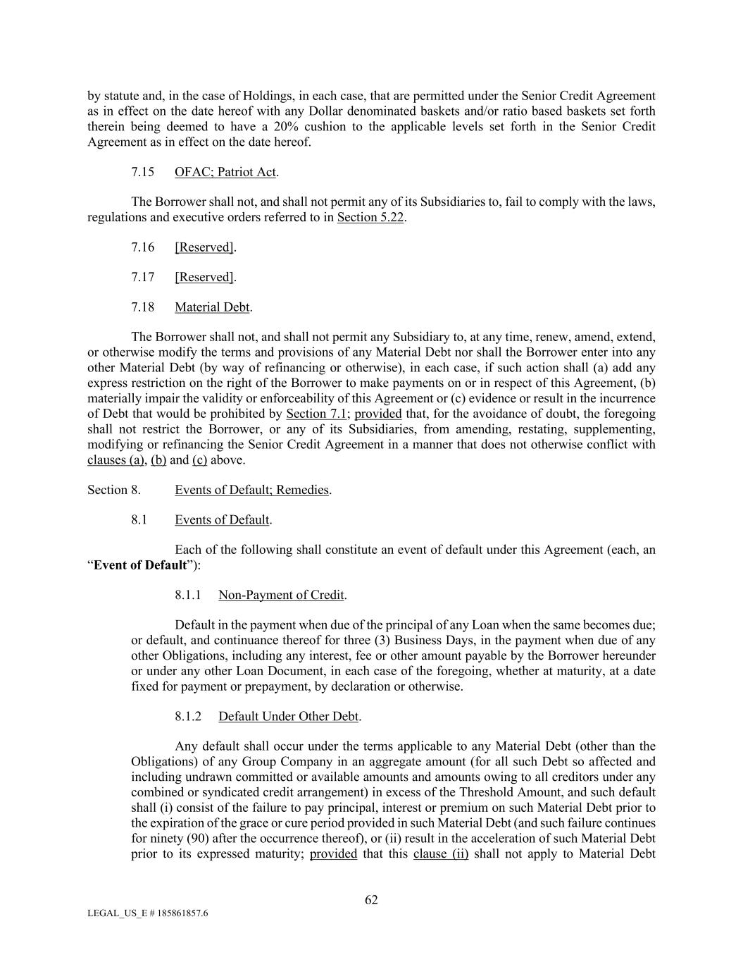 62 LEGAL_US_E # 185861857.6 by statute and, in the case of Holdings, in each case, that are permitted under the Senior Credit Agreement as in effect on the date hereof with any Dollar denominated baskets and/or ratio based baskets set forth therein being deemed to have a 20% cushion to the applicable levels set forth in the Senior Credit Agreement as in effect on the date hereof. 7.15 OFAC; Patriot Act. The Borrower shall not, and shall not permit any of its Subsidiaries to, fail to comply with the laws, regulations and executive orders referred to in Section 5.22. 7.16 [Reserved]. 7.17 [Reserved]. 7.18 Material Debt. The Borrower shall not, and shall not permit any Subsidiary to, at any time, renew, amend, extend, or otherwise modify the terms and provisions of any Material Debt nor shall the Borrower enter into any other Material Debt (by way of refinancing or otherwise), in each case, if such action shall (a) add any express restriction on the right of the Borrower to make payments on or in respect of this Agreement, (b) materially impair the validity or enforceability of this Agreement or (c) evidence or result in the incurrence of Debt that would be prohibited by Section 7.1; provided that, for the avoidance of doubt, the foregoing shall not restrict the Borrower, or any of its Subsidiaries, from amending, restating, supplementing, modifying or refinancing the Senior Credit Agreement in a manner that does not otherwise conflict with clauses (a), (b) and (c) above. Section 8. Events of Default; Remedies. 8.1 Events of Default. Each of the following shall constitute an event of default under this Agreement (each, an “Event of Default”): 8.1.1 Non-Payment of Credit. Default in the payment when due of the principal of any Loan when the same becomes due; or default, and continuance thereof for three (3) Business Days, in the payment when due of any other Obligations, including any interest, fee or other amount payable by the Borrower hereunder or under any other Loan Document, in each case of the foregoing, whether at maturity, at a date fixed for payment or prepayment, by declaration or otherwise. 8.1.2 Default Under Other Debt. Any default shall occur under the terms applicable to any Material Debt (other than the Obligations) of any Group Company in an aggregate amount (for all such Debt so affected and including undrawn committed or available amounts and amounts owing to all creditors under any combined or syndicated credit arrangement) in excess of the Threshold Amount, and such default shall (i) consist of the failure to pay principal, interest or premium on such Material Debt prior to the expiration of the grace or cure period provided in such Material Debt (and such failure continues for ninety (90) after the occurrence thereof), or (ii) result in the acceleration of such Material Debt prior to its expressed maturity; provided that this clause (ii) shall not apply to Material Debt