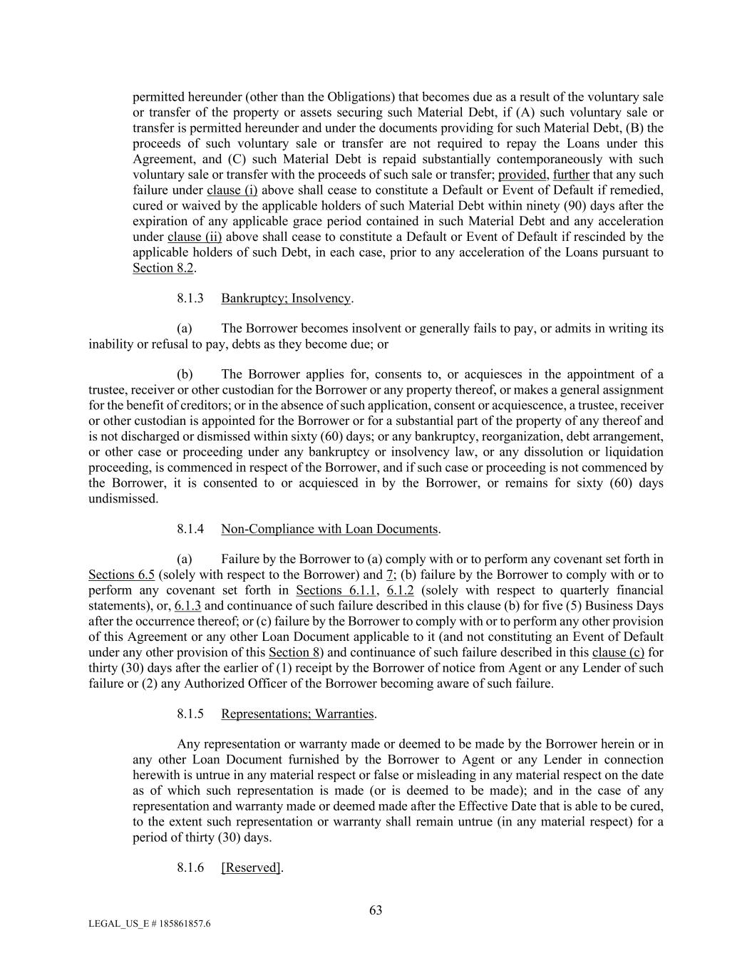 63 LEGAL_US_E # 185861857.6 permitted hereunder (other than the Obligations) that becomes due as a result of the voluntary sale or transfer of the property or assets securing such Material Debt, if (A) such voluntary sale or transfer is permitted hereunder and under the documents providing for such Material Debt, (B) the proceeds of such voluntary sale or transfer are not required to repay the Loans under this Agreement, and (C) such Material Debt is repaid substantially contemporaneously with such voluntary sale or transfer with the proceeds of such sale or transfer; provided, further that any such failure under clause (i) above shall cease to constitute a Default or Event of Default if remedied, cured or waived by the applicable holders of such Material Debt within ninety (90) days after the expiration of any applicable grace period contained in such Material Debt and any acceleration under clause (ii) above shall cease to constitute a Default or Event of Default if rescinded by the applicable holders of such Debt, in each case, prior to any acceleration of the Loans pursuant to Section 8.2. 8.1.3 Bankruptcy; Insolvency. (a) The Borrower becomes insolvent or generally fails to pay, or admits in writing its inability or refusal to pay, debts as they become due; or (b) The Borrower applies for, consents to, or acquiesces in the appointment of a trustee, receiver or other custodian for the Borrower or any property thereof, or makes a general assignment for the benefit of creditors; or in the absence of such application, consent or acquiescence, a trustee, receiver or other custodian is appointed for the Borrower or for a substantial part of the property of any thereof and is not discharged or dismissed within sixty (60) days; or any bankruptcy, reorganization, debt arrangement, or other case or proceeding under any bankruptcy or insolvency law, or any dissolution or liquidation proceeding, is commenced in respect of the Borrower, and if such case or proceeding is not commenced by the Borrower, it is consented to or acquiesced in by the Borrower, or remains for sixty (60) days undismissed. 8.1.4 Non-Compliance with Loan Documents. (a) Failure by the Borrower to (a) comply with or to perform any covenant set forth in Sections 6.5 (solely with respect to the Borrower) and 7; (b) failure by the Borrower to comply with or to perform any covenant set forth in Sections 6.1.1, 6.1.2 (solely with respect to quarterly financial statements), or, 6.1.3 and continuance of such failure described in this clause (b) for five (5) Business Days after the occurrence thereof; or (c) failure by the Borrower to comply with or to perform any other provision of this Agreement or any other Loan Document applicable to it (and not constituting an Event of Default under any other provision of this Section 8) and continuance of such failure described in this clause (c) for thirty (30) days after the earlier of (1) receipt by the Borrower of notice from Agent or any Lender of such failure or (2) any Authorized Officer of the Borrower becoming aware of such failure. 8.1.5 Representations; Warranties. Any representation or warranty made or deemed to be made by the Borrower herein or in any other Loan Document furnished by the Borrower to Agent or any Lender in connection herewith is untrue in any material respect or false or misleading in any material respect on the date as of which such representation is made (or is deemed to be made); and in the case of any representation and warranty made or deemed made after the Effective Date that is able to be cured, to the extent such representation or warranty shall remain untrue (in any material respect) for a period of thirty (30) days. 8.1.6 [Reserved].