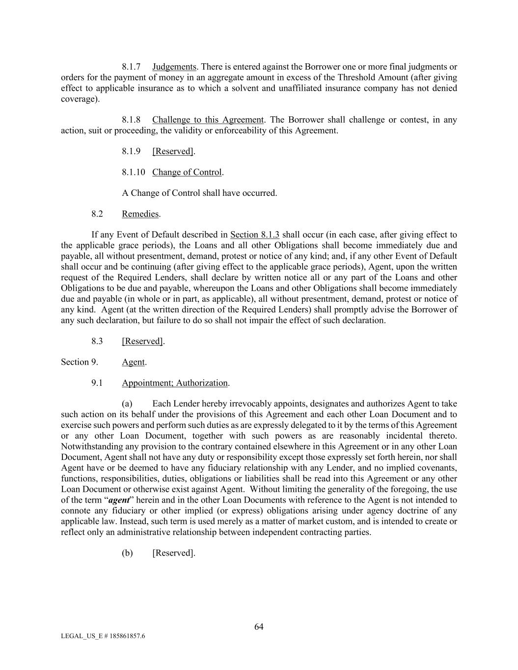 64 LEGAL_US_E # 185861857.6 8.1.7 Judgements. There is entered against the Borrower one or more final judgments or orders for the payment of money in an aggregate amount in excess of the Threshold Amount (after giving effect to applicable insurance as to which a solvent and unaffiliated insurance company has not denied coverage). 8.1.8 Challenge to this Agreement. The Borrower shall challenge or contest, in any action, suit or proceeding, the validity or enforceability of this Agreement. 8.1.9 [Reserved]. 8.1.10 Change of Control. A Change of Control shall have occurred. 8.2 Remedies. If any Event of Default described in Section 8.1.3 shall occur (in each case, after giving effect to the applicable grace periods), the Loans and all other Obligations shall become immediately due and payable, all without presentment, demand, protest or notice of any kind; and, if any other Event of Default shall occur and be continuing (after giving effect to the applicable grace periods), Agent, upon the written request of the Required Lenders, shall declare by written notice all or any part of the Loans and other Obligations to be due and payable, whereupon the Loans and other Obligations shall become immediately due and payable (in whole or in part, as applicable), all without presentment, demand, protest or notice of any kind. Agent (at the written direction of the Required Lenders) shall promptly advise the Borrower of any such declaration, but failure to do so shall not impair the effect of such declaration. 8.3 [Reserved]. Section 9. Agent. 9.1 Appointment; Authorization. (a) Each Lender hereby irrevocably appoints, designates and authorizes Agent to take such action on its behalf under the provisions of this Agreement and each other Loan Document and to exercise such powers and perform such duties as are expressly delegated to it by the terms of this Agreement or any other Loan Document, together with such powers as are reasonably incidental thereto. Notwithstanding any provision to the contrary contained elsewhere in this Agreement or in any other Loan Document, Agent shall not have any duty or responsibility except those expressly set forth herein, nor shall Agent have or be deemed to have any fiduciary relationship with any Lender, and no implied covenants, functions, responsibilities, duties, obligations or liabilities shall be read into this Agreement or any other Loan Document or otherwise exist against Agent. Without limiting the generality of the foregoing, the use of the term “agent” herein and in the other Loan Documents with reference to the Agent is not intended to connote any fiduciary or other implied (or express) obligations arising under agency doctrine of any applicable law. Instead, such term is used merely as a matter of market custom, and is intended to create or reflect only an administrative relationship between independent contracting parties. (b) [Reserved].