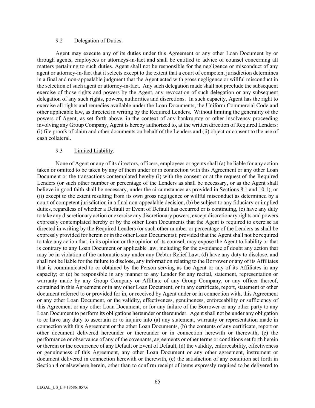 65 LEGAL_US_E # 185861857.6 9.2 Delegation of Duties. Agent may execute any of its duties under this Agreement or any other Loan Document by or through agents, employees or attorneys-in-fact and shall be entitled to advice of counsel concerning all matters pertaining to such duties. Agent shall not be responsible for the negligence or misconduct of any agent or attorney-in-fact that it selects except to the extent that a court of competent jurisdiction determines in a final and non-appealable judgment that the Agent acted with gross negligence or willful misconduct in the selection of such agent or attorney-in-fact. Any such delegation made shall not preclude the subsequent exercise of those rights and powers by the Agent, any revocation of such delegation or any subsequent delegation of any such rights, powers, authorities and discretions. In such capacity, Agent has the right to exercise all rights and remedies available under the Loan Documents, the Uniform Commercial Code and other applicable law, as directed in writing by the Required Lenders. Without limiting the generality of the powers of Agent, as set forth above, in the context of any bankruptcy or other insolvency proceeding involving any Group Company, Agent is hereby authorized to, at the written direction of Required Lenders: (i) file proofs of claim and other documents on behalf of the Lenders and (ii) object or consent to the use of cash collateral. 9.3 Limited Liability. None of Agent or any of its directors, officers, employees or agents shall (a) be liable for any action taken or omitted to be taken by any of them under or in connection with this Agreement or any other Loan Document or the transactions contemplated hereby (i) with the consent or at the request of the Required Lenders (or such other number or percentage of the Lenders as shall be necessary, or as the Agent shall believe in good faith shall be necessary, under the circumstances as provided in Sections 8.1 and 10.1), or (ii) except to the extent resulting from its own gross negligence or willful misconduct as determined by a court of competent jurisdiction in a final non-appealable decision, (b) be subject to any fiduciary or implied duties, regardless of whether a Default or Event of Default has occurred or is continuing, (c) have any duty to take any discretionary action or exercise any discretionary powers, except discretionary rights and powers expressly contemplated hereby or by the other Loan Documents that the Agent is required to exercise as directed in writing by the Required Lenders (or such other number or percentage of the Lenders as shall be expressly provided for herein or in the other Loan Documents); provided that the Agent shall not be required to take any action that, in its opinion or the opinion of its counsel, may expose the Agent to liability or that is contrary to any Loan Document or applicable law, including for the avoidance of doubt any action that may be in violation of the automatic stay under any Debtor Relief Law; (d) have any duty to disclose, and shall not be liable for the failure to disclose, any information relating to the Borrower or any of its Affiliates that is communicated to or obtained by the Person serving as the Agent or any of its Affiliates in any capacity; or (e) be responsible in any manner to any Lender for any recital, statement, representation or warranty made by any Group Company or Affiliate of any Group Company, or any officer thereof, contained in this Agreement or in any other Loan Document, or in any certificate, report, statement or other document referred to or provided for in, or received by Agent under or in connection with, this Agreement or any other Loan Document, or the validity, effectiveness, genuineness, enforceability or sufficiency of this Agreement or any other Loan Document, or for any failure of the Borrower or any other party to any Loan Document to perform its obligations hereunder or thereunder. Agent shall not be under any obligation to or have any duty to ascertain or to inquire into (a) any statement, warranty or representation made in connection with this Agreement or the other Loan Documents, (b) the contents of any certificate, report or other document delivered hereunder or thereunder or in connection herewith or therewith, (c) the performance or observance of any of the covenants, agreements or other terms or conditions set forth herein or therein or the occurrence of any Default or Event of Default, (d) the validity, enforceability, effectiveness or genuineness of this Agreement, any other Loan Document or any other agreement, instrument or document delivered in connection herewith or therewith, (e) the satisfaction of any condition set forth in Section 4 or elsewhere herein, other than to confirm receipt of items expressly required to be delivered to