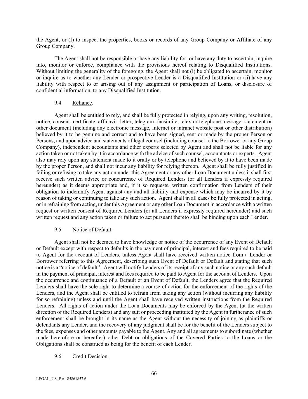 66 LEGAL_US_E # 185861857.6 the Agent, or (f) to inspect the properties, books or records of any Group Company or Affiliate of any Group Company. The Agent shall not be responsible or have any liability for, or have any duty to ascertain, inquire into, monitor or enforce, compliance with the provisions hereof relating to Disqualified Institutions. Without limiting the generality of the foregoing, the Agent shall not (i) be obligated to ascertain, monitor or inquire as to whether any Lender or prospective Lender is a Disqualified Institution or (ii) have any liability with respect to or arising out of any assignment or participation of Loans, or disclosure of confidential information, to any Disqualified Institution. 9.4 Reliance. Agent shall be entitled to rely, and shall be fully protected in relying, upon any writing, resolution, notice, consent, certificate, affidavit, letter, telegram, facsimile, telex or telephone message, statement or other document (including any electronic message, Internet or intranet website post or other distribution) believed by it to be genuine and correct and to have been signed, sent or made by the proper Person or Persons, and upon advice and statements of legal counsel (including counsel to the Borrower or any Group Company), independent accountants and other experts selected by Agent and shall not be liable for any action taken or not taken by it in accordance with the advice of such counsel, accountants or experts. Agent also may rely upon any statement made to it orally or by telephone and believed by it to have been made by the proper Person, and shall not incur any liability for relying thereon. Agent shall be fully justified in failing or refusing to take any action under this Agreement or any other Loan Document unless it shall first receive such written advice or concurrence of Required Lenders (or all Lenders if expressly required hereunder) as it deems appropriate and, if it so requests, written confirmation from Lenders of their obligation to indemnify Agent against any and all liability and expense which may be incurred by it by reason of taking or continuing to take any such action. Agent shall in all cases be fully protected in acting, or in refraining from acting, under this Agreement or any other Loan Document in accordance with a written request or written consent of Required Lenders (or all Lenders if expressly required hereunder) and such written request and any action taken or failure to act pursuant thereto shall be binding upon each Lender. 9.5 Notice of Default. Agent shall not be deemed to have knowledge or notice of the occurrence of any Event of Default or Default except with respect to defaults in the payment of principal, interest and fees required to be paid to Agent for the account of Lenders, unless Agent shall have received written notice from a Lender or Borrower referring to this Agreement, describing such Event of Default or Default and stating that such notice is a “notice of default”. Agent will notify Lenders of its receipt of any such notice or any such default in the payment of principal, interest and fees required to be paid to Agent for the account of Lenders. Upon the occurrence and continuance of a Default or an Event of Default, the Lenders agree that the Required Lenders shall have the sole right to determine a course of action for the enforcement of the rights of the Lenders, and the Agent shall be entitled to refrain from taking any action (without incurring any liability for so refraining) unless and until the Agent shall have received written instructions from the Required Lenders. All rights of action under the Loan Documents may be enforced by the Agent (at the written direction of the Required Lenders) and any suit or proceeding instituted by the Agent in furtherance of such enforcement shall be brought in its name as the Agent without the necessity of joining as plaintiffs or defendants any Lender, and the recovery of any judgment shall be for the benefit of the Lenders subject to the fees, expenses and other amounts payable to the Agent. Any and all agreements to subordinate (whether made heretofore or hereafter) other Debt or obligations of the Covered Parties to the Loans or the Obligations shall be construed as being for the benefit of each Lender. 9.6 Credit Decision.
