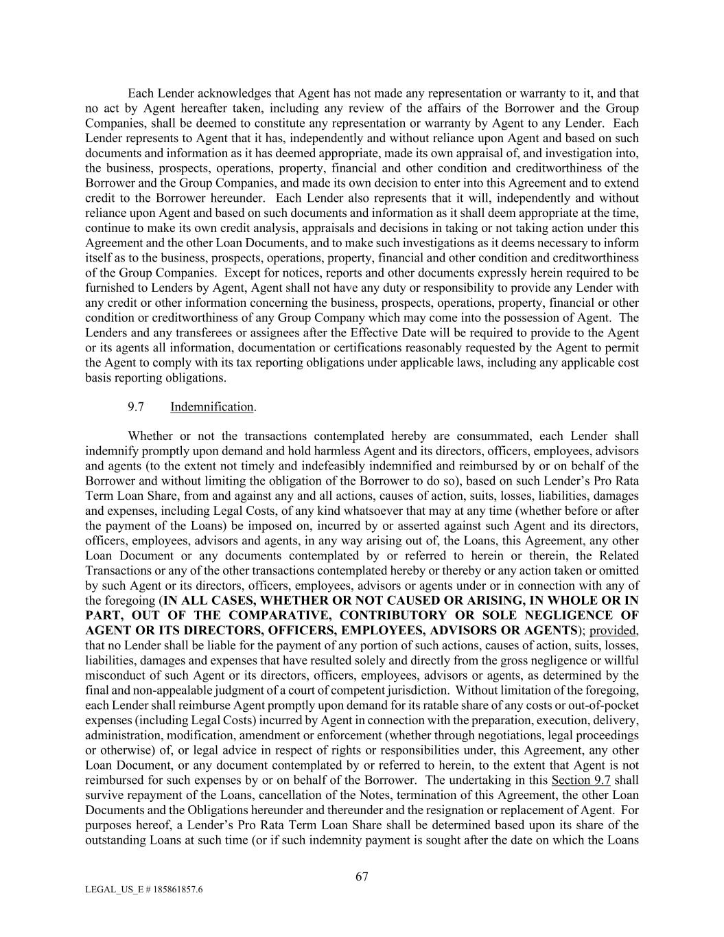 67 LEGAL_US_E # 185861857.6 Each Lender acknowledges that Agent has not made any representation or warranty to it, and that no act by Agent hereafter taken, including any review of the affairs of the Borrower and the Group Companies, shall be deemed to constitute any representation or warranty by Agent to any Lender. Each Lender represents to Agent that it has, independently and without reliance upon Agent and based on such documents and information as it has deemed appropriate, made its own appraisal of, and investigation into, the business, prospects, operations, property, financial and other condition and creditworthiness of the Borrower and the Group Companies, and made its own decision to enter into this Agreement and to extend credit to the Borrower hereunder. Each Lender also represents that it will, independently and without reliance upon Agent and based on such documents and information as it shall deem appropriate at the time, continue to make its own credit analysis, appraisals and decisions in taking or not taking action under this Agreement and the other Loan Documents, and to make such investigations as it deems necessary to inform itself as to the business, prospects, operations, property, financial and other condition and creditworthiness of the Group Companies. Except for notices, reports and other documents expressly herein required to be furnished to Lenders by Agent, Agent shall not have any duty or responsibility to provide any Lender with any credit or other information concerning the business, prospects, operations, property, financial or other condition or creditworthiness of any Group Company which may come into the possession of Agent. The Lenders and any transferees or assignees after the Effective Date will be required to provide to the Agent or its agents all information, documentation or certifications reasonably requested by the Agent to permit the Agent to comply with its tax reporting obligations under applicable laws, including any applicable cost basis reporting obligations. 9.7 Indemnification. Whether or not the transactions contemplated hereby are consummated, each Lender shall indemnify promptly upon demand and hold harmless Agent and its directors, officers, employees, advisors and agents (to the extent not timely and indefeasibly indemnified and reimbursed by or on behalf of the Borrower and without limiting the obligation of the Borrower to do so), based on such Lender’s Pro Rata Term Loan Share, from and against any and all actions, causes of action, suits, losses, liabilities, damages and expenses, including Legal Costs, of any kind whatsoever that may at any time (whether before or after the payment of the Loans) be imposed on, incurred by or asserted against such Agent and its directors, officers, employees, advisors and agents, in any way arising out of, the Loans, this Agreement, any other Loan Document or any documents contemplated by or referred to herein or therein, the Related Transactions or any of the other transactions contemplated hereby or thereby or any action taken or omitted by such Agent or its directors, officers, employees, advisors or agents under or in connection with any of the foregoing (IN ALL CASES, WHETHER OR NOT CAUSED OR ARISING, IN WHOLE OR IN PART, OUT OF THE COMPARATIVE, CONTRIBUTORY OR SOLE NEGLIGENCE OF AGENT OR ITS DIRECTORS, OFFICERS, EMPLOYEES, ADVISORS OR AGENTS); provided, that no Lender shall be liable for the payment of any portion of such actions, causes of action, suits, losses, liabilities, damages and expenses that have resulted solely and directly from the gross negligence or willful misconduct of such Agent or its directors, officers, employees, advisors or agents, as determined by the final and non-appealable judgment of a court of competent jurisdiction. Without limitation of the foregoing, each Lender shall reimburse Agent promptly upon demand for its ratable share of any costs or out-of-pocket expenses (including Legal Costs) incurred by Agent in connection with the preparation, execution, delivery, administration, modification, amendment or enforcement (whether through negotiations, legal proceedings or otherwise) of, or legal advice in respect of rights or responsibilities under, this Agreement, any other Loan Document, or any document contemplated by or referred to herein, to the extent that Agent is not reimbursed for such expenses by or on behalf of the Borrower. The undertaking in this Section 9.7 shall survive repayment of the Loans, cancellation of the Notes, termination of this Agreement, the other Loan Documents and the Obligations hereunder and thereunder and the resignation or replacement of Agent. For purposes hereof, a Lender’s Pro Rata Term Loan Share shall be determined based upon its share of the outstanding Loans at such time (or if such indemnity payment is sought after the date on which the Loans