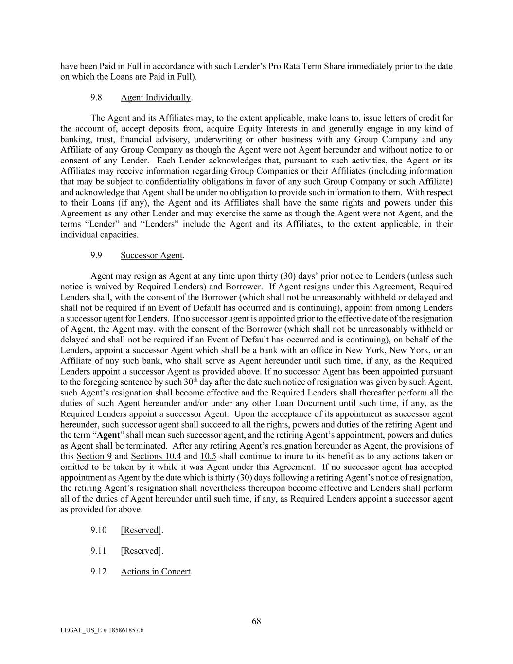 68 LEGAL_US_E # 185861857.6 have been Paid in Full in accordance with such Lender’s Pro Rata Term Share immediately prior to the date on which the Loans are Paid in Full). 9.8 Agent Individually. The Agent and its Affiliates may, to the extent applicable, make loans to, issue letters of credit for the account of, accept deposits from, acquire Equity Interests in and generally engage in any kind of banking, trust, financial advisory, underwriting or other business with any Group Company and any Affiliate of any Group Company as though the Agent were not Agent hereunder and without notice to or consent of any Lender. Each Lender acknowledges that, pursuant to such activities, the Agent or its Affiliates may receive information regarding Group Companies or their Affiliates (including information that may be subject to confidentiality obligations in favor of any such Group Company or such Affiliate) and acknowledge that Agent shall be under no obligation to provide such information to them. With respect to their Loans (if any), the Agent and its Affiliates shall have the same rights and powers under this Agreement as any other Lender and may exercise the same as though the Agent were not Agent, and the terms “Lender” and “Lenders” include the Agent and its Affiliates, to the extent applicable, in their individual capacities. 9.9 Successor Agent. Agent may resign as Agent at any time upon thirty (30) days’ prior notice to Lenders (unless such notice is waived by Required Lenders) and Borrower. If Agent resigns under this Agreement, Required Lenders shall, with the consent of the Borrower (which shall not be unreasonably withheld or delayed and shall not be required if an Event of Default has occurred and is continuing), appoint from among Lenders a successor agent for Lenders. If no successor agent is appointed prior to the effective date of the resignation of Agent, the Agent may, with the consent of the Borrower (which shall not be unreasonably withheld or delayed and shall not be required if an Event of Default has occurred and is continuing), on behalf of the Lenders, appoint a successor Agent which shall be a bank with an office in New York, New York, or an Affiliate of any such bank, who shall serve as Agent hereunder until such time, if any, as the Required Lenders appoint a successor Agent as provided above. If no successor Agent has been appointed pursuant to the foregoing sentence by such 30th day after the date such notice of resignation was given by such Agent, such Agent’s resignation shall become effective and the Required Lenders shall thereafter perform all the duties of such Agent hereunder and/or under any other Loan Document until such time, if any, as the Required Lenders appoint a successor Agent. Upon the acceptance of its appointment as successor agent hereunder, such successor agent shall succeed to all the rights, powers and duties of the retiring Agent and the term “Agent” shall mean such successor agent, and the retiring Agent’s appointment, powers and duties as Agent shall be terminated. After any retiring Agent’s resignation hereunder as Agent, the provisions of this Section 9 and Sections 10.4 and 10.5 shall continue to inure to its benefit as to any actions taken or omitted to be taken by it while it was Agent under this Agreement. If no successor agent has accepted appointment as Agent by the date which is thirty (30) days following a retiring Agent’s notice of resignation, the retiring Agent’s resignation shall nevertheless thereupon become effective and Lenders shall perform all of the duties of Agent hereunder until such time, if any, as Required Lenders appoint a successor agent as provided for above. 9.10 [Reserved]. 9.11 [Reserved]. 9.12 Actions in Concert.