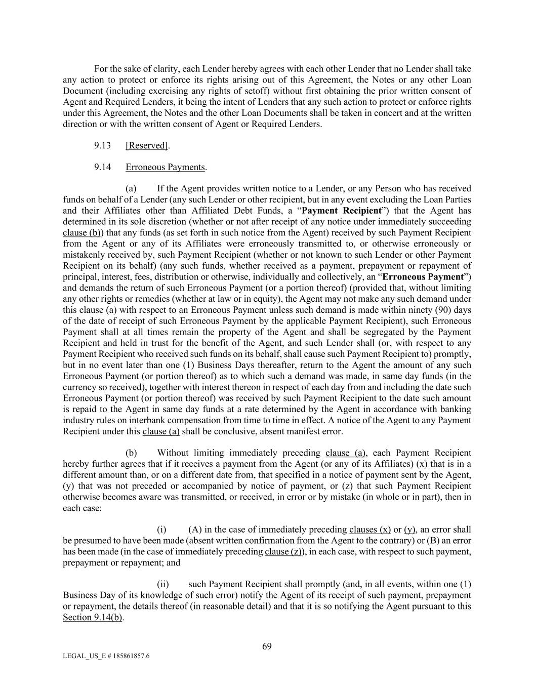 69 LEGAL_US_E # 185861857.6 For the sake of clarity, each Lender hereby agrees with each other Lender that no Lender shall take any action to protect or enforce its rights arising out of this Agreement, the Notes or any other Loan Document (including exercising any rights of setoff) without first obtaining the prior written consent of Agent and Required Lenders, it being the intent of Lenders that any such action to protect or enforce rights under this Agreement, the Notes and the other Loan Documents shall be taken in concert and at the written direction or with the written consent of Agent or Required Lenders. 9.13 [Reserved]. 9.14 Erroneous Payments. (a) If the Agent provides written notice to a Lender, or any Person who has received funds on behalf of a Lender (any such Lender or other recipient, but in any event excluding the Loan Parties and their Affiliates other than Affiliated Debt Funds, a “Payment Recipient”) that the Agent has determined in its sole discretion (whether or not after receipt of any notice under immediately succeeding clause (b)) that any funds (as set forth in such notice from the Agent) received by such Payment Recipient from the Agent or any of its Affiliates were erroneously transmitted to, or otherwise erroneously or mistakenly received by, such Payment Recipient (whether or not known to such Lender or other Payment Recipient on its behalf) (any such funds, whether received as a payment, prepayment or repayment of principal, interest, fees, distribution or otherwise, individually and collectively, an “Erroneous Payment”) and demands the return of such Erroneous Payment (or a portion thereof) (provided that, without limiting any other rights or remedies (whether at law or in equity), the Agent may not make any such demand under this clause (a) with respect to an Erroneous Payment unless such demand is made within ninety (90) days of the date of receipt of such Erroneous Payment by the applicable Payment Recipient), such Erroneous Payment shall at all times remain the property of the Agent and shall be segregated by the Payment Recipient and held in trust for the benefit of the Agent, and such Lender shall (or, with respect to any Payment Recipient who received such funds on its behalf, shall cause such Payment Recipient to) promptly, but in no event later than one (1) Business Days thereafter, return to the Agent the amount of any such Erroneous Payment (or portion thereof) as to which such a demand was made, in same day funds (in the currency so received), together with interest thereon in respect of each day from and including the date such Erroneous Payment (or portion thereof) was received by such Payment Recipient to the date such amount is repaid to the Agent in same day funds at a rate determined by the Agent in accordance with banking industry rules on interbank compensation from time to time in effect. A notice of the Agent to any Payment Recipient under this clause (a) shall be conclusive, absent manifest error. (b) Without limiting immediately preceding clause (a), each Payment Recipient hereby further agrees that if it receives a payment from the Agent (or any of its Affiliates) (x) that is in a different amount than, or on a different date from, that specified in a notice of payment sent by the Agent, (y) that was not preceded or accompanied by notice of payment, or (z) that such Payment Recipient otherwise becomes aware was transmitted, or received, in error or by mistake (in whole or in part), then in each case: (i) (A) in the case of immediately preceding clauses (x) or (y), an error shall be presumed to have been made (absent written confirmation from the Agent to the contrary) or (B) an error has been made (in the case of immediately preceding clause (z)), in each case, with respect to such payment, prepayment or repayment; and (ii) such Payment Recipient shall promptly (and, in all events, within one (1) Business Day of its knowledge of such error) notify the Agent of its receipt of such payment, prepayment or repayment, the details thereof (in reasonable detail) and that it is so notifying the Agent pursuant to this Section 9.14(b).