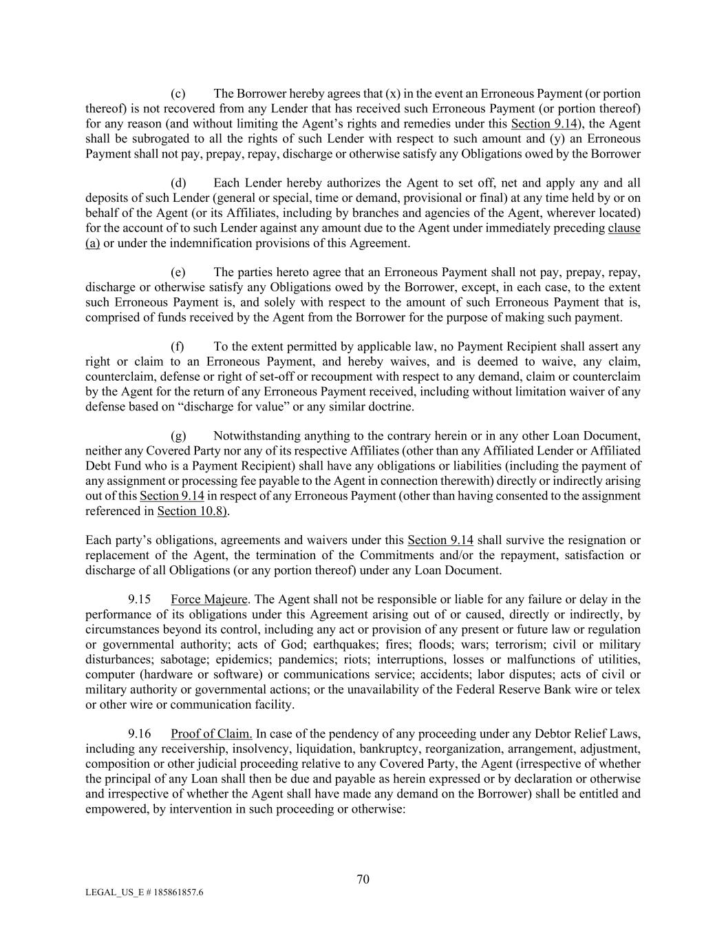 70 LEGAL_US_E # 185861857.6 (c) The Borrower hereby agrees that (x) in the event an Erroneous Payment (or portion thereof) is not recovered from any Lender that has received such Erroneous Payment (or portion thereof) for any reason (and without limiting the Agent’s rights and remedies under this Section 9.14), the Agent shall be subrogated to all the rights of such Lender with respect to such amount and (y) an Erroneous Payment shall not pay, prepay, repay, discharge or otherwise satisfy any Obligations owed by the Borrower (d) Each Lender hereby authorizes the Agent to set off, net and apply any and all deposits of such Lender (general or special, time or demand, provisional or final) at any time held by or on behalf of the Agent (or its Affiliates, including by branches and agencies of the Agent, wherever located) for the account of to such Lender against any amount due to the Agent under immediately preceding clause (a) or under the indemnification provisions of this Agreement. (e) The parties hereto agree that an Erroneous Payment shall not pay, prepay, repay, discharge or otherwise satisfy any Obligations owed by the Borrower, except, in each case, to the extent such Erroneous Payment is, and solely with respect to the amount of such Erroneous Payment that is, comprised of funds received by the Agent from the Borrower for the purpose of making such payment. (f) To the extent permitted by applicable law, no Payment Recipient shall assert any right or claim to an Erroneous Payment, and hereby waives, and is deemed to waive, any claim, counterclaim, defense or right of set-off or recoupment with respect to any demand, claim or counterclaim by the Agent for the return of any Erroneous Payment received, including without limitation waiver of any defense based on “discharge for value” or any similar doctrine. (g) Notwithstanding anything to the contrary herein or in any other Loan Document, neither any Covered Party nor any of its respective Affiliates (other than any Affiliated Lender or Affiliated Debt Fund who is a Payment Recipient) shall have any obligations or liabilities (including the payment of any assignment or processing fee payable to the Agent in connection therewith) directly or indirectly arising out of this Section 9.14 in respect of any Erroneous Payment (other than having consented to the assignment referenced in Section 10.8). Each party’s obligations, agreements and waivers under this Section 9.14 shall survive the resignation or replacement of the Agent, the termination of the Commitments and/or the repayment, satisfaction or discharge of all Obligations (or any portion thereof) under any Loan Document. 9.15 Force Majeure. The Agent shall not be responsible or liable for any failure or delay in the performance of its obligations under this Agreement arising out of or caused, directly or indirectly, by circumstances beyond its control, including any act or provision of any present or future law or regulation or governmental authority; acts of God; earthquakes; fires; floods; wars; terrorism; civil or military disturbances; sabotage; epidemics; pandemics; riots; interruptions, losses or malfunctions of utilities, computer (hardware or software) or communications service; accidents; labor disputes; acts of civil or military authority or governmental actions; or the unavailability of the Federal Reserve Bank wire or telex or other wire or communication facility. 9.16 Proof of Claim. In case of the pendency of any proceeding under any Debtor Relief Laws, including any receivership, insolvency, liquidation, bankruptcy, reorganization, arrangement, adjustment, composition or other judicial proceeding relative to any Covered Party, the Agent (irrespective of whether the principal of any Loan shall then be due and payable as herein expressed or by declaration or otherwise and irrespective of whether the Agent shall have made any demand on the Borrower) shall be entitled and empowered, by intervention in such proceeding or otherwise: