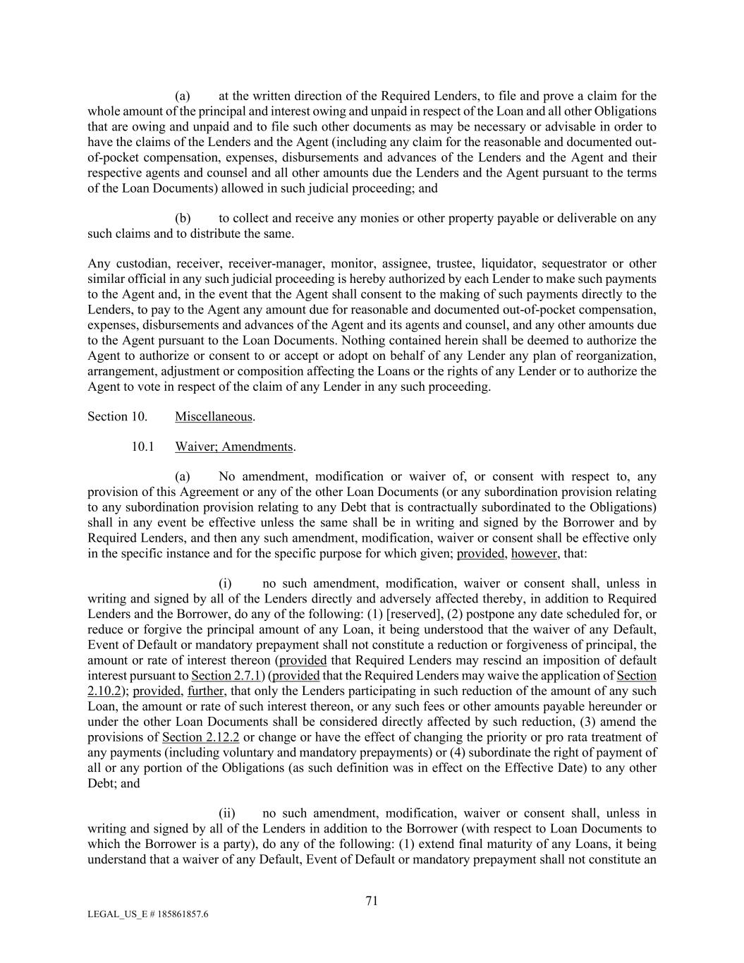 71 LEGAL_US_E # 185861857.6 (a) at the written direction of the Required Lenders, to file and prove a claim for the whole amount of the principal and interest owing and unpaid in respect of the Loan and all other Obligations that are owing and unpaid and to file such other documents as may be necessary or advisable in order to have the claims of the Lenders and the Agent (including any claim for the reasonable and documented out- of-pocket compensation, expenses, disbursements and advances of the Lenders and the Agent and their respective agents and counsel and all other amounts due the Lenders and the Agent pursuant to the terms of the Loan Documents) allowed in such judicial proceeding; and (b) to collect and receive any monies or other property payable or deliverable on any such claims and to distribute the same. Any custodian, receiver, receiver-manager, monitor, assignee, trustee, liquidator, sequestrator or other similar official in any such judicial proceeding is hereby authorized by each Lender to make such payments to the Agent and, in the event that the Agent shall consent to the making of such payments directly to the Lenders, to pay to the Agent any amount due for reasonable and documented out-of-pocket compensation, expenses, disbursements and advances of the Agent and its agents and counsel, and any other amounts due to the Agent pursuant to the Loan Documents. Nothing contained herein shall be deemed to authorize the Agent to authorize or consent to or accept or adopt on behalf of any Lender any plan of reorganization, arrangement, adjustment or composition affecting the Loans or the rights of any Lender or to authorize the Agent to vote in respect of the claim of any Lender in any such proceeding. Section 10. Miscellaneous. 10.1 Waiver; Amendments. (a) No amendment, modification or waiver of, or consent with respect to, any provision of this Agreement or any of the other Loan Documents (or any subordination provision relating to any subordination provision relating to any Debt that is contractually subordinated to the Obligations) shall in any event be effective unless the same shall be in writing and signed by the Borrower and by Required Lenders, and then any such amendment, modification, waiver or consent shall be effective only in the specific instance and for the specific purpose for which given; provided, however, that: (i) no such amendment, modification, waiver or consent shall, unless in writing and signed by all of the Lenders directly and adversely affected thereby, in addition to Required Lenders and the Borrower, do any of the following: (1) [reserved], (2) postpone any date scheduled for, or reduce or forgive the principal amount of any Loan, it being understood that the waiver of any Default, Event of Default or mandatory prepayment shall not constitute a reduction or forgiveness of principal, the amount or rate of interest thereon (provided that Required Lenders may rescind an imposition of default interest pursuant to Section 2.7.1) (provided that the Required Lenders may waive the application of Section 2.10.2); provided, further, that only the Lenders participating in such reduction of the amount of any such Loan, the amount or rate of such interest thereon, or any such fees or other amounts payable hereunder or under the other Loan Documents shall be considered directly affected by such reduction, (3) amend the provisions of Section 2.12.2 or change or have the effect of changing the priority or pro rata treatment of any payments (including voluntary and mandatory prepayments) or (4) subordinate the right of payment of all or any portion of the Obligations (as such definition was in effect on the Effective Date) to any other Debt; and (ii) no such amendment, modification, waiver or consent shall, unless in writing and signed by all of the Lenders in addition to the Borrower (with respect to Loan Documents to which the Borrower is a party), do any of the following: (1) extend final maturity of any Loans, it being understand that a waiver of any Default, Event of Default or mandatory prepayment shall not constitute an