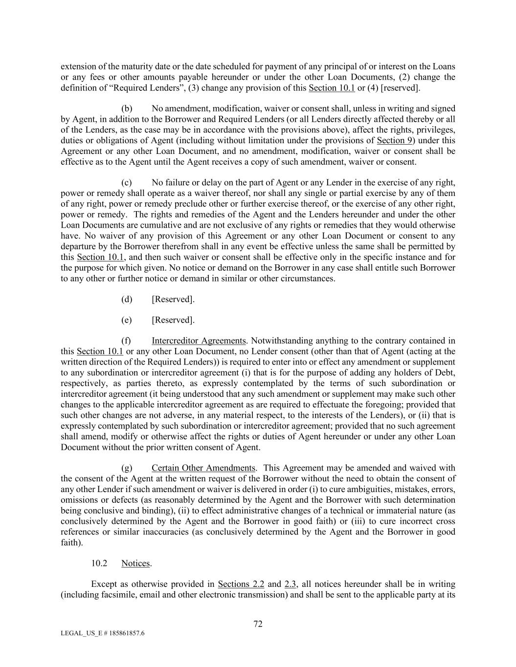 72 LEGAL_US_E # 185861857.6 extension of the maturity date or the date scheduled for payment of any principal of or interest on the Loans or any fees or other amounts payable hereunder or under the other Loan Documents, (2) change the definition of “Required Lenders”, (3) change any provision of this Section 10.1 or (4) [reserved]. (b) No amendment, modification, waiver or consent shall, unless in writing and signed by Agent, in addition to the Borrower and Required Lenders (or all Lenders directly affected thereby or all of the Lenders, as the case may be in accordance with the provisions above), affect the rights, privileges, duties or obligations of Agent (including without limitation under the provisions of Section 9) under this Agreement or any other Loan Document, and no amendment, modification, waiver or consent shall be effective as to the Agent until the Agent receives a copy of such amendment, waiver or consent. (c) No failure or delay on the part of Agent or any Lender in the exercise of any right, power or remedy shall operate as a waiver thereof, nor shall any single or partial exercise by any of them of any right, power or remedy preclude other or further exercise thereof, or the exercise of any other right, power or remedy. The rights and remedies of the Agent and the Lenders hereunder and under the other Loan Documents are cumulative and are not exclusive of any rights or remedies that they would otherwise have. No waiver of any provision of this Agreement or any other Loan Document or consent to any departure by the Borrower therefrom shall in any event be effective unless the same shall be permitted by this Section 10.1, and then such waiver or consent shall be effective only in the specific instance and for the purpose for which given. No notice or demand on the Borrower in any case shall entitle such Borrower to any other or further notice or demand in similar or other circumstances. (d) [Reserved]. (e) [Reserved]. (f) Intercreditor Agreements. Notwithstanding anything to the contrary contained in this Section 10.1 or any other Loan Document, no Lender consent (other than that of Agent (acting at the written direction of the Required Lenders)) is required to enter into or effect any amendment or supplement to any subordination or intercreditor agreement (i) that is for the purpose of adding any holders of Debt, respectively, as parties thereto, as expressly contemplated by the terms of such subordination or intercreditor agreement (it being understood that any such amendment or supplement may make such other changes to the applicable intercreditor agreement as are required to effectuate the foregoing; provided that such other changes are not adverse, in any material respect, to the interests of the Lenders), or (ii) that is expressly contemplated by such subordination or intercreditor agreement; provided that no such agreement shall amend, modify or otherwise affect the rights or duties of Agent hereunder or under any other Loan Document without the prior written consent of Agent. (g) Certain Other Amendments. This Agreement may be amended and waived with the consent of the Agent at the written request of the Borrower without the need to obtain the consent of any other Lender if such amendment or waiver is delivered in order (i) to cure ambiguities, mistakes, errors, omissions or defects (as reasonably determined by the Agent and the Borrower with such determination being conclusive and binding), (ii) to effect administrative changes of a technical or immaterial nature (as conclusively determined by the Agent and the Borrower in good faith) or (iii) to cure incorrect cross references or similar inaccuracies (as conclusively determined by the Agent and the Borrower in good faith). 10.2 Notices. Except as otherwise provided in Sections 2.2 and 2.3, all notices hereunder shall be in writing (including facsimile, email and other electronic transmission) and shall be sent to the applicable party at its