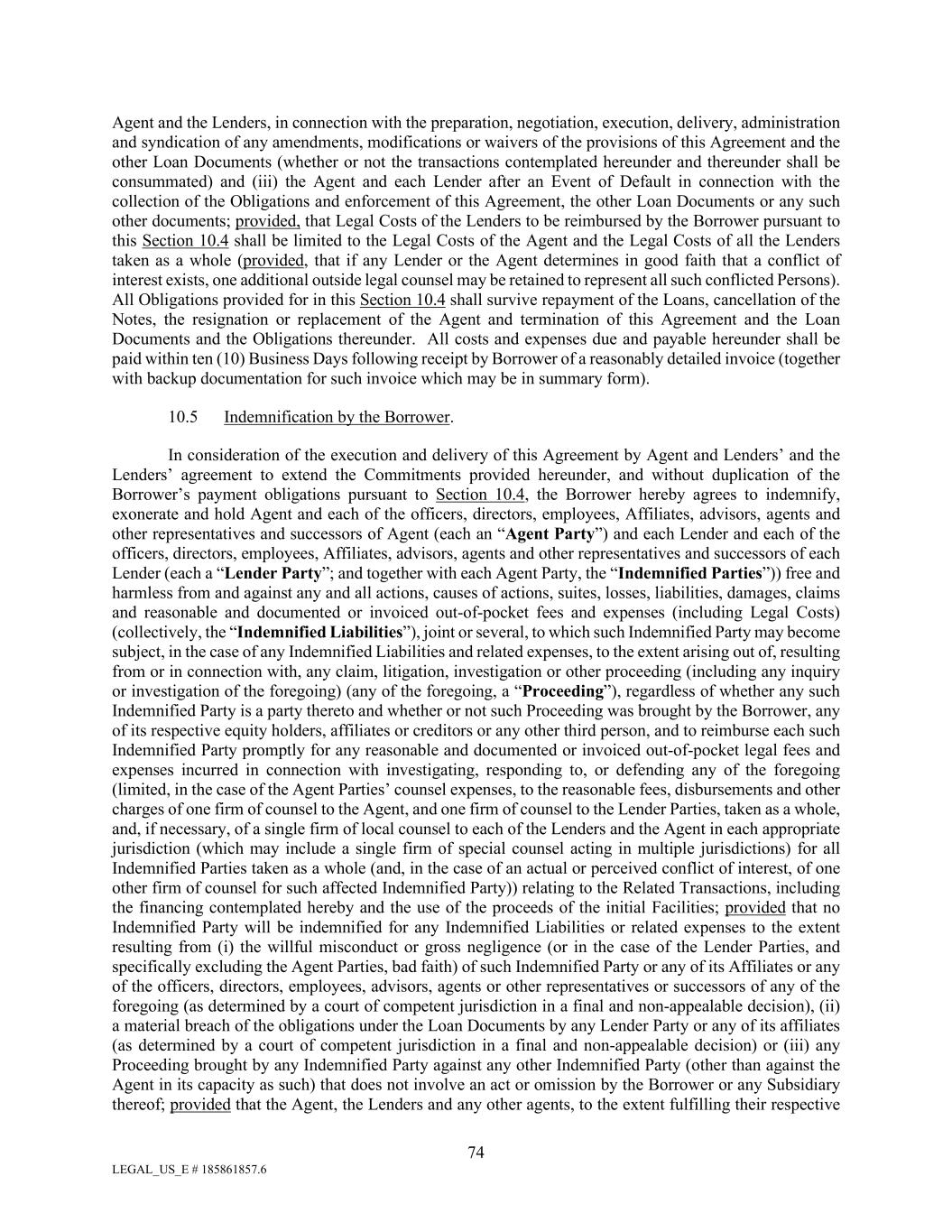 74 LEGAL_US_E # 185861857.6 Agent and the Lenders, in connection with the preparation, negotiation, execution, delivery, administration and syndication of any amendments, modifications or waivers of the provisions of this Agreement and the other Loan Documents (whether or not the transactions contemplated hereunder and thereunder shall be consummated) and (iii) the Agent and each Lender after an Event of Default in connection with the collection of the Obligations and enforcement of this Agreement, the other Loan Documents or any such other documents; provided, that Legal Costs of the Lenders to be reimbursed by the Borrower pursuant to this Section 10.4 shall be limited to the Legal Costs of the Agent and the Legal Costs of all the Lenders taken as a whole (provided, that if any Lender or the Agent determines in good faith that a conflict of interest exists, one additional outside legal counsel may be retained to represent all such conflicted Persons). All Obligations provided for in this Section 10.4 shall survive repayment of the Loans, cancellation of the Notes, the resignation or replacement of the Agent and termination of this Agreement and the Loan Documents and the Obligations thereunder. All costs and expenses due and payable hereunder shall be paid within ten (10) Business Days following receipt by Borrower of a reasonably detailed invoice (together with backup documentation for such invoice which may be in summary form). 10.5 Indemnification by the Borrower. In consideration of the execution and delivery of this Agreement by Agent and Lenders’ and the Lenders’ agreement to extend the Commitments provided hereunder, and without duplication of the Borrower’s payment obligations pursuant to Section 10.4, the Borrower hereby agrees to indemnify, exonerate and hold Agent and each of the officers, directors, employees, Affiliates, advisors, agents and other representatives and successors of Agent (each an “Agent Party”) and each Lender and each of the officers, directors, employees, Affiliates, advisors, agents and other representatives and successors of each Lender (each a “Lender Party”; and together with each Agent Party, the “Indemnified Parties”)) free and harmless from and against any and all actions, causes of actions, suites, losses, liabilities, damages, claims and reasonable and documented or invoiced out-of-pocket fees and expenses (including Legal Costs) (collectively, the “Indemnified Liabilities”), joint or several, to which such Indemnified Party may become subject, in the case of any Indemnified Liabilities and related expenses, to the extent arising out of, resulting from or in connection with, any claim, litigation, investigation or other proceeding (including any inquiry or investigation of the foregoing) (any of the foregoing, a “Proceeding”), regardless of whether any such Indemnified Party is a party thereto and whether or not such Proceeding was brought by the Borrower, any of its respective equity holders, affiliates or creditors or any other third person, and to reimburse each such Indemnified Party promptly for any reasonable and documented or invoiced out-of-pocket legal fees and expenses incurred in connection with investigating, responding to, or defending any of the foregoing (limited, in the case of the Agent Parties’ counsel expenses, to the reasonable fees, disbursements and other charges of one firm of counsel to the Agent, and one firm of counsel to the Lender Parties, taken as a whole, and, if necessary, of a single firm of local counsel to each of the Lenders and the Agent in each appropriate jurisdiction (which may include a single firm of special counsel acting in multiple jurisdictions) for all Indemnified Parties taken as a whole (and, in the case of an actual or perceived conflict of interest, of one other firm of counsel for such affected Indemnified Party)) relating to the Related Transactions, including the financing contemplated hereby and the use of the proceeds of the initial Facilities; provided that no Indemnified Party will be indemnified for any Indemnified Liabilities or related expenses to the extent resulting from (i) the willful misconduct or gross negligence (or in the case of the Lender Parties, and specifically excluding the Agent Parties, bad faith) of such Indemnified Party or any of its Affiliates or any of the officers, directors, employees, advisors, agents or other representatives or successors of any of the foregoing (as determined by a court of competent jurisdiction in a final and non-appealable decision), (ii) a material breach of the obligations under the Loan Documents by any Lender Party or any of its affiliates (as determined by a court of competent jurisdiction in a final and non-appealable decision) or (iii) any Proceeding brought by any Indemnified Party against any other Indemnified Party (other than against the Agent in its capacity as such) that does not involve an act or omission by the Borrower or any Subsidiary thereof; provided that the Agent, the Lenders and any other agents, to the extent fulfilling their respective