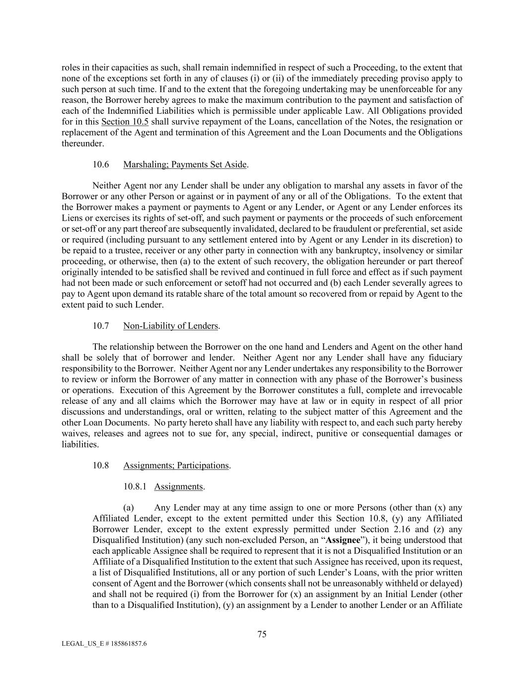 75 LEGAL_US_E # 185861857.6 roles in their capacities as such, shall remain indemnified in respect of such a Proceeding, to the extent that none of the exceptions set forth in any of clauses (i) or (ii) of the immediately preceding proviso apply to such person at such time. If and to the extent that the foregoing undertaking may be unenforceable for any reason, the Borrower hereby agrees to make the maximum contribution to the payment and satisfaction of each of the Indemnified Liabilities which is permissible under applicable Law. All Obligations provided for in this Section 10.5 shall survive repayment of the Loans, cancellation of the Notes, the resignation or replacement of the Agent and termination of this Agreement and the Loan Documents and the Obligations thereunder. 10.6 Marshaling; Payments Set Aside. Neither Agent nor any Lender shall be under any obligation to marshal any assets in favor of the Borrower or any other Person or against or in payment of any or all of the Obligations. To the extent that the Borrower makes a payment or payments to Agent or any Lender, or Agent or any Lender enforces its Liens or exercises its rights of set-off, and such payment or payments or the proceeds of such enforcement or set-off or any part thereof are subsequently invalidated, declared to be fraudulent or preferential, set aside or required (including pursuant to any settlement entered into by Agent or any Lender in its discretion) to be repaid to a trustee, receiver or any other party in connection with any bankruptcy, insolvency or similar proceeding, or otherwise, then (a) to the extent of such recovery, the obligation hereunder or part thereof originally intended to be satisfied shall be revived and continued in full force and effect as if such payment had not been made or such enforcement or setoff had not occurred and (b) each Lender severally agrees to pay to Agent upon demand its ratable share of the total amount so recovered from or repaid by Agent to the extent paid to such Lender. 10.7 Non-Liability of Lenders. The relationship between the Borrower on the one hand and Lenders and Agent on the other hand shall be solely that of borrower and lender. Neither Agent nor any Lender shall have any fiduciary responsibility to the Borrower. Neither Agent nor any Lender undertakes any responsibility to the Borrower to review or inform the Borrower of any matter in connection with any phase of the Borrower’s business or operations. Execution of this Agreement by the Borrower constitutes a full, complete and irrevocable release of any and all claims which the Borrower may have at law or in equity in respect of all prior discussions and understandings, oral or written, relating to the subject matter of this Agreement and the other Loan Documents. No party hereto shall have any liability with respect to, and each such party hereby waives, releases and agrees not to sue for, any special, indirect, punitive or consequential damages or liabilities. 10.8 Assignments; Participations. 10.8.1 Assignments. (a) Any Lender may at any time assign to one or more Persons (other than (x) any Affiliated Lender, except to the extent permitted under this Section 10.8, (y) any Affiliated Borrower Lender, except to the extent expressly permitted under Section 2.16 and (z) any Disqualified Institution) (any such non-excluded Person, an “Assignee”), it being understood that each applicable Assignee shall be required to represent that it is not a Disqualified Institution or an Affiliate of a Disqualified Institution to the extent that such Assignee has received, upon its request, a list of Disqualified Institutions, all or any portion of such Lender’s Loans, with the prior written consent of Agent and the Borrower (which consents shall not be unreasonably withheld or delayed) and shall not be required (i) from the Borrower for (x) an assignment by an Initial Lender (other than to a Disqualified Institution), (y) an assignment by a Lender to another Lender or an Affiliate