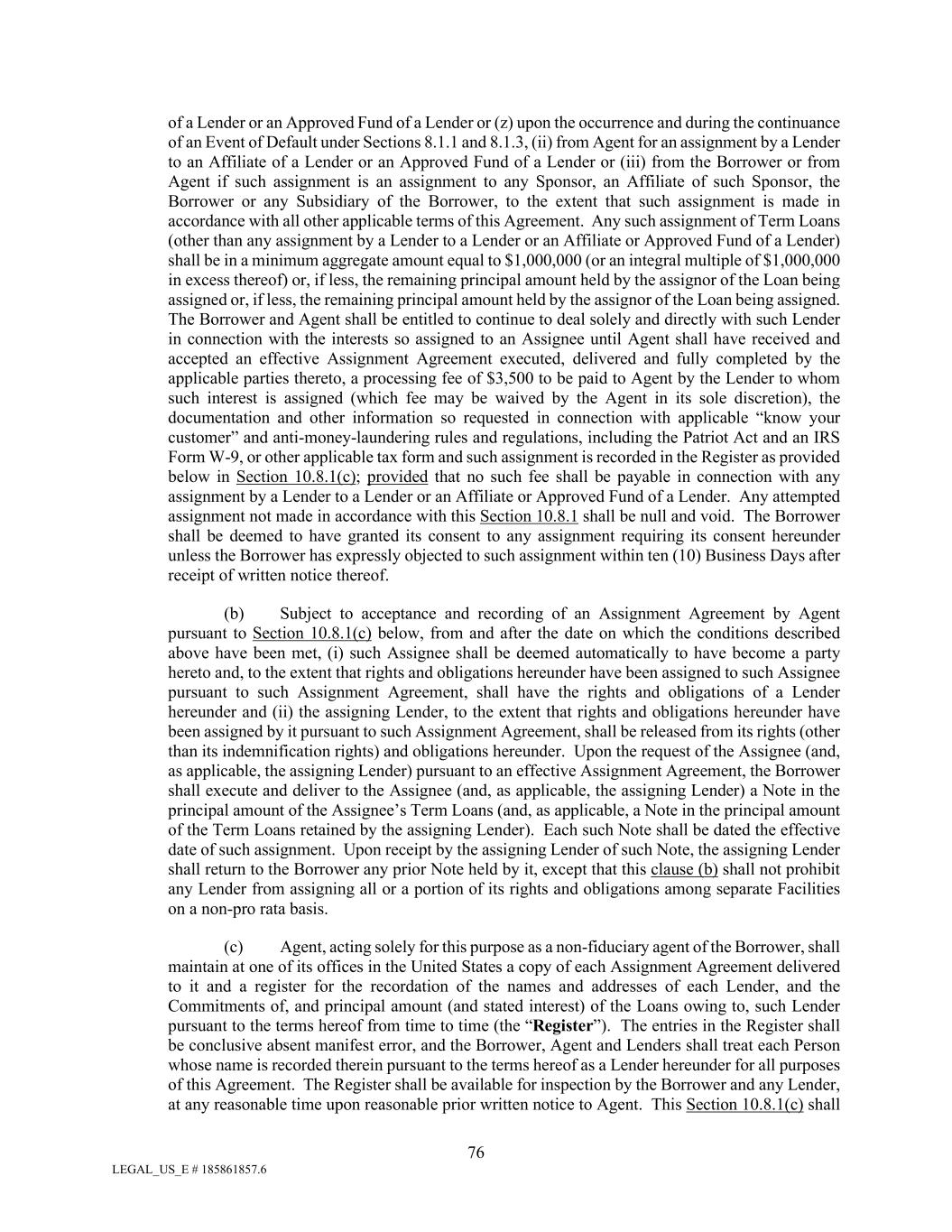 76 LEGAL_US_E # 185861857.6 of a Lender or an Approved Fund of a Lender or (z) upon the occurrence and during the continuance of an Event of Default under Sections 8.1.1 and 8.1.3, (ii) from Agent for an assignment by a Lender to an Affiliate of a Lender or an Approved Fund of a Lender or (iii) from the Borrower or from Agent if such assignment is an assignment to any Sponsor, an Affiliate of such Sponsor, the Borrower or any Subsidiary of the Borrower, to the extent that such assignment is made in accordance with all other applicable terms of this Agreement. Any such assignment of Term Loans (other than any assignment by a Lender to a Lender or an Affiliate or Approved Fund of a Lender) shall be in a minimum aggregate amount equal to $1,000,000 (or an integral multiple of $1,000,000 in excess thereof) or, if less, the remaining principal amount held by the assignor of the Loan being assigned or, if less, the remaining principal amount held by the assignor of the Loan being assigned. The Borrower and Agent shall be entitled to continue to deal solely and directly with such Lender in connection with the interests so assigned to an Assignee until Agent shall have received and accepted an effective Assignment Agreement executed, delivered and fully completed by the applicable parties thereto, a processing fee of $3,500 to be paid to Agent by the Lender to whom such interest is assigned (which fee may be waived by the Agent in its sole discretion), the documentation and other information so requested in connection with applicable “know your customer” and anti-money-laundering rules and regulations, including the Patriot Act and an IRS Form W-9, or other applicable tax form and such assignment is recorded in the Register as provided below in Section 10.8.1(c); provided that no such fee shall be payable in connection with any assignment by a Lender to a Lender or an Affiliate or Approved Fund of a Lender. Any attempted assignment not made in accordance with this Section 10.8.1 shall be null and void. The Borrower shall be deemed to have granted its consent to any assignment requiring its consent hereunder unless the Borrower has expressly objected to such assignment within ten (10) Business Days after receipt of written notice thereof. (b) Subject to acceptance and recording of an Assignment Agreement by Agent pursuant to Section 10.8.1(c) below, from and after the date on which the conditions described above have been met, (i) such Assignee shall be deemed automatically to have become a party hereto and, to the extent that rights and obligations hereunder have been assigned to such Assignee pursuant to such Assignment Agreement, shall have the rights and obligations of a Lender hereunder and (ii) the assigning Lender, to the extent that rights and obligations hereunder have been assigned by it pursuant to such Assignment Agreement, shall be released from its rights (other than its indemnification rights) and obligations hereunder. Upon the request of the Assignee (and, as applicable, the assigning Lender) pursuant to an effective Assignment Agreement, the Borrower shall execute and deliver to the Assignee (and, as applicable, the assigning Lender) a Note in the principal amount of the Assignee’s Term Loans (and, as applicable, a Note in the principal amount of the Term Loans retained by the assigning Lender). Each such Note shall be dated the effective date of such assignment. Upon receipt by the assigning Lender of such Note, the assigning Lender shall return to the Borrower any prior Note held by it, except that this clause (b) shall not prohibit any Lender from assigning all or a portion of its rights and obligations among separate Facilities on a non-pro rata basis. (c) Agent, acting solely for this purpose as a non-fiduciary agent of the Borrower, shall maintain at one of its offices in the United States a copy of each Assignment Agreement delivered to it and a register for the recordation of the names and addresses of each Lender, and the Commitments of, and principal amount (and stated interest) of the Loans owing to, such Lender pursuant to the terms hereof from time to time (the “Register”). The entries in the Register shall be conclusive absent manifest error, and the Borrower, Agent and Lenders shall treat each Person whose name is recorded therein pursuant to the terms hereof as a Lender hereunder for all purposes of this Agreement. The Register shall be available for inspection by the Borrower and any Lender, at any reasonable time upon reasonable prior written notice to Agent. This Section 10.8.1(c) shall