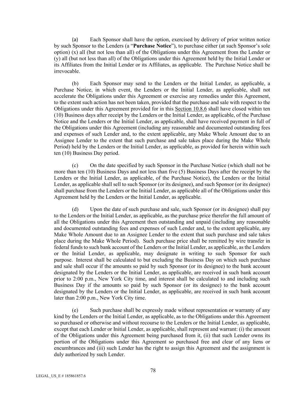 78 LEGAL_US_E # 185861857.6 (a) Each Sponsor shall have the option, exercised by delivery of prior written notice by such Sponsor to the Lenders (a “Purchase Notice”), to purchase either (at such Sponsor’s sole option) (x) all (but not less than all) of the Obligations under this Agreement from the Lender or (y) all (but not less than all) of the Obligations under this Agreement held by the Initial Lender or its Affiliates from the Initial Lender or its Affiliates, as applicable. The Purchase Notice shall be irrevocable. (b) Each Sponsor may send to the Lenders or the Initial Lender, as applicable, a Purchase Notice, in which event, the Lenders or the Initial Lender, as applicable, shall not accelerate the Obligations under this Agreement or exercise any remedies under this Agreement, to the extent such action has not been taken, provided that the purchase and sale with respect to the Obligations under this Agreement provided for in this Section 10.8.6 shall have closed within ten (10) Business days after receipt by the Lenders or the Initial Lender, as applicable, of the Purchase Notice and the Lenders or the Initial Lender, as applicable, shall have received payment in full of the Obligations under this Agreement (including any reasonable and documented outstanding fees and expenses of such Lender and, to the extent applicable, any Make Whole Amount due to an Assignee Lender to the extent that such purchase and sale takes place during the Make Whole Period) held by the Lenders or the Initial Lender, as applicable, as provided for herein within such ten (10) Business Day period. (c) On the date specified by such Sponsor in the Purchase Notice (which shall not be more than ten (10) Business Days and not less than five (5) Business Days after the receipt by the Lenders or the Initial Lender, as applicable, of the Purchase Notice), the Lenders or the Initial Lender, as applicable shall sell to such Sponsor (or its designee), and such Sponsor (or its designee) shall purchase from the Lenders or the Initial Lender, as applicable all of the Obligations under this Agreement held by the Lenders or the Initial Lender, as applicable. (d) Upon the date of such purchase and sale, such Sponsor (or its designee) shall pay to the Lenders or the Initial Lender, as applicable, as the purchase price therefor the full amount of all the Obligations under this Agreement then outstanding and unpaid (including any reasonable and documented outstanding fees and expenses of such Lender and, to the extent applicable, any Make Whole Amount due to an Assignee Lender to the extent that such purchase and sale takes place during the Make Whole Period). Such purchase price shall be remitted by wire transfer in federal funds to such bank account of the Lenders or the Initial Lender, as applicable, as the Lenders or the Initial Lender, as applicable, may designate in writing to such Sponsor for such purpose. Interest shall be calculated to but excluding the Business Day on which such purchase and sale shall occur if the amounts so paid by such Sponsor (or its designee) to the bank account designated by the Lenders or the Initial Lender, as applicable, are received in such bank account prior to 2:00 p.m., New York City time, and interest shall be calculated to and including such Business Day if the amounts so paid by such Sponsor (or its designee) to the bank account designated by the Lenders or the Initial Lender, as applicable, are received in such bank account later than 2:00 p.m., New York City time. (e) Such purchase shall be expressly made without representation or warranty of any kind by the Lenders or the Initial Lender, as applicable, as to the Obligations under this Agreement so purchased or otherwise and without recourse to the Lenders or the Initial Lender, as applicable, except that each Lender or Initial Lender, as applicable, shall represent and warrant: (i) the amount of the Obligations under this Agreement being purchased from it, (ii) that such Lender owns its portion of the Obligations under this Agreement so purchased free and clear of any liens or encumbrances and (iii) such Lender has the right to assign this Agreement and the assignment is duly authorized by such Lender.