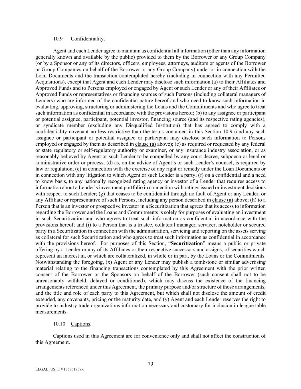 79 LEGAL_US_E # 185861857.6 10.9 Confidentiality. Agent and each Lender agree to maintain as confidential all information (other than any information generally known and available by the public) provided to them by the Borrower or any Group Company (or by a Sponsor or any of its directors, officers, employees, attorneys, auditors or agents of the Borrower or Group Companies on behalf of the Borrower or any Group Company) under or in connection with the Loan Documents and the transaction contemplated hereby (including in connection with any Permitted Acquisitions), except that Agent and each Lender may disclose such information (a) to their Affiliates and Approved Funds and to Persons employed or engaged by Agent or such Lender or any of their Affiliates or Approved Funds or representatives or financing sources of such Persons (including collateral managers of Lenders) who are informed of the confidential nature hereof and who need to know such information in evaluating, approving, structuring or administering the Loans and the Commitments and who agree to treat such information as confidential in accordance with the provisions hereof; (b) to any assignee or participant or potential assignee, participant, potential investor, financing source (and its respective rating agencies), or syndicate member (excluding any Disqualified Institution) that has agreed to comply with a confidentiality covenant no less restrictive than the terms contained in this Section 10.9 (and any such assignee or participant or potential assignee or participant may disclose such information to Persons employed or engaged by them as described in clause (a) above); (c) as required or requested by any federal or state regulatory or self-regulatory authority or examiner, or any insurance industry association, or as reasonably believed by Agent or such Lender to be compelled by any court decree, subpoena or legal or administrative order or process; (d) as, on the advice of Agent’s or such Lender’s counsel, is required by law or regulation; (e) in connection with the exercise of any right or remedy under the Loan Documents or in connection with any litigation to which Agent or such Lender is a party; (f) on a confidential and a need to know basis, to any nationally recognized rating agency or investor of a Lender that requires access to information about a Lender’s investment portfolio in connection with ratings issued or investment decisions with respect to such Lender; (g) that ceases to be confidential through no fault of Agent or any Lender, or any Affiliate or representative of such Persons, including any person described in clause (a) above; (h) to a Person that is an investor or prospective investor in a Securitization that agrees that its access to information regarding the Borrower and the Loans and Commitments is solely for purposes of evaluating an investment in such Securitization and who agrees to treat such information as confidential in accordance with the provisions hereof; and (i) to a Person that is a trustee, collateral manager, servicer, noteholder or secured party in a Securitization in connection with the administration, servicing and reporting on the assets serving as collateral for such Securitization and who agrees to treat such information as confidential in accordance with the provisions hereof. For purposes of this Section, “Securitization” means a public or private offering by a Lender or any of its Affiliates or their respective successors and assigns, of securities which represent an interest in, or which are collateralized, in whole or in part, by the Loans or the Commitments. Notwithstanding the foregoing, (x) Agent or any Lender may publish a tombstone or similar advertising material relating to the financing transactions contemplated by this Agreement with the prior written consent of the Borrower or the Sponsors on behalf of the Borrower (such consent shall not to be unreasonably withheld, delayed or conditioned), which may discuss the existence of the financing arrangements referenced under this Agreement, the primary purpose and/or structure of those arrangements, and the title and role of each party to this Agreement, but which shall not disclose the amount of credit extended, any covenants, pricing or the maturity date, and (y) Agent and each Lender reserves the right to provide to industry trade organizations information necessary and customary for inclusion in league table measurements. 10.10 Captions. Captions used in this Agreement are for convenience only and shall not affect the construction of this Agreement.