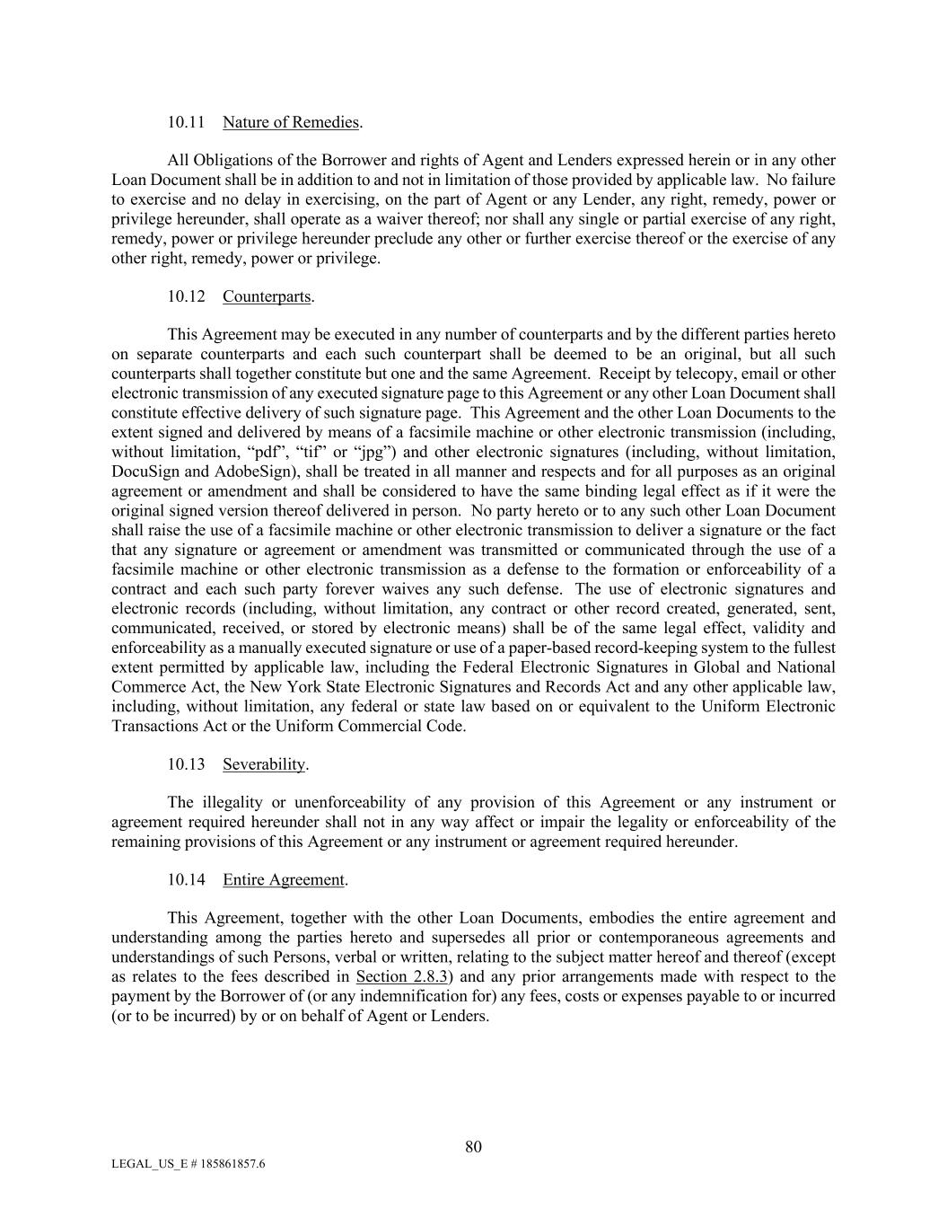 80 LEGAL_US_E # 185861857.6 10.11 Nature of Remedies. All Obligations of the Borrower and rights of Agent and Lenders expressed herein or in any other Loan Document shall be in addition to and not in limitation of those provided by applicable law. No failure to exercise and no delay in exercising, on the part of Agent or any Lender, any right, remedy, power or privilege hereunder, shall operate as a waiver thereof; nor shall any single or partial exercise of any right, remedy, power or privilege hereunder preclude any other or further exercise thereof or the exercise of any other right, remedy, power or privilege. 10.12 Counterparts. This Agreement may be executed in any number of counterparts and by the different parties hereto on separate counterparts and each such counterpart shall be deemed to be an original, but all such counterparts shall together constitute but one and the same Agreement. Receipt by telecopy, email or other electronic transmission of any executed signature page to this Agreement or any other Loan Document shall constitute effective delivery of such signature page. This Agreement and the other Loan Documents to the extent signed and delivered by means of a facsimile machine or other electronic transmission (including, without limitation, “pdf”, “tif” or “jpg”) and other electronic signatures (including, without limitation, DocuSign and AdobeSign), shall be treated in all manner and respects and for all purposes as an original agreement or amendment and shall be considered to have the same binding legal effect as if it were the original signed version thereof delivered in person. No party hereto or to any such other Loan Document shall raise the use of a facsimile machine or other electronic transmission to deliver a signature or the fact that any signature or agreement or amendment was transmitted or communicated through the use of a facsimile machine or other electronic transmission as a defense to the formation or enforceability of a contract and each such party forever waives any such defense. The use of electronic signatures and electronic records (including, without limitation, any contract or other record created, generated, sent, communicated, received, or stored by electronic means) shall be of the same legal effect, validity and enforceability as a manually executed signature or use of a paper-based record-keeping system to the fullest extent permitted by applicable law, including the Federal Electronic Signatures in Global and National Commerce Act, the New York State Electronic Signatures and Records Act and any other applicable law, including, without limitation, any federal or state law based on or equivalent to the Uniform Electronic Transactions Act or the Uniform Commercial Code. 10.13 Severability. The illegality or unenforceability of any provision of this Agreement or any instrument or agreement required hereunder shall not in any way affect or impair the legality or enforceability of the remaining provisions of this Agreement or any instrument or agreement required hereunder. 10.14 Entire Agreement. This Agreement, together with the other Loan Documents, embodies the entire agreement and understanding among the parties hereto and supersedes all prior or contemporaneous agreements and understandings of such Persons, verbal or written, relating to the subject matter hereof and thereof (except as relates to the fees described in Section 2.8.3) and any prior arrangements made with respect to the payment by the Borrower of (or any indemnification for) any fees, costs or expenses payable to or incurred (or to be incurred) by or on behalf of Agent or Lenders.
