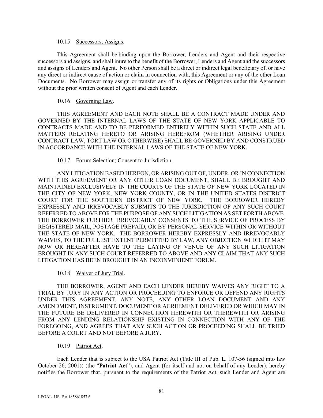 81 LEGAL_US_E # 185861857.6 10.15 Successors; Assigns. This Agreement shall be binding upon the Borrower, Lenders and Agent and their respective successors and assigns, and shall inure to the benefit of the Borrower, Lenders and Agent and the successors and assigns of Lenders and Agent. No other Person shall be a direct or indirect legal beneficiary of, or have any direct or indirect cause of action or claim in connection with, this Agreement or any of the other Loan Documents. No Borrower may assign or transfer any of its rights or Obligations under this Agreement without the prior written consent of Agent and each Lender. 10.16 Governing Law. THIS AGREEMENT AND EACH NOTE SHALL BE A CONTRACT MADE UNDER AND GOVERNED BY THE INTERNAL LAWS OF THE STATE OF NEW YORK APPLICABLE TO CONTRACTS MADE AND TO BE PERFORMED ENTIRELY WITHIN SUCH STATE AND ALL MATTERS RELATING HERETO OR ARISING HEREFROM (WHETHER ARISING UNDER CONTRACT LAW, TORT LAW OR OTHERWISE) SHALL BE GOVERNED BY AND CONSTRUED IN ACCORDANCE WITH THE INTERNAL LAWS OF THE STATE OF NEW YORK. 10.17 Forum Selection; Consent to Jurisdiction. ANY LITIGATION BASED HEREON, OR ARISING OUT OF, UNDER, OR IN CONNECTION WITH THIS AGREEMENT OR ANY OTHER LOAN DOCUMENT, SHALL BE BROUGHT AND MAINTAINED EXCLUSIVELY IN THE COURTS OF THE STATE OF NEW YORK LOCATED IN THE CITY OF NEW YORK, NEW YORK COUNTY, OR IN THE UNITED STATES DISTRICT COURT FOR THE SOUTHERN DISTRICT OF NEW YORK. THE BORROWER HEREBY EXPRESSLY AND IRREVOCABLY SUBMITS TO THE JURISDICTION OF ANY SUCH COURT REFERRED TO ABOVE FOR THE PURPOSE OF ANY SUCH LITIGATION AS SET FORTH ABOVE. THE BORROWER FURTHER IRREVOCABLY CONSENTS TO THE SERVICE OF PROCESS BY REGISTERED MAIL, POSTAGE PREPAID, OR BY PERSONAL SERVICE WITHIN OR WITHOUT THE STATE OF NEW YORK. THE BORROWER HEREBY EXPRESSLY AND IRREVOCABLY WAIVES, TO THE FULLEST EXTENT PERMITTED BY LAW, ANY OBJECTION WHICH IT MAY NOW OR HEREAFTER HAVE TO THE LAYING OF VENUE OF ANY SUCH LITIGATION BROUGHT IN ANY SUCH COURT REFERRED TO ABOVE AND ANY CLAIM THAT ANY SUCH LITIGATION HAS BEEN BROUGHT IN AN INCONVENIENT FORUM. 10.18 Waiver of Jury Trial. THE BORROWER, AGENT AND EACH LENDER HEREBY WAIVES ANY RIGHT TO A TRIAL BY JURY IN ANY ACTION OR PROCEEDING TO ENFORCE OR DEFEND ANY RIGHTS UNDER THIS AGREEMENT, ANY NOTE, ANY OTHER LOAN DOCUMENT AND ANY AMENDMENT, INSTRUMENT, DOCUMENT OR AGREEMENT DELIVERED OR WHICH MAY IN THE FUTURE BE DELIVERED IN CONNECTION HEREWITH OR THEREWITH OR ARISING FROM ANY LENDING RELATIONSHIP EXISTING IN CONNECTION WITH ANY OF THE FOREGOING, AND AGREES THAT ANY SUCH ACTION OR PROCEEDING SHALL BE TRIED BEFORE A COURT AND NOT BEFORE A JURY. 10.19 Patriot Act. Each Lender that is subject to the USA Patriot Act (Title III of Pub. L. 107-56 (signed into law October 26, 2001)) (the “Patriot Act”), and Agent (for itself and not on behalf of any Lender), hereby notifies the Borrower that, pursuant to the requirements of the Patriot Act, such Lender and Agent are