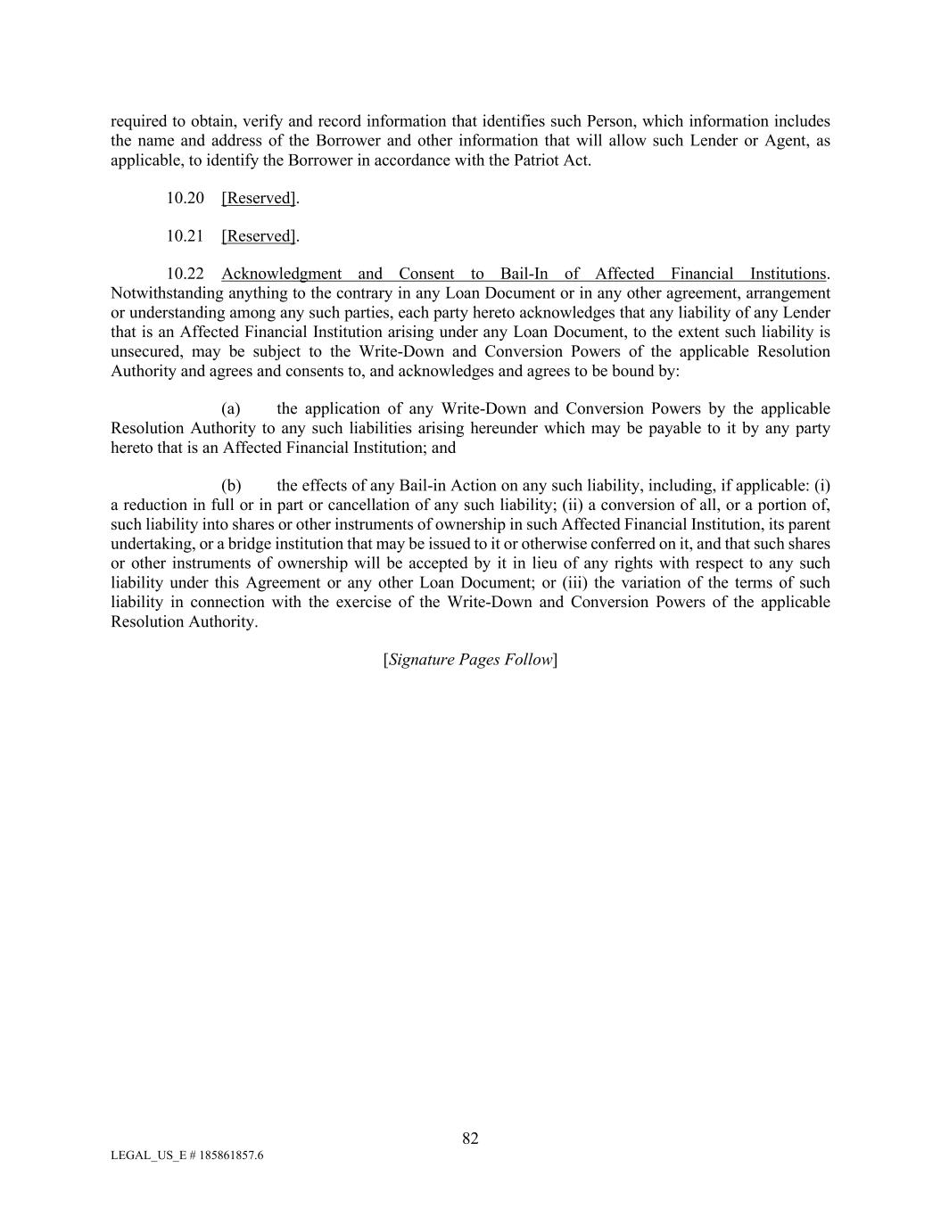 82 LEGAL_US_E # 185861857.6 required to obtain, verify and record information that identifies such Person, which information includes the name and address of the Borrower and other information that will allow such Lender or Agent, as applicable, to identify the Borrower in accordance with the Patriot Act. 10.20 [Reserved]. 10.21 [Reserved]. 10.22 Acknowledgment and Consent to Bail-In of Affected Financial Institutions. Notwithstanding anything to the contrary in any Loan Document or in any other agreement, arrangement or understanding among any such parties, each party hereto acknowledges that any liability of any Lender that is an Affected Financial Institution arising under any Loan Document, to the extent such liability is unsecured, may be subject to the Write-Down and Conversion Powers of the applicable Resolution Authority and agrees and consents to, and acknowledges and agrees to be bound by: (a) the application of any Write-Down and Conversion Powers by the applicable Resolution Authority to any such liabilities arising hereunder which may be payable to it by any party hereto that is an Affected Financial Institution; and (b) the effects of any Bail-in Action on any such liability, including, if applicable: (i) a reduction in full or in part or cancellation of any such liability; (ii) a conversion of all, or a portion of, such liability into shares or other instruments of ownership in such Affected Financial Institution, its parent undertaking, or a bridge institution that may be issued to it or otherwise conferred on it, and that such shares or other instruments of ownership will be accepted by it in lieu of any rights with respect to any such liability under this Agreement or any other Loan Document; or (iii) the variation of the terms of such liability in connection with the exercise of the Write-Down and Conversion Powers of the applicable Resolution Authority. [Signature Pages Follow]