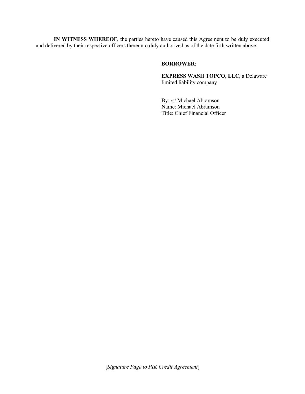 [Signature Page to PIK Credit Agreement] IN WITNESS WHEREOF, the parties hereto have caused this Agreement to be duly executed and delivered by their respective officers thereunto duly authorized as of the date firth written above. BORROWER: EXPRESS WASH TOPCO, LLC, a Delaware limited liability company By: /s/ Michael Abramson Name: Michael Abramson Title: Chief Financial Officer