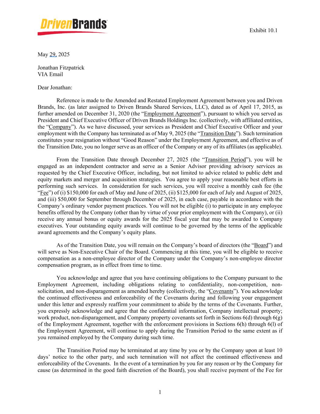 1 May 29, 2025 Jonathan Fitzpatrick VIA Email Dear Jonathan: Reference is made to the Amended and Restated Employment Agreement between you and Driven Brands, Inc. (as later assigned to Driven Brands Shared Services, LLC), dated as of April 17, 2015, as further amended on December 31, 2020 (the “Employment Agreement”), pursuant to which you served as President and Chief Executive Officer of Driven Brands Holdings Inc. (collectively, with affiliated entities, the “Company”). As we have discussed, your services as President and Chief Executive Officer and your employment with the Company has terminated as of May 9, 2025 (the “Transition Date”). Such termination constitutes your resignation without “Good Reason” under the Employment Agreement, and effective as of the Transition Date, you no longer serve as an officer of the Company or any of its affiliates (as applicable). From the Transition Date through December 27, 2025 (the “Transition Period”), you will be engaged as an independent contractor and serve as a Senior Advisor providing advisory services as requested by the Chief Executive Officer, including, but not limited to advice related to public debt and equity markets and merger and acquisition strategies. You agree to apply your reasonable best efforts in performing such services. In consideration for such services, you will receive a monthly cash fee (the “Fee”) of (i) $150,000 for each of May and June of 2025, (ii) $125,000 for each of July and August of 2025, and (iii) $50,000 for September through December of 2025, in each case, payable in accordance with the Company’s ordinary vendor payment practices. You will not be eligible (i) to participate in any employee benefits offered by the Company (other than by virtue of your prior employment with the Company), or (ii) receive any annual bonus or equity awards for the 2025 fiscal year that may be awarded to Company executives. Your outstanding equity awards will continue to be governed by the terms of the applicable award agreements and the Company’s equity plans. As of the Transition Date, you will remain on the Company’s board of directors (the “Board”) and will serve as Non-Executive Chair of the Board. Commencing at this time, you will be eligible to receive compensation as a non-employee director of the Company under the Company’s non-employee director compensation program, as in effect from time to time. You acknowledge and agree that you have continuing obligations to the Company pursuant to the Employment Agreement, including obligations relating to confidentiality, non-competition, non- solicitation, and non-disparagement as amended hereby (collectively, the “Covenants”). You acknowledge the continued effectiveness and enforceability of the Covenants during and following your engagement under this letter and expressly reaffirm your commitment to abide by the terms of the Covenants. Further, you expressly acknowledge and agree that the confidential information, Company intellectual property; work product, non-disparagement, and Company property covenants set forth in Sections 6(d) through 6(g) of the Employment Agreement, together with the enforcement provisions in Sections 6(h) through 6(l) of the Employment Agreement, will continue to apply during the Transition Period to the same extent as if you remained employed by the Company during such time. The Transition Period may be terminated at any time by you or by the Company upon at least 10 days’ notice to the other party, and such termination will not affect the continued effectiveness and enforceability of the Covenants. In the event of a termination by you for any reason or by the Company for cause (as determined in the good faith discretion of the Board), you shall receive payment of the Fee for Exhibit 10.1