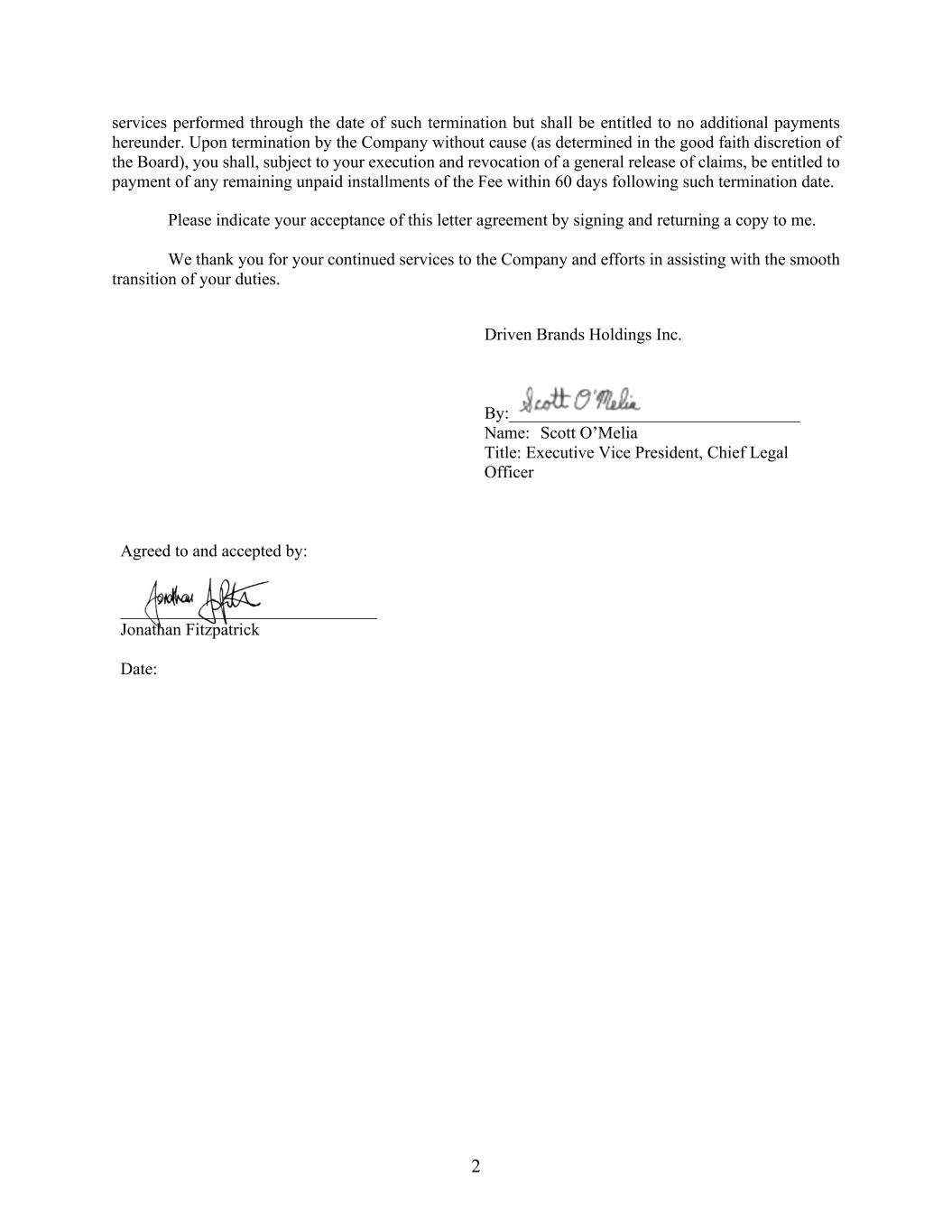 2 services performed through the date of such termination but shall be entitled to no additional payments hereunder. Upon termination by the Company without cause (as determined in the good faith discretion of the Board), you shall, subject to your execution and revocation of a general release of claims, be entitled to payment of any remaining unpaid installments of the Fee within 60 days following such termination date. Please indicate your acceptance of this letter agreement by signing and returning a copy to me. We thank you for your continued services to the Company and efforts in assisting with the smooth transition of your duties. Driven Brands Holdings Inc. By:__________________________________ Name: Scott O’Melia Title: Executive Vice President, Chief Legal Officer Agreed to and accepted by: ______________________________ Jonathan Fitzpatrick Date: