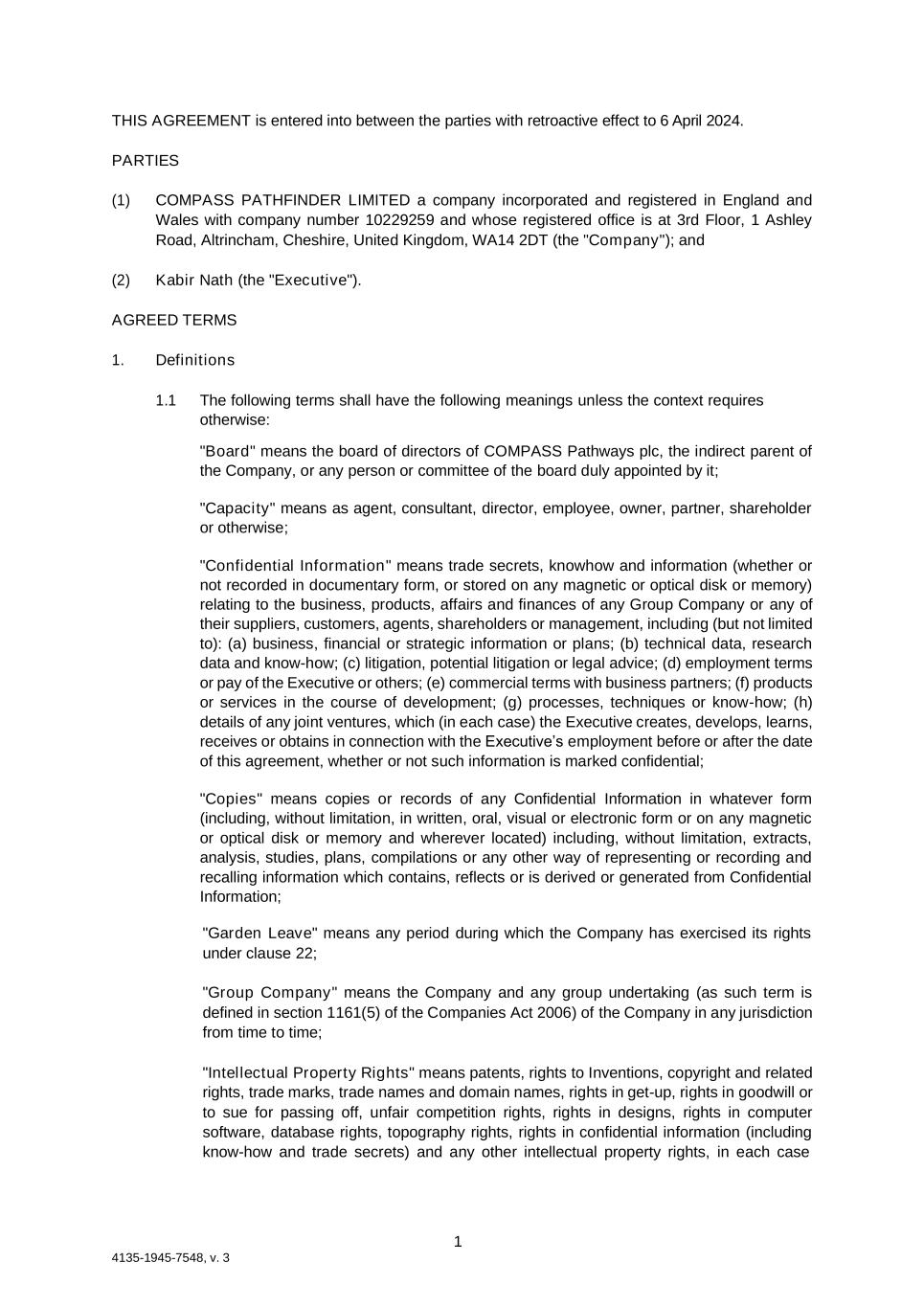 1 4135-1945-7548, v. 3 THIS AGREEMENT is entered into between the parties with retroactive effect to 6 April 2024. PARTIES (1) COMPASS PATHFINDER LIMITED a company incorporated and registered in England and Wales with company number 10229259 and whose registered office is at 3rd Floor, 1 Ashley Road, Altrincham, Cheshire, United Kingdom, WA14 2DT (the "Company"); and (2) Kabir Nath (the "Executive"). AGREED TERMS 1. Definitions 1.1 The following terms shall have the following meanings unless the context requires otherwise: "Board" means the board of directors of COMPASS Pathways plc, the indirect parent of the Company, or any person or committee of the board duly appointed by it; "Capacity" means as agent, consultant, director, employee, owner, partner, shareholder or otherwise; "Confidential Information" means trade secrets, knowhow and information (whether or not recorded in documentary form, or stored on any magnetic or optical disk or memory) relating to the business, products, affairs and finances of any Group Company or any of their suppliers, customers, agents, shareholders or management, including (but not limited to): (a) business, financial or strategic information or plans; (b) technical data, research data and know-how; (c) litigation, potential litigation or legal advice; (d) employment terms or pay of the Executive or others; (e) commercial terms with business partners; (f) products or services in the course of development; (g) processes, techniques or know-how; (h) details of any joint ventures, which (in each case) the Executive creates, develops, learns, receives or obtains in connection with the Executive’s employment before or after the date of this agreement, whether or not such information is marked confidential; "Copies" means copies or records of any Confidential Information in whatever form (including, without limitation, in written, oral, visual or electronic form or on any magnetic or optical disk or memory and wherever located) including, without limitation, extracts, analysis, studies, plans, compilations or any other way of representing or recording and recalling information which contains, reflects or is derived or generated from Confidential Information; "Garden Leave" means any period during which the Company has exercised its rights under clause 22; "Group Company" means the Company and any group undertaking (as such term is defined in section 1161(5) of the Companies Act 2006) of the Company in any jurisdiction from time to time; "Intellectual Property Rights" means patents, rights to Inventions, copyright and related rights, trade marks, trade names and domain names, rights in get-up, rights in goodwill or to sue for passing off, unfair competition rights, rights in designs, rights in computer software, database rights, topography rights, rights in confidential information (including know-how and trade secrets) and any other intellectual property rights, in each case