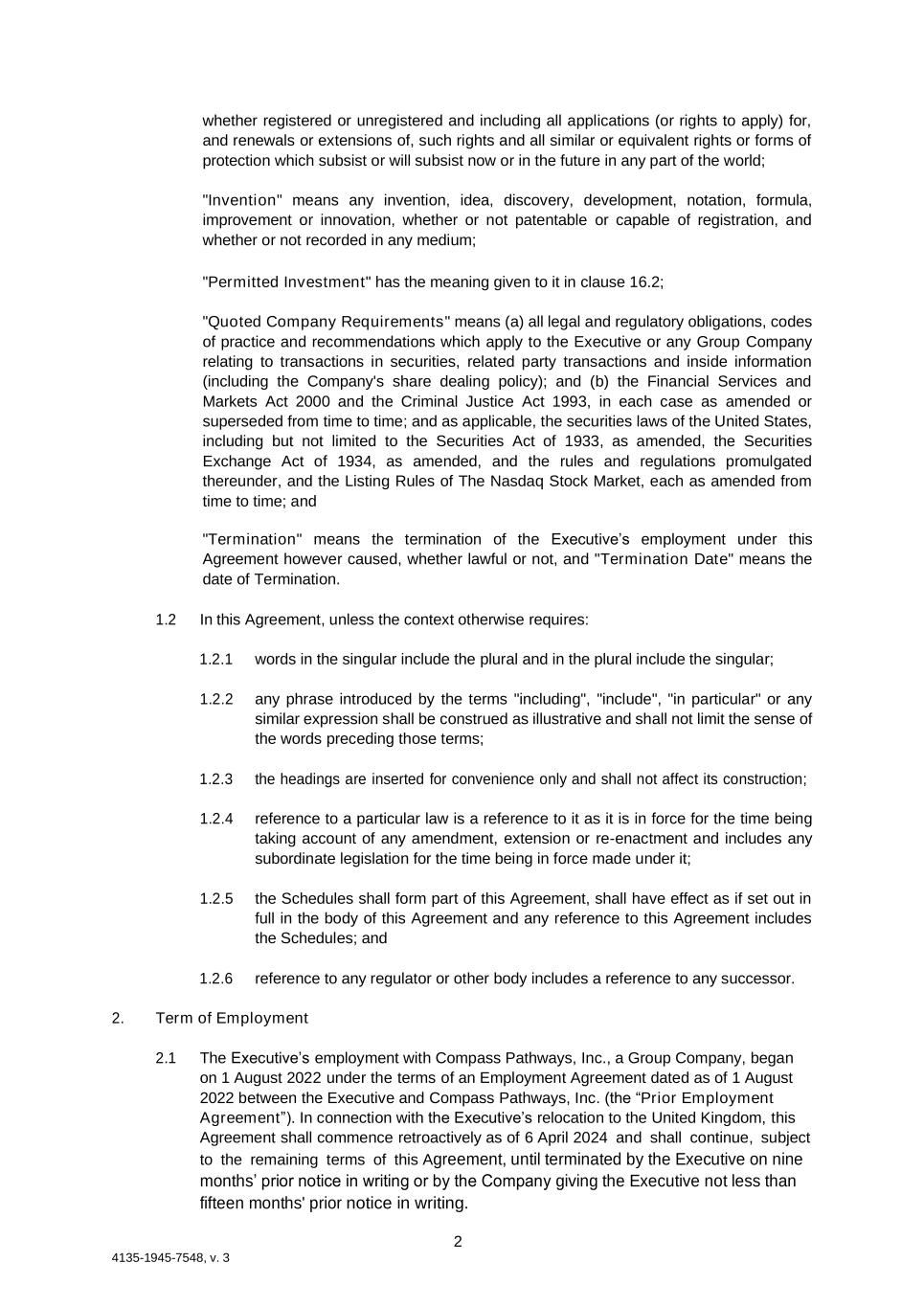 2 4135-1945-7548, v. 3 whether registered or unregistered and including all applications (or rights to apply) for, and renewals or extensions of, such rights and all similar or equivalent rights or forms of protection which subsist or will subsist now or in the future in any part of the world; "Invention" means any invention, idea, discovery, development, notation, formula, improvement or innovation, whether or not patentable or capable of registration, and whether or not recorded in any medium; "Permitted Investment" has the meaning given to it in clause 16.2; "Quoted Company Requirements" means (a) all legal and regulatory obligations, codes of practice and recommendations which apply to the Executive or any Group Company relating to transactions in securities, related party transactions and inside information (including the Company's share dealing policy); and (b) the Financial Services and Markets Act 2000 and the Criminal Justice Act 1993, in each case as amended or superseded from time to time; and as applicable, the securities laws of the United States, including but not limited to the Securities Act of 1933, as amended, the Securities Exchange Act of 1934, as amended, and the rules and regulations promulgated thereunder, and the Listing Rules of The Nasdaq Stock Market, each as amended from time to time; and "Termination" means the termination of the Executive’s employment under this Agreement however caused, whether lawful or not, and "Termination Date" means the date of Termination. 1.2 In this Agreement, unless the context otherwise requires: 1.2.1 words in the singular include the plural and in the plural include the singular; 1.2.2 any phrase introduced by the terms "including", "include", "in particular" or any similar expression shall be construed as illustrative and shall not limit the sense of the words preceding those terms; 1.2.3 the headings are inserted for convenience only and shall not affect its construction; 1.2.4 reference to a particular law is a reference to it as it is in force for the time being taking account of any amendment, extension or re-enactment and includes any subordinate legislation for the time being in force made under it; 1.2.5 the Schedules shall form part of this Agreement, shall have effect as if set out in full in the body of this Agreement and any reference to this Agreement includes the Schedules; and 1.2.6 reference to any regulator or other body includes a reference to any successor. 2. Term of Employment 2.1 The Executive’s employment with Compass Pathways, Inc., a Group Company, began on 1 August 2022 under the terms of an Employment Agreement dated as of 1 August 2022 between the Executive and Compass Pathways, Inc. (the “Prior Employment Agreement”). In connection with the Executive’s relocation to the United Kingdom, this Agreement shall commence retroactively as of 6 April 2024 and shall continue, subject to the remaining terms of this Agreement, until terminated by the Executive on nine months’ prior notice in writing or by the Company giving the Executive not less than fifteen months' prior notice in writing.