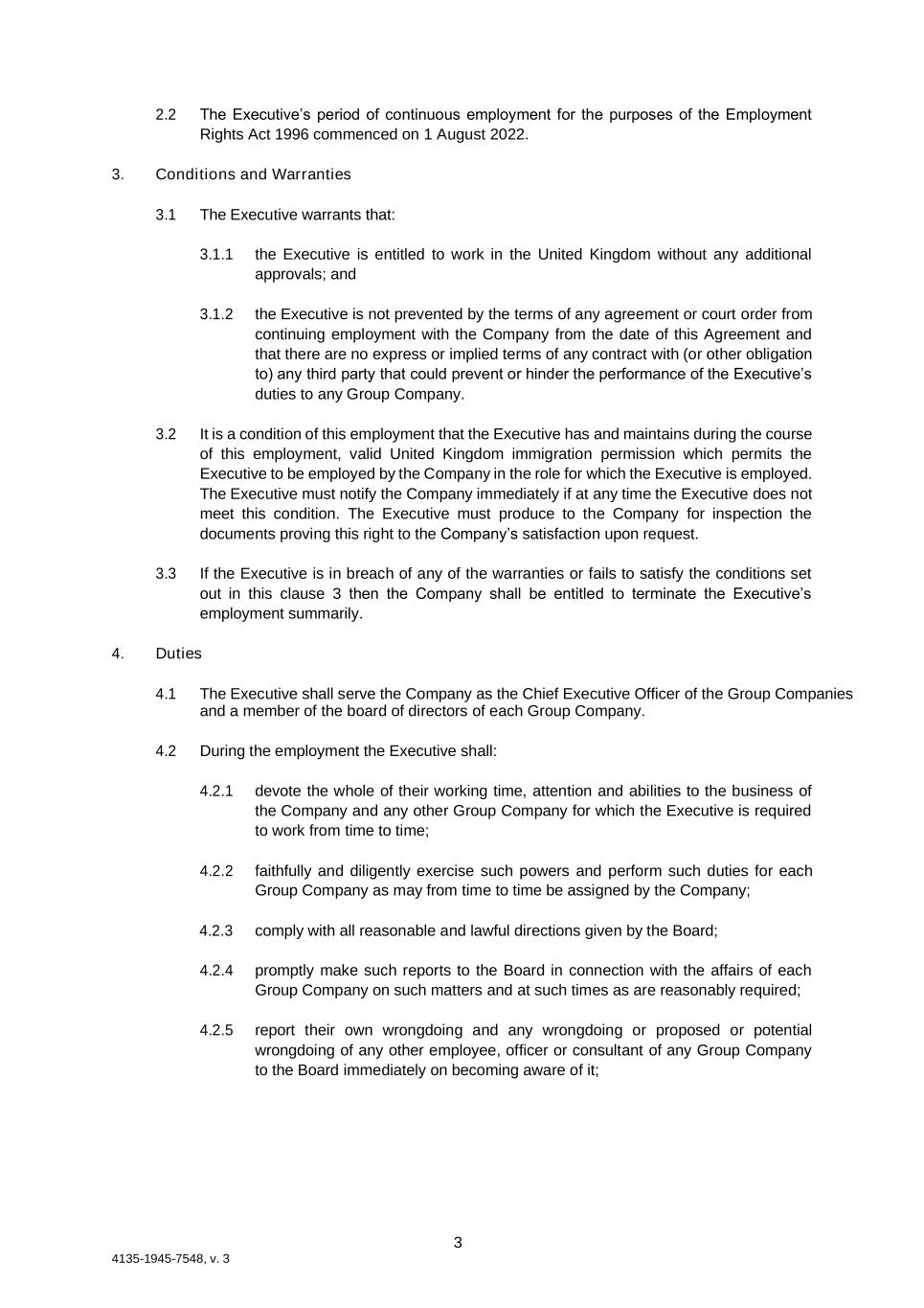 3 4135-1945-7548, v. 3 2.2 The Executive’s period of continuous employment for the purposes of the Employment Rights Act 1996 commenced on 1 August 2022. 3. Conditions and Warranties 3.1 The Executive warrants that: 3.1.1 the Executive is entitled to work in the United Kingdom without any additional approvals; and 3.1.2 the Executive is not prevented by the terms of any agreement or court order from continuing employment with the Company from the date of this Agreement and that there are no express or implied terms of any contract with (or other obligation to) any third party that could prevent or hinder the performance of the Executive’s duties to any Group Company. 3.2 It is a condition of this employment that the Executive has and maintains during the course of this employment, valid United Kingdom immigration permission which permits the Executive to be employed by the Company in the role for which the Executive is employed. The Executive must notify the Company immediately if at any time the Executive does not meet this condition. The Executive must produce to the Company for inspection the documents proving this right to the Company’s satisfaction upon request. 3.3 If the Executive is in breach of any of the warranties or fails to satisfy the conditions set out in this clause 3 then the Company shall be entitled to terminate the Executive’s employment summarily. 4. Duties 4.1 The Executive shall serve the Company as the Chief Executive Officer of the Group Companies and a member of the board of directors of each Group Company. 4.2 During the employment the Executive shall: 4.2.1 devote the whole of their working time, attention and abilities to the business of the Company and any other Group Company for which the Executive is required to work from time to time; 4.2.2 faithfully and diligently exercise such powers and perform such duties for each Group Company as may from time to time be assigned by the Company; 4.2.3 comply with all reasonable and lawful directions given by the Board; 4.2.4 promptly make such reports to the Board in connection with the affairs of each Group Company on such matters and at such times as are reasonably required; 4.2.5 report their own wrongdoing and any wrongdoing or proposed or potential wrongdoing of any other employee, officer or consultant of any Group Company to the Board immediately on becoming aware of it;