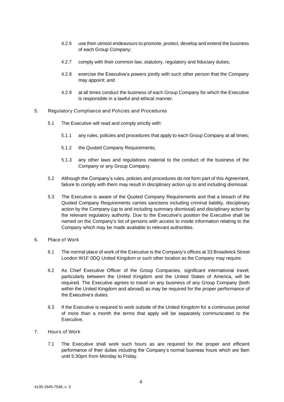 4 4135-1945-7548, v. 3 4.2.6 use their utmost endeavours to promote, protect, develop and extend the business of each Group Company; 4.2.7 comply with their common law, statutory, regulatory and fiduciary duties; 4.2.8 exercise the Executive’s powers jointly with such other person that the Company may appoint; and 4.2.9 at all times conduct the business of each Group Company for which the Executive is responsible in a lawful and ethical manner. 5. Regulatory Compliance and Policies and Procedures 5.1 The Executive will read and comply strictly with: 5.1.1 any rules, policies and procedures that apply to each Group Company at all times; 5.1.2 the Quoted Company Requirements; 5.1.3 any other laws and regulations material to the conduct of the business of the Company or any Group Company. 5.2 Although the Company’s rules, policies and procedures do not form part of this Agreement, failure to comply with them may result in disciplinary action up to and including dismissal. 5.3 The Executive is aware of the Quoted Company Requirements and that a breach of the Quoted Company Requirements carries sanctions including criminal liability, disciplinary action by the Company (up to and including summary dismissal) and disciplinary action by the relevant regulatory authority. Due to the Executive's position the Executive shall be named on the Company's list of persons with access to inside information relating to the Company which may be made available to relevant authorities. 6. Place of Work 6.1 The normal place of work of the Executive is the Company's offices at 33 Broadwick Street London W1F 0DQ United Kingdom or such other location as the Company may require. 6.2 As Chief Executive Officer of the Group Companies, significant international travel, particularly between the United Kingdom and the United States of America, will be required. The Executive agrees to travel on any business of any Group Company (both within the United Kingdom and abroad) as may be required for the proper performance of the Executive’s duties. 6.3 If the Executive is required to work outside of the United Kingdom for a continuous period of more than a month the terms that apply will be separately communicated to the Executive. 7. Hours of Work 7.1 The Executive shall work such hours as are required for the proper and efficient performance of their duties including the Company’s normal business hours which are 9am until 5:30pm from Monday to Friday.