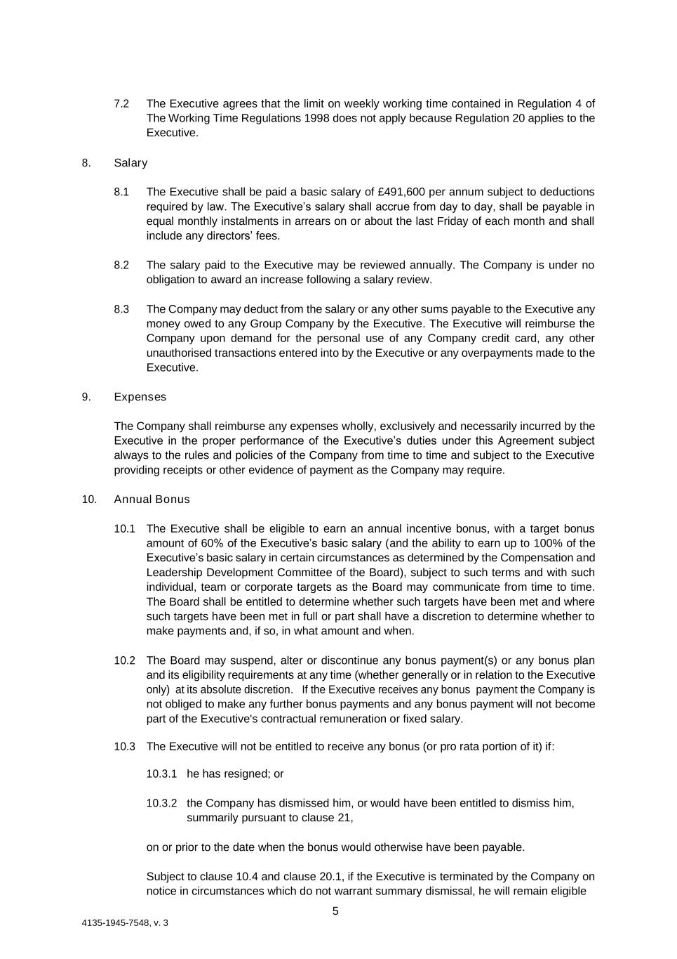 5 4135-1945-7548, v. 3 7.2 The Executive agrees that the limit on weekly working time contained in Regulation 4 of The Working Time Regulations 1998 does not apply because Regulation 20 applies to the Executive. 8. Salary 8.1 The Executive shall be paid a basic salary of £491,600 per annum subject to deductions required by law. The Executive’s salary shall accrue from day to day, shall be payable in equal monthly instalments in arrears on or about the last Friday of each month and shall include any directors’ fees. 8.2 The salary paid to the Executive may be reviewed annually. The Company is under no obligation to award an increase following a salary review. 8.3 The Company may deduct from the salary or any other sums payable to the Executive any money owed to any Group Company by the Executive. The Executive will reimburse the Company upon demand for the personal use of any Company credit card, any other unauthorised transactions entered into by the Executive or any overpayments made to the Executive. 9. Expenses The Company shall reimburse any expenses wholly, exclusively and necessarily incurred by the Executive in the proper performance of the Executive’s duties under this Agreement subject always to the rules and policies of the Company from time to time and subject to the Executive providing receipts or other evidence of payment as the Company may require. 10. Annual Bonus 10.1 The Executive shall be eligible to earn an annual incentive bonus, with a target bonus amount of 60% of the Executive’s basic salary (and the ability to earn up to 100% of the Executive’s basic salary in certain circumstances as determined by the Compensation and Leadership Development Committee of the Board), subject to such terms and with such individual, team or corporate targets as the Board may communicate from time to time. The Board shall be entitled to determine whether such targets have been met and where such targets have been met in full or part shall have a discretion to determine whether to make payments and, if so, in what amount and when. 10.2 The Board may suspend, alter or discontinue any bonus payment(s) or any bonus plan and its eligibility requirements at any time (whether generally or in relation to the Executive only) at its absolute discretion. If the Executive receives any bonus payment the Company is not obliged to make any further bonus payments and any bonus payment will not become part of the Executive's contractual remuneration or fixed salary. 10.3 The Executive will not be entitled to receive any bonus (or pro rata portion of it) if: 10.3.1 he has resigned; or 10.3.2 the Company has dismissed him, or would have been entitled to dismiss him, summarily pursuant to clause 21, on or prior to the date when the bonus would otherwise have been payable. Subject to clause 10.4 and clause 20.1, if the Executive is terminated by the Company on notice in circumstances which do not warrant summary dismissal, he will remain eligible