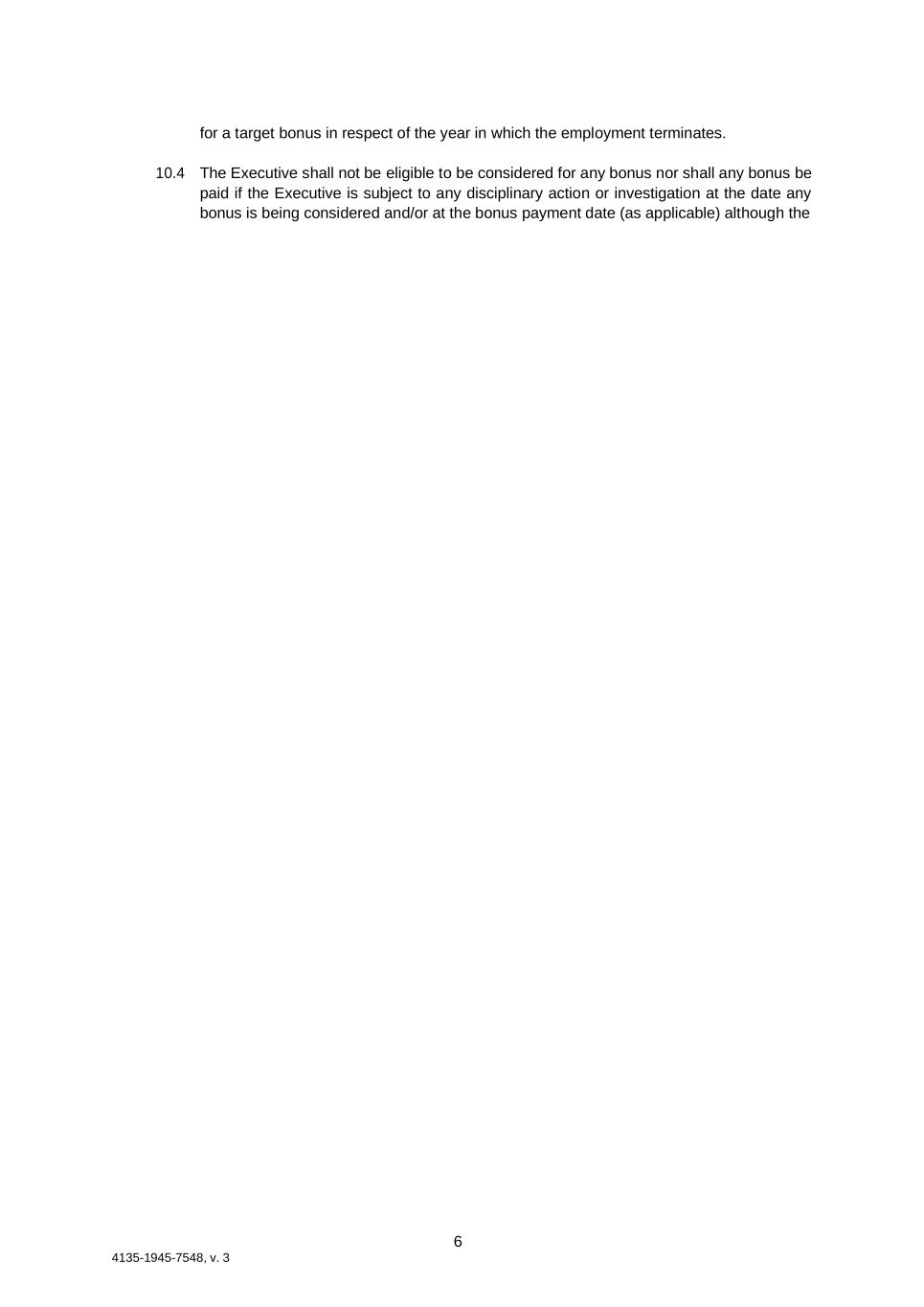 6 4135-1945-7548, v. 3 for a target bonus in respect of the year in which the employment terminates. 10.4 The Executive shall not be eligible to be considered for any bonus nor shall any bonus be paid if the Executive is subject to any disciplinary action or investigation at the date any bonus is being considered and/or at the bonus payment date (as applicable) although the