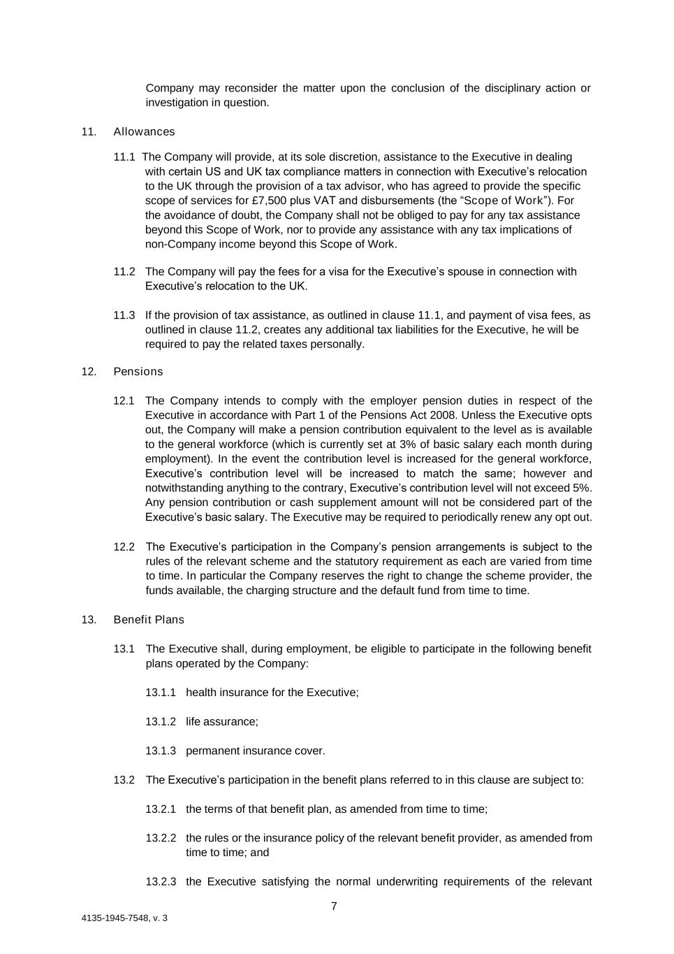 7 4135-1945-7548, v. 3 Company may reconsider the matter upon the conclusion of the disciplinary action or investigation in question. 11. Allowances 11.1 The Company will provide, at its sole discretion, assistance to the Executive in dealing with certain US and UK tax compliance matters in connection with Executive’s relocation to the UK through the provision of a tax advisor, who has agreed to provide the specific scope of services for £7,500 plus VAT and disbursements (the “Scope of Work”). For the avoidance of doubt, the Company shall not be obliged to pay for any tax assistance beyond this Scope of Work, nor to provide any assistance with any tax implications of non-Company income beyond this Scope of Work. 11.2 The Company will pay the fees for a visa for the Executive’s spouse in connection with Executive’s relocation to the UK. 11.3 If the provision of tax assistance, as outlined in clause 11.1, and payment of visa fees, as outlined in clause 11.2, creates any additional tax liabilities for the Executive, he will be required to pay the related taxes personally. 12. Pensions 12.1 The Company intends to comply with the employer pension duties in respect of the Executive in accordance with Part 1 of the Pensions Act 2008. Unless the Executive opts out, the Company will make a pension contribution equivalent to the level as is available to the general workforce (which is currently set at 3% of basic salary each month during employment). In the event the contribution level is increased for the general workforce, Executive’s contribution level will be increased to match the same; however and notwithstanding anything to the contrary, Executive’s contribution level will not exceed 5%. Any pension contribution or cash supplement amount will not be considered part of the Executive’s basic salary. The Executive may be required to periodically renew any opt out. 12.2 The Executive’s participation in the Company’s pension arrangements is subject to the rules of the relevant scheme and the statutory requirement as each are varied from time to time. In particular the Company reserves the right to change the scheme provider, the funds available, the charging structure and the default fund from time to time. 13. Benefit Plans 13.1 The Executive shall, during employment, be eligible to participate in the following benefit plans operated by the Company: 13.1.1 health insurance for the Executive; 13.1.2 life assurance; 13.1.3 permanent insurance cover. 13.2 The Executive’s participation in the benefit plans referred to in this clause are subject to: 13.2.1 the terms of that benefit plan, as amended from time to time; 13.2.2 the rules or the insurance policy of the relevant benefit provider, as amended from time to time; and 13.2.3 the Executive satisfying the normal underwriting requirements of the relevant