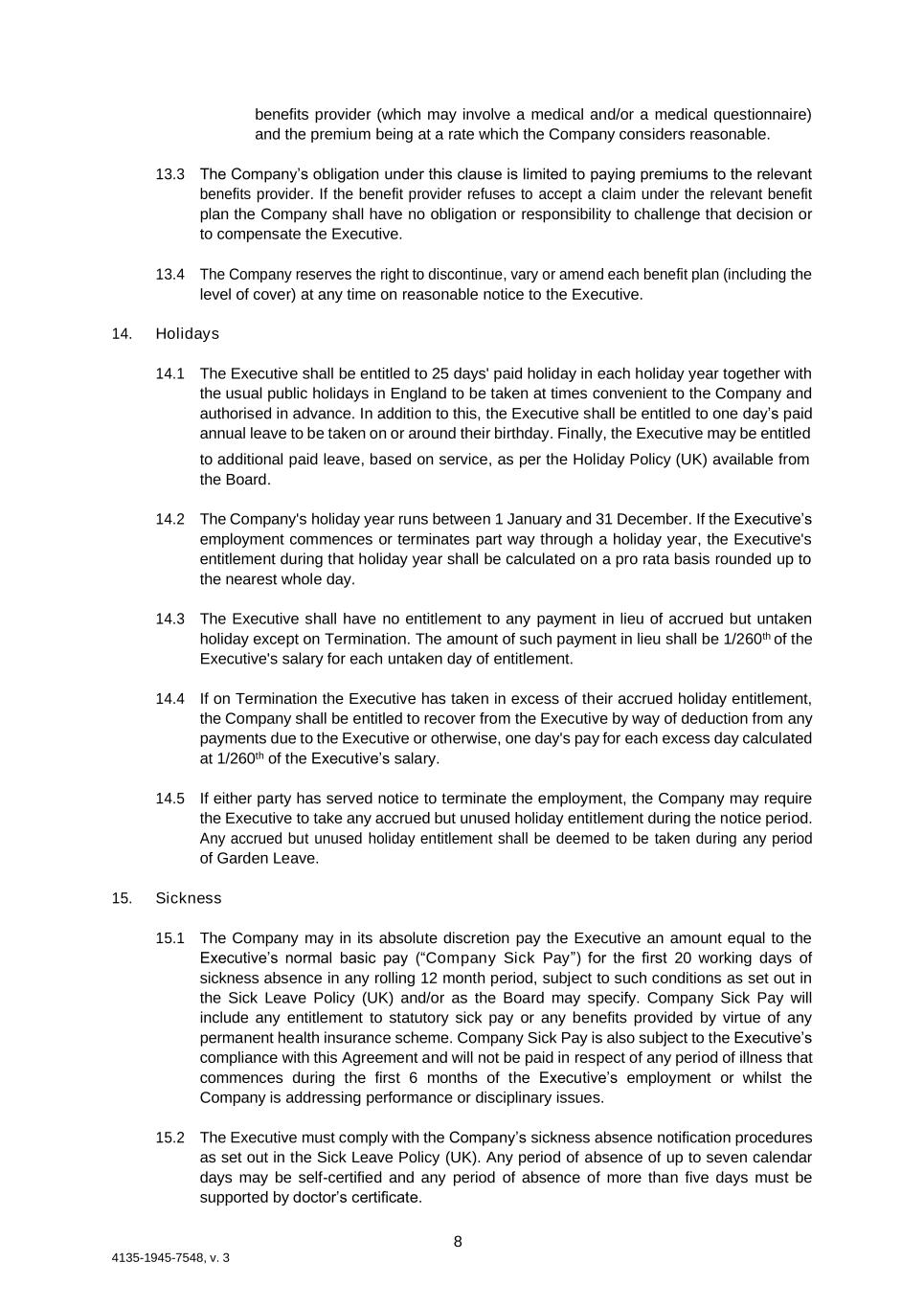 8 4135-1945-7548, v. 3 benefits provider (which may involve a medical and/or a medical questionnaire) and the premium being at a rate which the Company considers reasonable. 13.3 The Company’s obligation under this clause is limited to paying premiums to the relevant benefits provider. If the benefit provider refuses to accept a claim under the relevant benefit plan the Company shall have no obligation or responsibility to challenge that decision or to compensate the Executive. 13.4 The Company reserves the right to discontinue, vary or amend each benefit plan (including the level of cover) at any time on reasonable notice to the Executive. 14. Holidays 14.1 The Executive shall be entitled to 25 days' paid holiday in each holiday year together with the usual public holidays in England to be taken at times convenient to the Company and authorised in advance. In addition to this, the Executive shall be entitled to one day’s paid annual leave to be taken on or around their birthday. Finally, the Executive may be entitled to additional paid leave, based on service, as per the Holiday Policy (UK) available from the Board. 14.2 The Company's holiday year runs between 1 January and 31 December. If the Executive’s employment commences or terminates part way through a holiday year, the Executive's entitlement during that holiday year shall be calculated on a pro rata basis rounded up to the nearest whole day. 14.3 The Executive shall have no entitlement to any payment in lieu of accrued but untaken holiday except on Termination. The amount of such payment in lieu shall be 1/260th of the Executive's salary for each untaken day of entitlement. 14.4 If on Termination the Executive has taken in excess of their accrued holiday entitlement, the Company shall be entitled to recover from the Executive by way of deduction from any payments due to the Executive or otherwise, one day's pay for each excess day calculated at 1/260th of the Executive’s salary. 14.5 If either party has served notice to terminate the employment, the Company may require the Executive to take any accrued but unused holiday entitlement during the notice period. Any accrued but unused holiday entitlement shall be deemed to be taken during any period of Garden Leave. 15. Sickness 15.1 The Company may in its absolute discretion pay the Executive an amount equal to the Executive’s normal basic pay (“Company Sick Pay”) for the first 20 working days of sickness absence in any rolling 12 month period, subject to such conditions as set out in the Sick Leave Policy (UK) and/or as the Board may specify. Company Sick Pay will include any entitlement to statutory sick pay or any benefits provided by virtue of any permanent health insurance scheme. Company Sick Pay is also subject to the Executive’s compliance with this Agreement and will not be paid in respect of any period of illness that commences during the first 6 months of the Executive’s employment or whilst the Company is addressing performance or disciplinary issues. 15.2 The Executive must comply with the Company’s sickness absence notification procedures as set out in the Sick Leave Policy (UK). Any period of absence of up to seven calendar days may be self-certified and any period of absence of more than five days must be supported by doctor’s certificate.