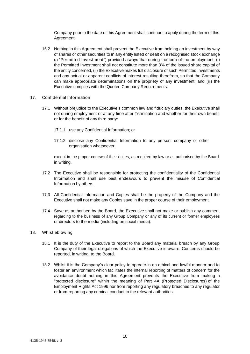 10 4135-1945-7548, v. 3 Company prior to the date of this Agreement shall continue to apply during the term of this Agreement. 16.2 Nothing in this Agreement shall prevent the Executive from holding an investment by way of shares or other securities to in any entity listed or dealt on a recognised stock exchange (a “Permitted Investment”) provided always that during the term of the employment: (i) the Permitted Investment shall not constitute more than 3% of the issued share capital of the entity concerned, (ii) the Executive makes full disclosure of such Permitted Investments and any actual or apparent conflicts of interest resulting therefrom, so that the Company can make appropriate determinations on the propriety of any investment; and (iii) the Executive complies with the Quoted Company Requirements. 17. Confidential Information 17.1 Without prejudice to the Executive’s common law and fiduciary duties, the Executive shall not during employment or at any time after Termination and whether for their own benefit or for the benefit of any third party: 17.1.1 use any Confidential Information; or 17.1.2 disclose any Confidential Information to any person, company or other organisation whatsoever, except in the proper course of their duties, as required by law or as authorised by the Board in writing. 17.2 The Executive shall be responsible for protecting the confidentiality of the Confidential Information and shall use best endeavours to prevent the misuse of Confidential Information by others. 17.3 All Confidential Information and Copies shall be the property of the Company and the Executive shall not make any Copies save in the proper course of their employment. 17.4 Save as authorised by the Board, the Executive shall not make or publish any comment regarding to the business of any Group Company or any of its current or former employees or directors to the media (including on social media). 18. Whistleblowing 18.1 It is the duty of the Executive to report to the Board any material breach by any Group Company of their legal obligations of which the Executive is aware. Concerns should be reported, in writing, to the Board. 18.2 Whilst it is the Company’s clear policy to operate in an ethical and lawful manner and to foster an environment which facilitates the internal reporting of matters of concern for the avoidance doubt nothing in this Agreement prevents the Executive from making a "protected disclosure" within the meaning of Part 4A (Protected Disclosures) of the Employment Rights Act 1996 nor from reporting any regulatory breaches to any regulator or from reporting any criminal conduct to the relevant authorities.
