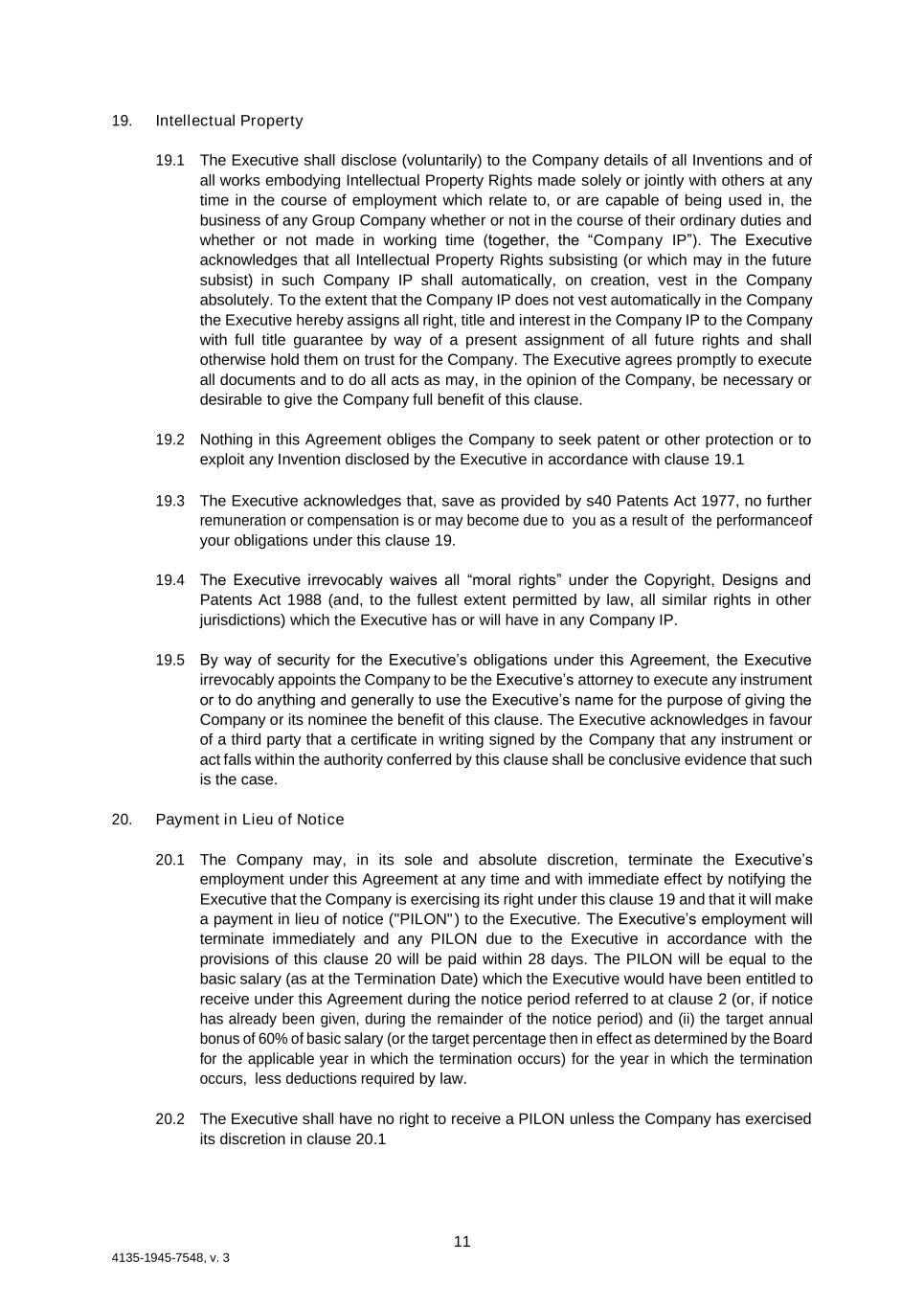 11 4135-1945-7548, v. 3 19. Intellectual Property 19.1 The Executive shall disclose (voluntarily) to the Company details of all Inventions and of all works embodying Intellectual Property Rights made solely or jointly with others at any time in the course of employment which relate to, or are capable of being used in, the business of any Group Company whether or not in the course of their ordinary duties and whether or not made in working time (together, the “Company IP”). The Executive acknowledges that all Intellectual Property Rights subsisting (or which may in the future subsist) in such Company IP shall automatically, on creation, vest in the Company absolutely. To the extent that the Company IP does not vest automatically in the Company the Executive hereby assigns all right, title and interest in the Company IP to the Company with full title guarantee by way of a present assignment of all future rights and shall otherwise hold them on trust for the Company. The Executive agrees promptly to execute all documents and to do all acts as may, in the opinion of the Company, be necessary or desirable to give the Company full benefit of this clause. 19.2 Nothing in this Agreement obliges the Company to seek patent or other protection or to exploit any Invention disclosed by the Executive in accordance with clause 19.1 19.3 The Executive acknowledges that, save as provided by s40 Patents Act 1977, no further remuneration or compensation is or may become due to you as a result of the performance of your obligations under this clause 19. 19.4 The Executive irrevocably waives all “moral rights” under the Copyright, Designs and Patents Act 1988 (and, to the fullest extent permitted by law, all similar rights in other jurisdictions) which the Executive has or will have in any Company IP. 19.5 By way of security for the Executive’s obligations under this Agreement, the Executive irrevocably appoints the Company to be the Executive’s attorney to execute any instrument or to do anything and generally to use the Executive’s name for the purpose of giving the Company or its nominee the benefit of this clause. The Executive acknowledges in favour of a third party that a certificate in writing signed by the Company that any instrument or act falls within the authority conferred by this clause shall be conclusive evidence that such is the case. 20. Payment in Lieu of Notice 20.1 The Company may, in its sole and absolute discretion, terminate the Executive’s employment under this Agreement at any time and with immediate effect by notifying the Executive that the Company is exercising its right under this clause 19 and that it will make a payment in lieu of notice ("PILON") to the Executive. The Executive’s employment will terminate immediately and any PILON due to the Executive in accordance with the provisions of this clause 20 will be paid within 28 days. The PILON will be equal to the basic salary (as at the Termination Date) which the Executive would have been entitled to receive under this Agreement during the notice period referred to at clause 2 (or, if notice has already been given, during the remainder of the notice period) and (ii) the target annual bonus of 60% of basic salary (or the target percentage then in effect as determined by the Board for the applicable year in which the termination occurs) for the year in which the termination occurs, less deductions required by law. 20.2 The Executive shall have no right to receive a PILON unless the Company has exercised its discretion in clause 20.1