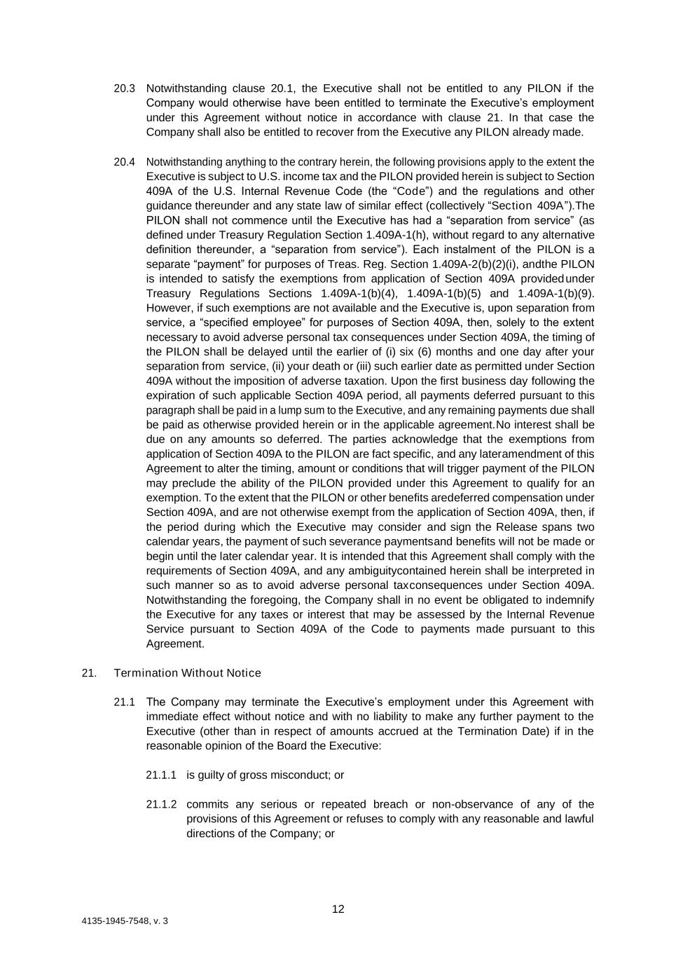 12 4135-1945-7548, v. 3 20.3 Notwithstanding clause 20.1, the Executive shall not be entitled to any PILON if the Company would otherwise have been entitled to terminate the Executive’s employment under this Agreement without notice in accordance with clause 21. In that case the Company shall also be entitled to recover from the Executive any PILON already made. 20.4 Notwithstanding anything to the contrary herein, the following provisions apply to the extent the Executive is subject to U.S. income tax and the PILON provided herein is subject to Section 409A of the U.S. Internal Revenue Code (the “Code”) and the regulations and other guidance thereunder and any state law of similar effect (collectively “Section 409A”). The PILON shall not commence until the Executive has had a “separation from service” (as defined under Treasury Regulation Section 1.409A-1(h), without regard to any alternative definition thereunder, a “separation from service”). Each instalment of the PILON is a separate “payment” for purposes of Treas. Reg. Section 1.409A-2(b)(2)(i), and the PILON is intended to satisfy the exemptions from application of Section 409A provided under Treasury Regulations Sections 1.409A-1(b)(4), 1.409A-1(b)(5) and 1.409A-1(b)(9). However, if such exemptions are not available and the Executive is, upon separation from service, a “specified employee” for purposes of Section 409A, then, solely to the extent necessary to avoid adverse personal tax consequences under Section 409A, the timing of the PILON shall be delayed until the earlier of (i) six (6) months and one day after your separation from service, (ii) your death or (iii) such earlier date as permitted under Section 409A without the imposition of adverse taxation. Upon the first business day following the expiration of such applicable Section 409A period, all payments deferred pursuant to this paragraph shall be paid in a lump sum to the Executive, and any remaining payments due shall be paid as otherwise provided herein or in the applicable agreement. No interest shall be due on any amounts so deferred. The parties acknowledge that the exemptions from application of Section 409A to the PILON are fact specific, and any later amendment of this Agreement to alter the timing, amount or conditions that will trigger payment of the PILON may preclude the ability of the PILON provided under this Agreement to qualify for an exemption. To the extent that the PILON or other benefits are deferred compensation under Section 409A, and are not otherwise exempt from the application of Section 409A, then, if the period during which the Executive may consider and sign the Release spans two calendar years, the payment of such severance payments and benefits will not be made or begin until the later calendar year. It is intended that this Agreement shall comply with the requirements of Section 409A, and any ambiguity contained herein shall be interpreted in such manner so as to avoid adverse personal tax consequences under Section 409A. Notwithstanding the foregoing, the Company shall in no event be obligated to indemnify the Executive for any taxes or interest that may be assessed by the Internal Revenue Service pursuant to Section 409A of the Code to payments made pursuant to this Agreement. 21. Termination Without Notice 21.1 The Company may terminate the Executive’s employment under this Agreement with immediate effect without notice and with no liability to make any further payment to the Executive (other than in respect of amounts accrued at the Termination Date) if in the reasonable opinion of the Board the Executive: 21.1.1 is guilty of gross misconduct; or 21.1.2 commits any serious or repeated breach or non-observance of any of the provisions of this Agreement or refuses to comply with any reasonable and lawful directions of the Company; or