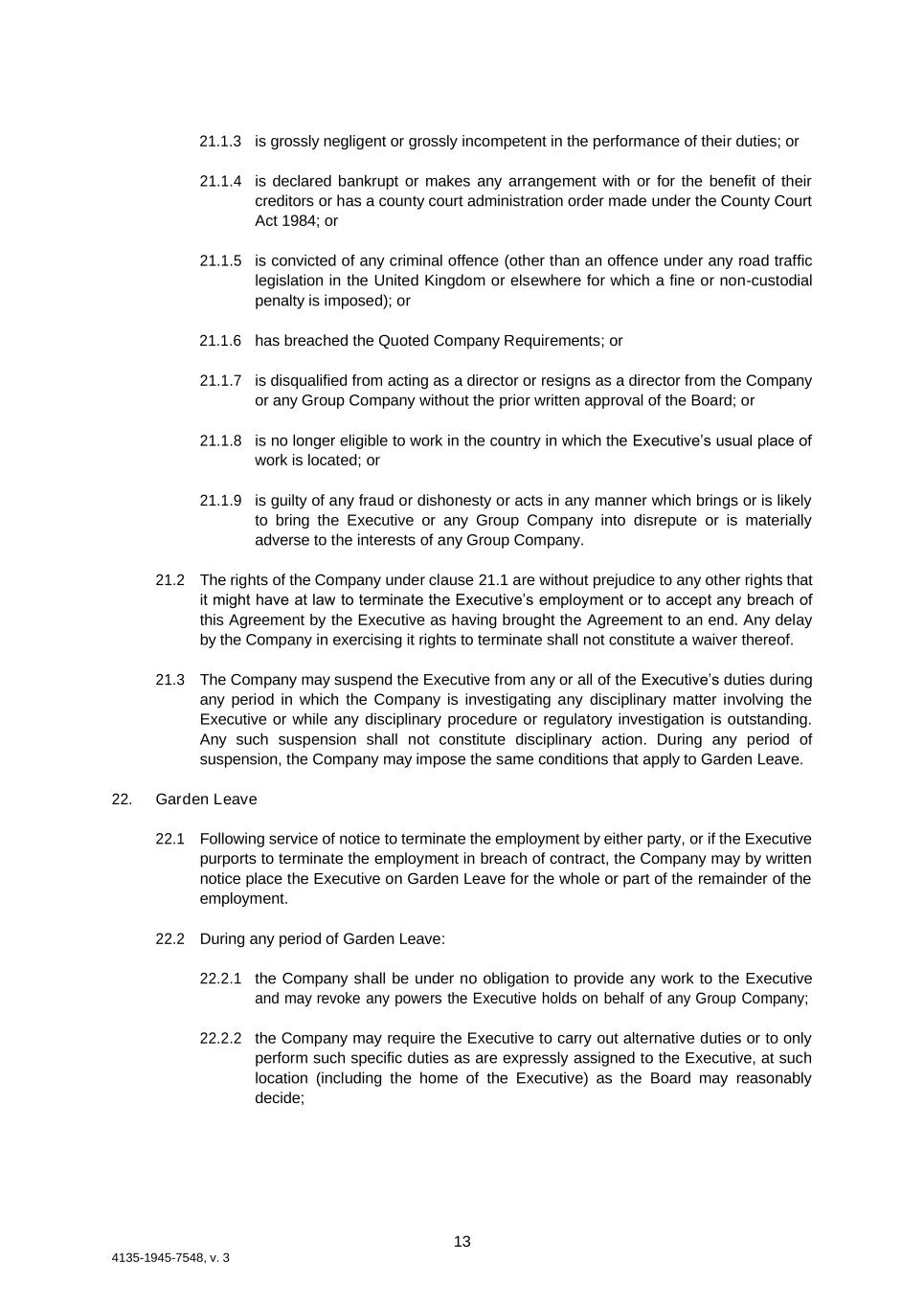 13 4135-1945-7548, v. 3 21.1.3 is grossly negligent or grossly incompetent in the performance of their duties; or 21.1.4 is declared bankrupt or makes any arrangement with or for the benefit of their creditors or has a county court administration order made under the County Court Act 1984; or 21.1.5 is convicted of any criminal offence (other than an offence under any road traffic legislation in the United Kingdom or elsewhere for which a fine or non-custodial penalty is imposed); or 21.1.6 has breached the Quoted Company Requirements; or 21.1.7 is disqualified from acting as a director or resigns as a director from the Company or any Group Company without the prior written approval of the Board; or 21.1.8 is no longer eligible to work in the country in which the Executive’s usual place of work is located; or 21.1.9 is guilty of any fraud or dishonesty or acts in any manner which brings or is likely to bring the Executive or any Group Company into disrepute or is materially adverse to the interests of any Group Company. 21.2 The rights of the Company under clause 21.1 are without prejudice to any other rights that it might have at law to terminate the Executive’s employment or to accept any breach of this Agreement by the Executive as having brought the Agreement to an end. Any delay by the Company in exercising it rights to terminate shall not constitute a waiver thereof. 21.3 The Company may suspend the Executive from any or all of the Executive’s duties during any period in which the Company is investigating any disciplinary matter involving the Executive or while any disciplinary procedure or regulatory investigation is outstanding. Any such suspension shall not constitute disciplinary action. During any period of suspension, the Company may impose the same conditions that apply to Garden Leave. 22. Garden Leave 22.1 Following service of notice to terminate the employment by either party, or if the Executive purports to terminate the employment in breach of contract, the Company may by written notice place the Executive on Garden Leave for the whole or part of the remainder of the employment. 22.2 During any period of Garden Leave: 22.2.1 the Company shall be under no obligation to provide any work to the Executive and may revoke any powers the Executive holds on behalf of any Group Company; 22.2.2 the Company may require the Executive to carry out alternative duties or to only perform such specific duties as are expressly assigned to the Executive, at such location (including the home of the Executive) as the Board may reasonably decide;