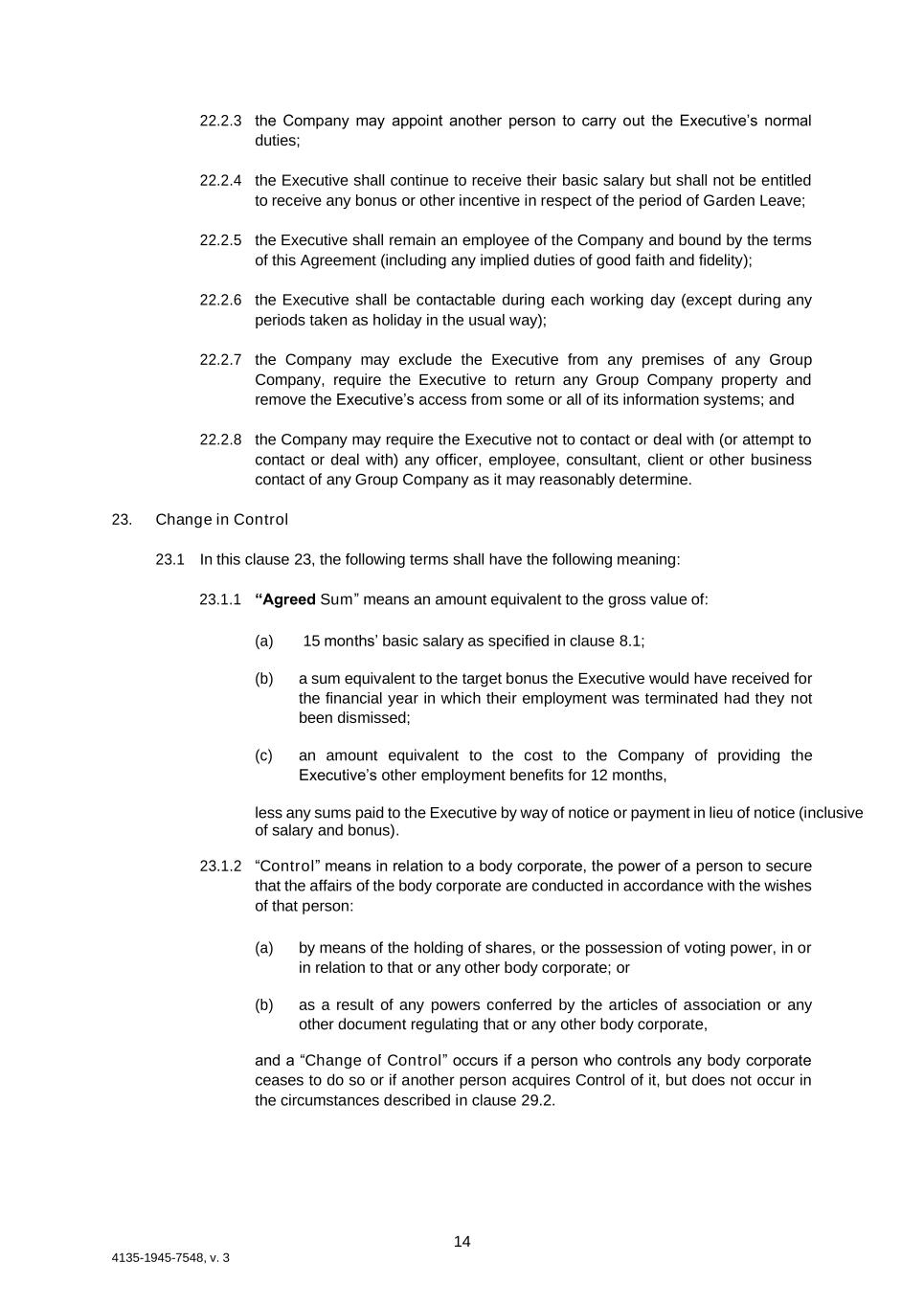 14 4135-1945-7548, v. 3 22.2.3 the Company may appoint another person to carry out the Executive’s normal duties; 22.2.4 the Executive shall continue to receive their basic salary but shall not be entitled to receive any bonus or other incentive in respect of the period of Garden Leave; 22.2.5 the Executive shall remain an employee of the Company and bound by the terms of this Agreement (including any implied duties of good faith and fidelity); 22.2.6 the Executive shall be contactable during each working day (except during any periods taken as holiday in the usual way); 22.2.7 the Company may exclude the Executive from any premises of any Group Company, require the Executive to return any Group Company property and remove the Executive’s access from some or all of its information systems; and 22.2.8 the Company may require the Executive not to contact or deal with (or attempt to contact or deal with) any officer, employee, consultant, client or other business contact of any Group Company as it may reasonably determine. 23. Change in Control 23.1 In this clause 23, the following terms shall have the following meaning: 23.1.1 “Agreed Sum” means an amount equivalent to the gross value of: (a) 15 months’ basic salary as specified in clause 8.1; (b) a sum equivalent to the target bonus the Executive would have received for the financial year in which their employment was terminated had they not been dismissed; (c) an amount equivalent to the cost to the Company of providing the Executive’s other employment benefits for 12 months, less any sums paid to the Executive by way of notice or payment in lieu of notice (inclusive of salary and bonus). 23.1.2 “Control” means in relation to a body corporate, the power of a person to secure that the affairs of the body corporate are conducted in accordance with the wishes of that person: (a) by means of the holding of shares, or the possession of voting power, in or in relation to that or any other body corporate; or (b) as a result of any powers conferred by the articles of association or any other document regulating that or any other body corporate, and a “Change of Control” occurs if a person who controls any body corporate ceases to do so or if another person acquires Control of it, but does not occur in the circumstances described in clause 29.2.