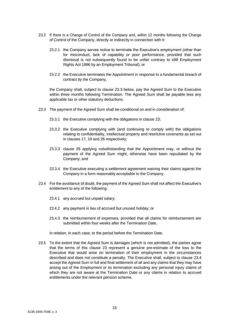 15 4135-1945-7548, v. 3 23.2 If there is a Change of Control of the Company and, within 12 months following the Change of Control of the Company, directly or indirectly in connection with it: 23.2.1 the Company serves notice to terminate the Executive’s employment (other than for misconduct, lack of capability or poor performance, provided that such dismissal is not subsequently found to be unfair contrary to s98 Employment Rights Act 1996 by an Employment Tribunal); or 23.2.2 the Executive terminates the Appointment in response to a fundamental breach of contract by the Company, the Company shall, subject to clause 23.3 below, pay the Agreed Sum to the Executive within three months following Termination. The Agreed Sum shall be payable less any applicable tax or other statutory deductions. 23.3 The payment of the Agreed Sum shall be conditional on and in consideration of: 23.3.1 the Executive complying with the obligations in clause 23; 23.3.2 the Executive complying with (and continuing to comply with) the obligations relating to confidentiality, intellectual property and restrictive covenants as set out in clauses 17, 19 and 26 respectively; 23.3.3 clause 26 applying notwithstanding that the Appointment may, or without the payment of the Agreed Sum might, otherwise have been repudiated by the Company; and 23.3.4 the Executive executing a settlement agreement waiving their claims against the Company in a form reasonably acceptable to the Company. 23.4 For the avoidance of doubt, the payment of the Agreed Sum shall not affect the Executive’s entitlement to any of the following: 23.4.1 any accrued but unpaid salary; 23.4.2 any payment in lieu of accrued but unused holiday; or 23.4.3 the reimbursement of expenses, provided that all claims for reimbursement are submitted within four weeks after the Termination Date, in relation, in each case, to the period before the Termination Date. 23.5 To the extent that the Agreed Sum is damages (which is not admitted), the parties agree that the terms of this clause 23 represent a genuine pre-estimate of the loss to the Executive that would arise on termination of their employment in the circumstances described and does not constitute a penalty. The Executive shall, subject to clause 23.4 accept the Agreed Sum in full and final settlement of all and any claims that they may have arising out of the Employment or its termination excluding any personal injury claims of which they are not aware at the Termination Date or any claims in relation to accrued entitlements under the relevant pension scheme.