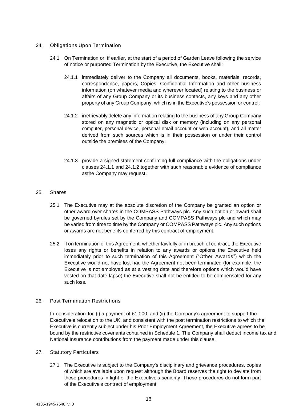 16 4135-1945-7548, v. 3 24. Obligations Upon Termination 24.1 On Termination or, if earlier, at the start of a period of Garden Leave following the service of notice or purported Termination by the Executive, the Executive shall: 24.1.1 immediately deliver to the Company all documents, books, materials, records, correspondence, papers, Copies, Confidential Information and other business information (on whatever media and wherever located) relating to the business or affairs of any Group Company or its business contacts, any keys and any other property of any Group Company, which is in the Executive’s possession or control; 24.1.2 irretrievably delete any information relating to the business of any Group Company stored on any magnetic or optical disk or memory (including on any personal computer, personal device, personal email account or web account), and all matter derived from such sources which is in their possession or under their control outside the premises of the Company; 24.1.3 provide a signed statement confirming full compliance with the obligations under clauses 24.1.1 and 24.1.2 together with such reasonable evidence of compliance as the Company may request. 25. Shares 25.1 The Executive may at the absolute discretion of the Company be granted an option or other award over shares in the COMPASS Pathways plc. Any such option or award shall be governed by rules set by the Company and COMPASS Pathways plc and which may be varied from time to time by the Company or COMPASS Pathways plc. Any such options or awards are not benefits conferred by this contract of employment. 25.2 If on termination of this Agreement, whether lawfully or in breach of contract, the Executive loses any rights or benefits in relation to any awards or options the Executive held immediately prior to such termination of this Agreement (“Other Awards”) which the Executive would not have lost had the Agreement not been terminated (for example, the Executive is not employed as at a vesting date and therefore options which would have vested on that date lapse) the Executive shall not be entitled to be compensated for any such loss. 26. Post Termination Restrictions In consideration for (i) a payment of £1,000, and (ii) the Company’s agreement to support the Executive’s relocation to the UK, and consistent with the post termination restrictions to which the Executive is currently subject under his Prior Employment Agreement, the Executive agrees to be bound by the restrictive covenants contained in Schedule 1. The Company shall deduct income tax and National Insurance contributions from the payment made under this clause. 27. Statutory Particulars 27.1 The Executive is subject to the Company's disciplinary and grievance procedures, copies of which are available upon request although the Board reserves the right to deviate from these procedures in light of the Executive’s seniority. These procedures do not form part of the Executive's contract of employment.