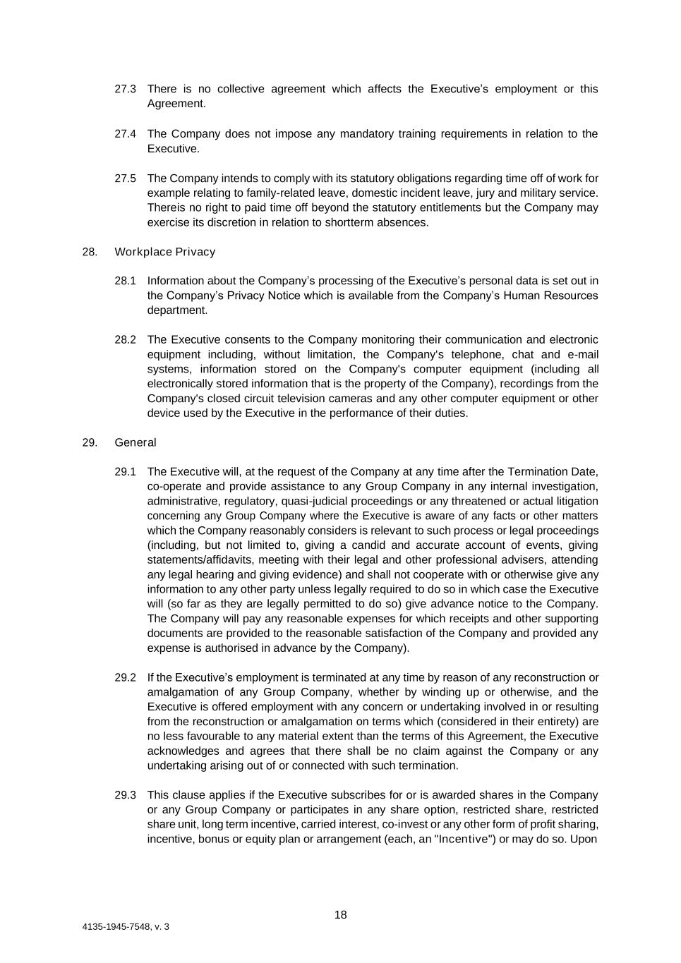 18 4135-1945-7548, v. 3 27.3 There is no collective agreement which affects the Executive’s employment or this Agreement. 27.4 The Company does not impose any mandatory training requirements in relation to the Executive. 27.5 The Company intends to comply with its statutory obligations regarding time off of work for example relating to family-related leave, domestic incident leave, jury and military service. There is no right to paid time off beyond the statutory entitlements but the Company may exercise its discretion in relation to short term absences. 28. Workplace Privacy 28.1 Information about the Company’s processing of the Executive’s personal data is set out in the Company’s Privacy Notice which is available from the Company’s Human Resources department. 28.2 The Executive consents to the Company monitoring their communication and electronic equipment including, without limitation, the Company's telephone, chat and e-mail systems, information stored on the Company's computer equipment (including all electronically stored information that is the property of the Company), recordings from the Company's closed circuit television cameras and any other computer equipment or other device used by the Executive in the performance of their duties. 29. General 29.1 The Executive will, at the request of the Company at any time after the Termination Date, co-operate and provide assistance to any Group Company in any internal investigation, administrative, regulatory, quasi-judicial proceedings or any threatened or actual litigation concerning any Group Company where the Executive is aware of any facts or other matters which the Company reasonably considers is relevant to such process or legal proceedings (including, but not limited to, giving a candid and accurate account of events, giving statements/affidavits, meeting with their legal and other professional advisers, attending any legal hearing and giving evidence) and shall not cooperate with or otherwise give any information to any other party unless legally required to do so in which case the Executive will (so far as they are legally permitted to do so) give advance notice to the Company. The Company will pay any reasonable expenses for which receipts and other supporting documents are provided to the reasonable satisfaction of the Company and provided any expense is authorised in advance by the Company). 29.2 If the Executive’s employment is terminated at any time by reason of any reconstruction or amalgamation of any Group Company, whether by winding up or otherwise, and the Executive is offered employment with any concern or undertaking involved in or resulting from the reconstruction or amalgamation on terms which (considered in their entirety) are no less favourable to any material extent than the terms of this Agreement, the Executive acknowledges and agrees that there shall be no claim against the Company or any undertaking arising out of or connected with such termination. 29.3 This clause applies if the Executive subscribes for or is awarded shares in the Company or any Group Company or participates in any share option, restricted share, restricted share unit, long term incentive, carried interest, co-invest or any other form of profit sharing, incentive, bonus or equity plan or arrangement (each, an "Incentive") or may do so. Upon