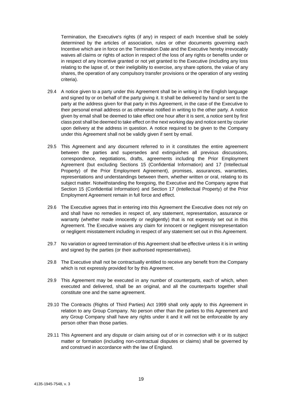 19 4135-1945-7548, v. 3 Termination, the Executive's rights (if any) in respect of each Incentive shall be solely determined by the articles of association, rules or other documents governing each Incentive which are in force on the Termination Date and the Executive hereby irrevocably waives all claims or rights of action in respect of the loss of any rights or benefits under or in respect of any Incentive granted or not yet granted to the Executive (including any loss relating to the lapse of, or their ineligibility to exercise, any share options, the value of any shares, the operation of any compulsory transfer provisions or the operation of any vesting criteria). 29.4 A notice given to a party under this Agreement shall be in writing in the English language and signed by or on behalf of the party giving it. It shall be delivered by hand or sent to the party at the address given for that party in this Agreement, in the case of the Executive to their personal email address or as otherwise notified in writing to the other party. A notice given by email shall be deemed to take effect one hour after it is sent, a notice sent by first class post shall be deemed to take effect on the next working day and notice sent by courier upon delivery at the address in question. A notice required to be given to the Company under this Agreement shall not be validly given if sent by email. 29.5 This Agreement and any document referred to in it constitutes the entire agreement between the parties and supersedes and extinguishes all previous discussions, correspondence, negotiations, drafts, agreements including the Prior Employment Agreement (but excluding Sections 15 (Confidential Information) and 17 (Intellectual Property) of the Prior Employment Agreement), promises, assurances, warranties, representations and understandings between them, whether written or oral, relating to its subject matter. Notwithstanding the foregoing, the Executive and the Company agree that Section 15 (Confidential Information) and Section 17 (Intellectual Property) of the Prior Employment Agreement remain in full force and effect. 29.6 The Executive agrees that in entering into this Agreement the Executive does not rely on and shall have no remedies in respect of, any statement, representation, assurance or warranty (whether made innocently or negligently) that is not expressly set out in this Agreement. The Executive waives any claim for innocent or negligent misrepresentation or negligent misstatement including in respect of any statement set out in this Agreement. 29.7 No variation or agreed termination of this Agreement shall be effective unless it is in writing and signed by the parties (or their authorised representatives). 29.8 The Executive shall not be contractually entitled to receive any benefit from the Company which is not expressly provided for by this Agreement. 29.9 This Agreement may be executed in any number of counterparts, each of which, when executed and delivered, shall be an original, and all the counterparts together shall constitute one and the same agreement. 29.10 The Contracts (Rights of Third Parties) Act 1999 shall only apply to this Agreement in relation to any Group Company. No person other than the parties to this Agreement and any Group Company shall have any rights under it and it will not be enforceable by any person other than those parties. 29.11 This Agreement and any dispute or claim arising out of or in connection with it or its subject matter or formation (including non-contractual disputes or claims) shall be governed by and construed in accordance with the law of England.
