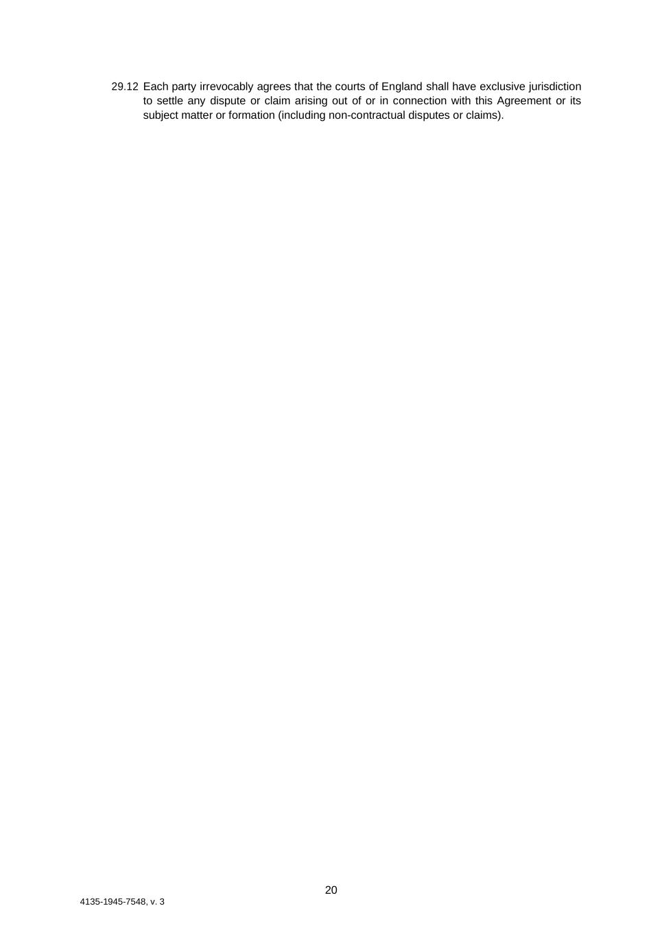 20 4135-1945-7548, v. 3 29.12 Each party irrevocably agrees that the courts of England shall have exclusive jurisdiction to settle any dispute or claim arising out of or in connection with this Agreement or its subject matter or formation (including non-contractual disputes or claims).