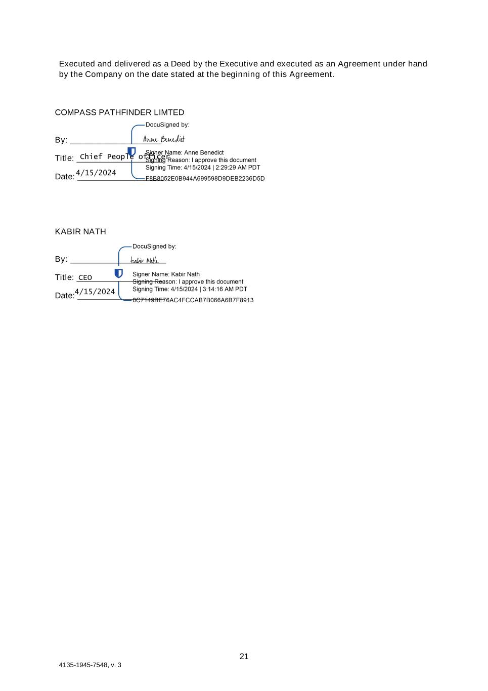 21 4135-1945-7548, v. 3 Executed and delivered as a Deed by the Executive and executed as an Agreement under hand by the Company on the date stated at the beginning of this Agreement. COMPASS PATHFINDER LIMTED By: ____________________ Title: ___________________ Date: ___________________ KABIR NATH By: _____________________ Title: ___________________ Date: ___________________ Chief People officer 4/15/2024 4/15/2024 CEO