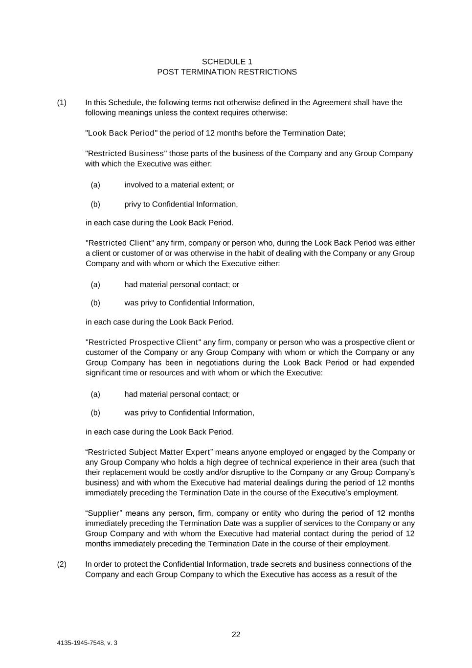 22 4135-1945-7548, v. 3 SCHEDULE 1 POST TERMINATION RESTRICTIONS (1) In this Schedule, the following terms not otherwise defined in the Agreement shall have the following meanings unless the context requires otherwise: "Look Back Period" the period of 12 months before the Termination Date; "Restricted Business" those parts of the business of the Company and any Group Company with which the Executive was either: (a) involved to a material extent; or (b) privy to Confidential Information, in each case during the Look Back Period. "Restricted Client" any firm, company or person who, during the Look Back Period was either a client or customer of or was otherwise in the habit of dealing with the Company or any Group Company and with whom or which the Executive either: (a) had material personal contact; or (b) was privy to Confidential Information, in each case during the Look Back Period. "Restricted Prospective Client" any firm, company or person who was a prospective client or customer of the Company or any Group Company with whom or which the Company or any Group Company has been in negotiations during the Look Back Period or had expended significant time or resources and with whom or which the Executive: (a) had material personal contact; or (b) was privy to Confidential Information, in each case during the Look Back Period. “Restricted Subject Matter Expert” means anyone employed or engaged by the Company or any Group Company who holds a high degree of technical experience in their area (such that their replacement would be costly and/or disruptive to the Company or any Group Company’s business) and with whom the Executive had material dealings during the period of 12 months immediately preceding the Termination Date in the course of the Executive’s employment. “Supplier” means any person, firm, company or entity who during the period of 12 months immediately preceding the Termination Date was a supplier of services to the Company or any Group Company and with whom the Executive had material contact during the period of 12 months immediately preceding the Termination Date in the course of their employment. (2) In order to protect the Confidential Information, trade secrets and business connections of the Company and each Group Company to which the Executive has access as a result of the