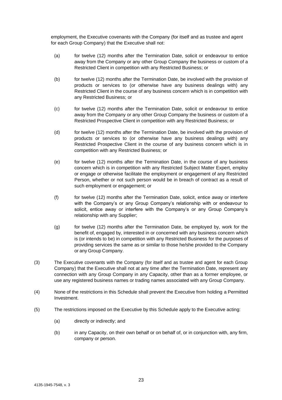 23 4135-1945-7548, v. 3 employment, the Executive covenants with the Company (for itself and as trustee and agent for each Group Company) that the Executive shall not: (a) for twelve (12) months after the Termination Date, solicit or endeavour to entice away from the Company or any other Group Company the business or custom of a Restricted Client in competition with any Restricted Business; or (b) for twelve (12) months after the Termination Date, be involved with the provision of products or services to (or otherwise have any business dealings with) any Restricted Client in the course of any business concern which is in competition with any Restricted Business; or (c) for twelve (12) months after the Termination Date, solicit or endeavour to entice away from the Company or any other Group Company the business or custom of a Restricted Prospective Client in competition with any Restricted Business; or (d) for twelve (12) months after the Termination Date, be involved with the provision of products or services to (or otherwise have any business dealings with) any Restricted Prospective Client in the course of any business concern which is in competition with any Restricted Business; or (e) for twelve (12) months after the Termination Date, in the course of any business concern which is in competition with any Restricted Subject Matter Expert, employ or engage or otherwise facilitate the employment or engagement of any Restricted Person, whether or not such person would be in breach of contract as a result of such employment or engagement; or (f) for twelve (12) months after the Termination Date, solicit, entice away or interfere with the Company’s or any Group Company’s relationship with or endeavour to solicit, entice away or interfere with the Company’s or any Group Company’s relationship with any Supplier; (g) for twelve (12) months after the Termination Date, be employed by, work for the benefit of, engaged by, interested in or concerned with any business concern which is (or intends to be) in competition with any Restricted Business for the purposes of providing services the same as or similar to those he/she provided to the Company or any Group Company. (3) The Executive covenants with the Company (for itself and as trustee and agent for each Group Company) that the Executive shall not at any time after the Termination Date, represent any connection with any Group Company in any Capacity, other than as a former employee, or use any registered business names or trading names associated with any Group Company. (4) None of the restrictions in this Schedule shall prevent the Executive from holding a Permitted Investment. (5) The restrictions imposed on the Executive by this Schedule apply to the Executive acting: (a) directly or indirectly; and (b) in any Capacity, on their own behalf or on behalf of, or in conjunction with, any firm, company or person.