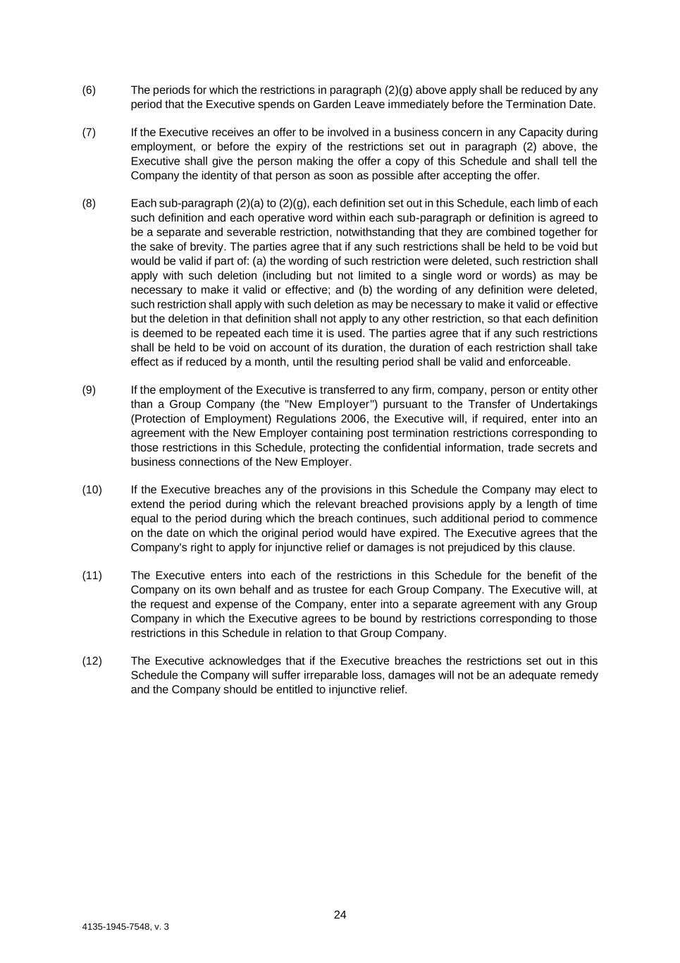 24 4135-1945-7548, v. 3 (6) The periods for which the restrictions in paragraph (2)(g) above apply shall be reduced by any period that the Executive spends on Garden Leave immediately before the Termination Date. (7) If the Executive receives an offer to be involved in a business concern in any Capacity during employment, or before the expiry of the restrictions set out in paragraph (2) above, the Executive shall give the person making the offer a copy of this Schedule and shall tell the Company the identity of that person as soon as possible after accepting the offer. (8) Each sub-paragraph (2)(a) to (2)(g), each definition set out in this Schedule, each limb of each such definition and each operative word within each sub-paragraph or definition is agreed to be a separate and severable restriction, notwithstanding that they are combined together for the sake of brevity. The parties agree that if any such restrictions shall be held to be void but would be valid if part of: (a) the wording of such restriction were deleted, such restriction shall apply with such deletion (including but not limited to a single word or words) as may be necessary to make it valid or effective; and (b) the wording of any definition were deleted, such restriction shall apply with such deletion as may be necessary to make it valid or effective but the deletion in that definition shall not apply to any other restriction, so that each definition is deemed to be repeated each time it is used. The parties agree that if any such restrictions shall be held to be void on account of its duration, the duration of each restriction shall take effect as if reduced by a month, until the resulting period shall be valid and enforceable. (9) If the employment of the Executive is transferred to any firm, company, person or entity other than a Group Company (the "New Employer") pursuant to the Transfer of Undertakings (Protection of Employment) Regulations 2006, the Executive will, if required, enter into an agreement with the New Employer containing post termination restrictions corresponding to those restrictions in this Schedule, protecting the confidential information, trade secrets and business connections of the New Employer. (10) If the Executive breaches any of the provisions in this Schedule the Company may elect to extend the period during which the relevant breached provisions apply by a length of time equal to the period during which the breach continues, such additional period to commence on the date on which the original period would have expired. The Executive agrees that the Company's right to apply for injunctive relief or damages is not prejudiced by this clause. (11) The Executive enters into each of the restrictions in this Schedule for the benefit of the Company on its own behalf and as trustee for each Group Company. The Executive will, at the request and expense of the Company, enter into a separate agreement with any Group Company in which the Executive agrees to be bound by restrictions corresponding to those restrictions in this Schedule in relation to that Group Company. (12) The Executive acknowledges that if the Executive breaches the restrictions set out in this Schedule the Company will suffer irreparable loss, damages will not be an adequate remedy and the Company should be entitled to injunctive relief.