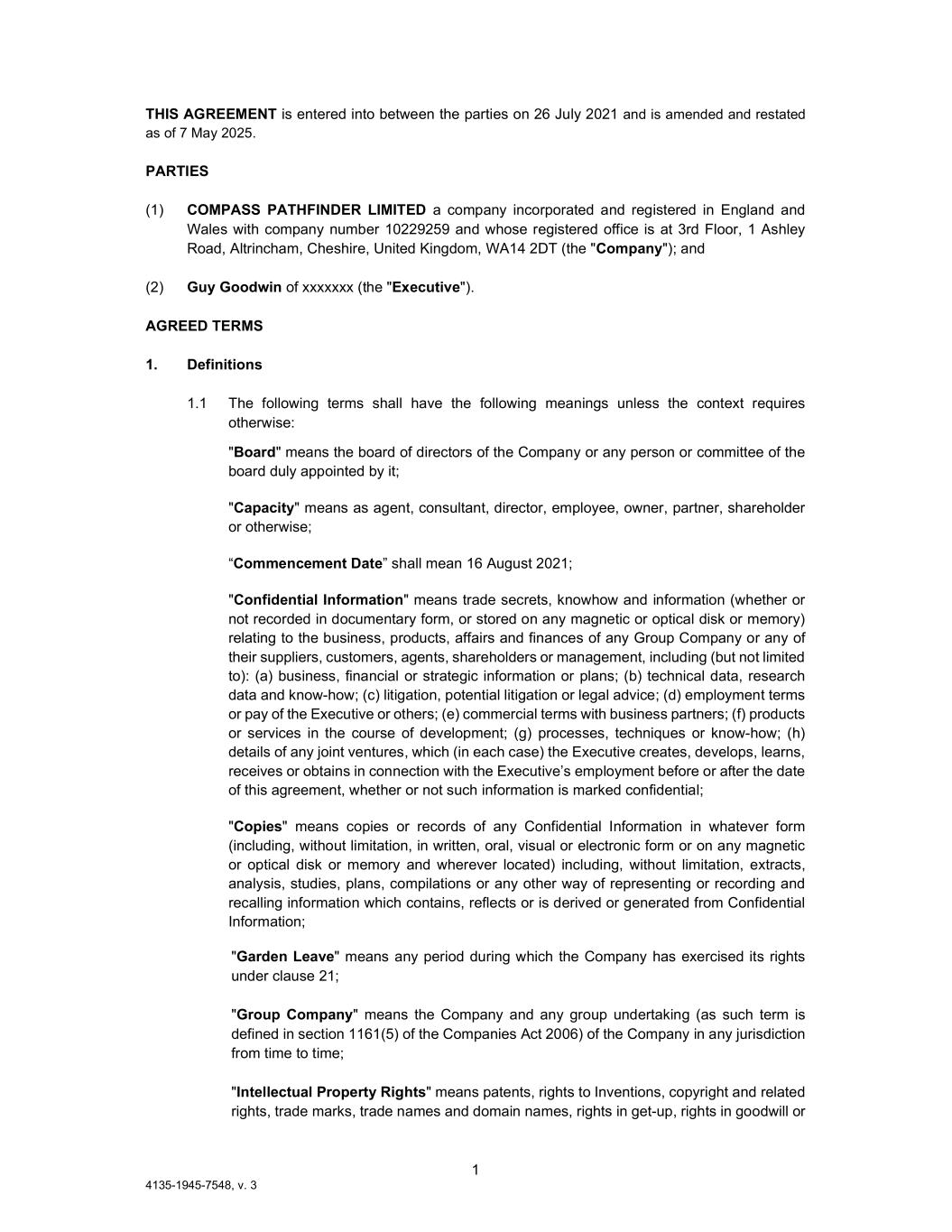 1 4135-1945-7548, v. 3 THIS AGREEMENT is entered into between the parties on 26 July 2021 and is amended and restated as of 7 May 2025. PARTIES (1) COMPASS PATHFINDER LIMITED a company incorporated and registered in England and Wales with company number 10229259 and whose registered office is at 3rd Floor, 1 Ashley Road, Altrincham, Cheshire, United Kingdom, WA14 2DT (the "Company"); and (2) Guy Goodwin of xxxxxxx (the "Executive"). AGREED TERMS 1. Definitions 1.1 The following terms shall have the following meanings unless the context requires otherwise: "Board" means the board of directors of the Company or any person or committee of the board duly appointed by it; "Capacity" means as agent, consultant, director, employee, owner, partner, shareholder or otherwise; “Commencement Date” shall mean 16 August 2021; "Confidential Information" means trade secrets, knowhow and information (whether or not recorded in documentary form, or stored on any magnetic or optical disk or memory) relating to the business, products, affairs and finances of any Group Company or any of their suppliers, customers, agents, shareholders or management, including (but not limited to): (a) business, financial or strategic information or plans; (b) technical data, research data and know-how; (c) litigation, potential litigation or legal advice; (d) employment terms or pay of the Executive or others; (e) commercial terms with business partners; (f) products or services in the course of development; (g) processes, techniques or know-how; (h) details of any joint ventures, which (in each case) the Executive creates, develops, learns, receives or obtains in connection with the Executive’s employment before or after the date of this agreement, whether or not such information is marked confidential; "Copies" means copies or records of any Confidential Information in whatever form (including, without limitation, in written, oral, visual or electronic form or on any magnetic or optical disk or memory and wherever located) including, without limitation, extracts, analysis, studies, plans, compilations or any other way of representing or recording and recalling information which contains, reflects or is derived or generated from Confidential Information; "Garden Leave" means any period during which the Company has exercised its rights under clause 21; "Group Company" means the Company and any group undertaking (as such term is defined in section 1161(5) of the Companies Act 2006) of the Company in any jurisdiction from time to time; "Intellectual Property Rights" means patents, rights to Inventions, copyright and related rights, trade marks, trade names and domain names, rights in get-up, rights in goodwill or