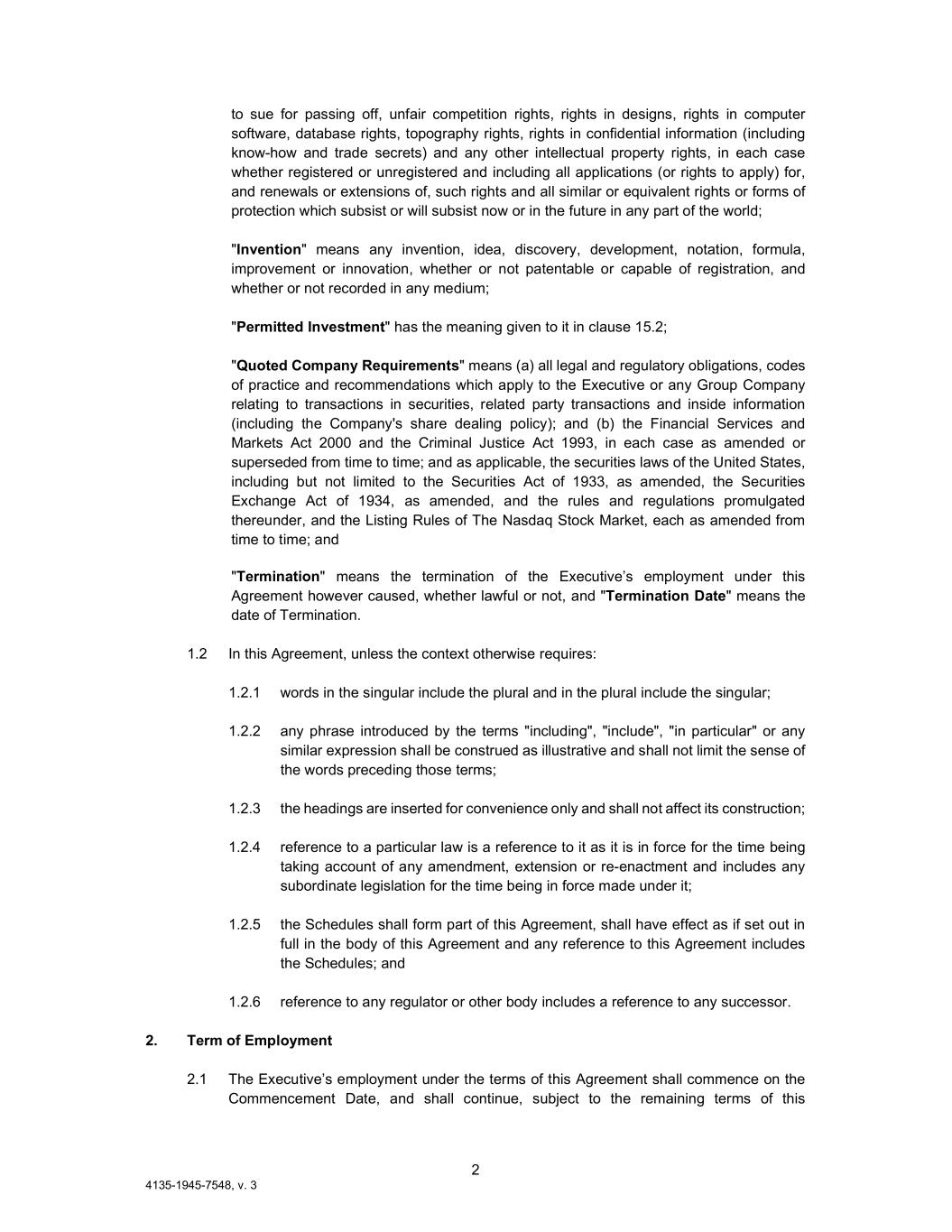 2 4135-1945-7548, v. 3 to sue for passing off, unfair competition rights, rights in designs, rights in computer software, database rights, topography rights, rights in confidential information (including know-how and trade secrets) and any other intellectual property rights, in each case whether registered or unregistered and including all applications (or rights to apply) for, and renewals or extensions of, such rights and all similar or equivalent rights or forms of protection which subsist or will subsist now or in the future in any part of the world; "Invention" means any invention, idea, discovery, development, notation, formula, improvement or innovation, whether or not patentable or capable of registration, and whether or not recorded in any medium; "Permitted Investment" has the meaning given to it in clause 15.2; "Quoted Company Requirements" means (a) all legal and regulatory obligations, codes of practice and recommendations which apply to the Executive or any Group Company relating to transactions in securities, related party transactions and inside information (including the Company's share dealing policy); and (b) the Financial Services and Markets Act 2000 and the Criminal Justice Act 1993, in each case as amended or superseded from time to time; and as applicable, the securities laws of the United States, including but not limited to the Securities Act of 1933, as amended, the Securities Exchange Act of 1934, as amended, and the rules and regulations promulgated thereunder, and the Listing Rules of The Nasdaq Stock Market, each as amended from time to time; and "Termination" means the termination of the Executive’s employment under this Agreement however caused, whether lawful or not, and "Termination Date" means the date of Termination. 1.2 In this Agreement, unless the context otherwise requires: 1.2.1 words in the singular include the plural and in the plural include the singular; 1.2.2 any phrase introduced by the terms "including", "include", "in particular" or any similar expression shall be construed as illustrative and shall not limit the sense of the words preceding those terms; 1.2.3 the headings are inserted for convenience only and shall not affect its construction; 1.2.4 reference to a particular law is a reference to it as it is in force for the time being taking account of any amendment, extension or re-enactment and includes any subordinate legislation for the time being in force made under it; 1.2.5 the Schedules shall form part of this Agreement, shall have effect as if set out in full in the body of this Agreement and any reference to this Agreement includes the Schedules; and 1.2.6 reference to any regulator or other body includes a reference to any successor. 2. Term of Employment 2.1 The Executive’s employment under the terms of this Agreement shall commence on the Commencement Date, and shall continue, subject to the remaining terms of this