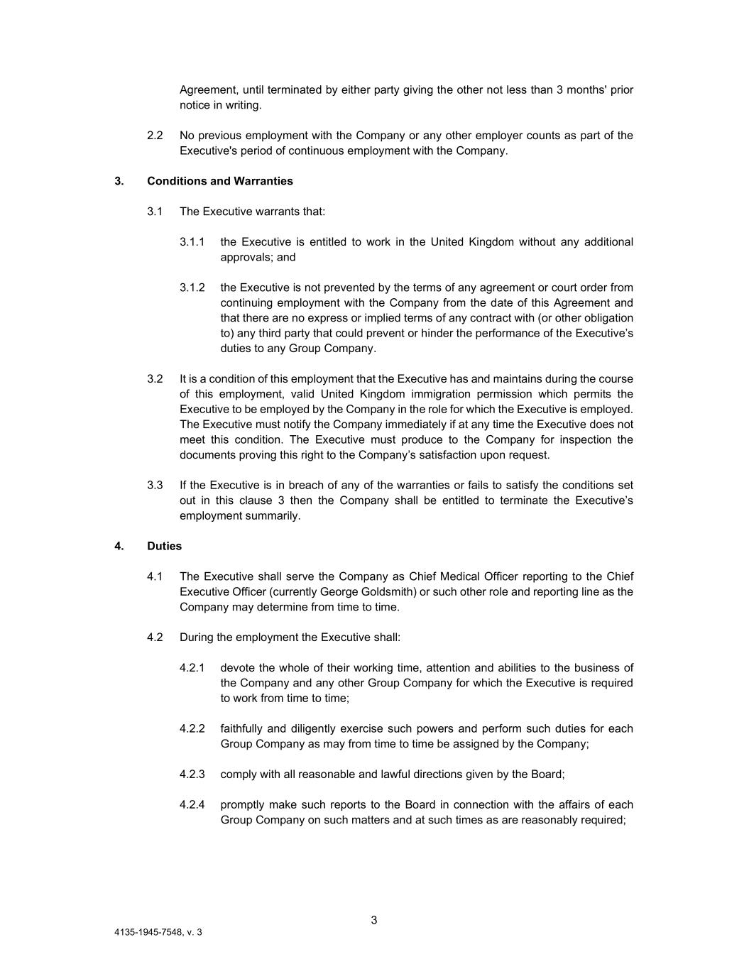 3 4135-1945-7548, v. 3 Agreement, until terminated by either party giving the other not less than 3 months' prior notice in writing. 2.2 No previous employment with the Company or any other employer counts as part of the Executive's period of continuous employment with the Company. 3. Conditions and Warranties 3.1 The Executive warrants that: 3.1.1 the Executive is entitled to work in the United Kingdom without any additional approvals; and 3.1.2 the Executive is not prevented by the terms of any agreement or court order from continuing employment with the Company from the date of this Agreement and that there are no express or implied terms of any contract with (or other obligation to) any third party that could prevent or hinder the performance of the Executive’s duties to any Group Company. 3.2 It is a condition of this employment that the Executive has and maintains during the course of this employment, valid United Kingdom immigration permission which permits the Executive to be employed by the Company in the role for which the Executive is employed. The Executive must notify the Company immediately if at any time the Executive does not meet this condition. The Executive must produce to the Company for inspection the documents proving this right to the Company’s satisfaction upon request. 3.3 If the Executive is in breach of any of the warranties or fails to satisfy the conditions set out in this clause 3 then the Company shall be entitled to terminate the Executive’s employment summarily. 4. Duties 4.1 The Executive shall serve the Company as Chief Medical Officer reporting to the Chief Executive Officer (currently George Goldsmith) or such other role and reporting line as the Company may determine from time to time. 4.2 During the employment the Executive shall: 4.2.1 devote the whole of their working time, attention and abilities to the business of the Company and any other Group Company for which the Executive is required to work from time to time; 4.2.2 faithfully and diligently exercise such powers and perform such duties for each Group Company as may from time to time be assigned by the Company; 4.2.3 comply with all reasonable and lawful directions given by the Board; 4.2.4 promptly make such reports to the Board in connection with the affairs of each Group Company on such matters and at such times as are reasonably required;