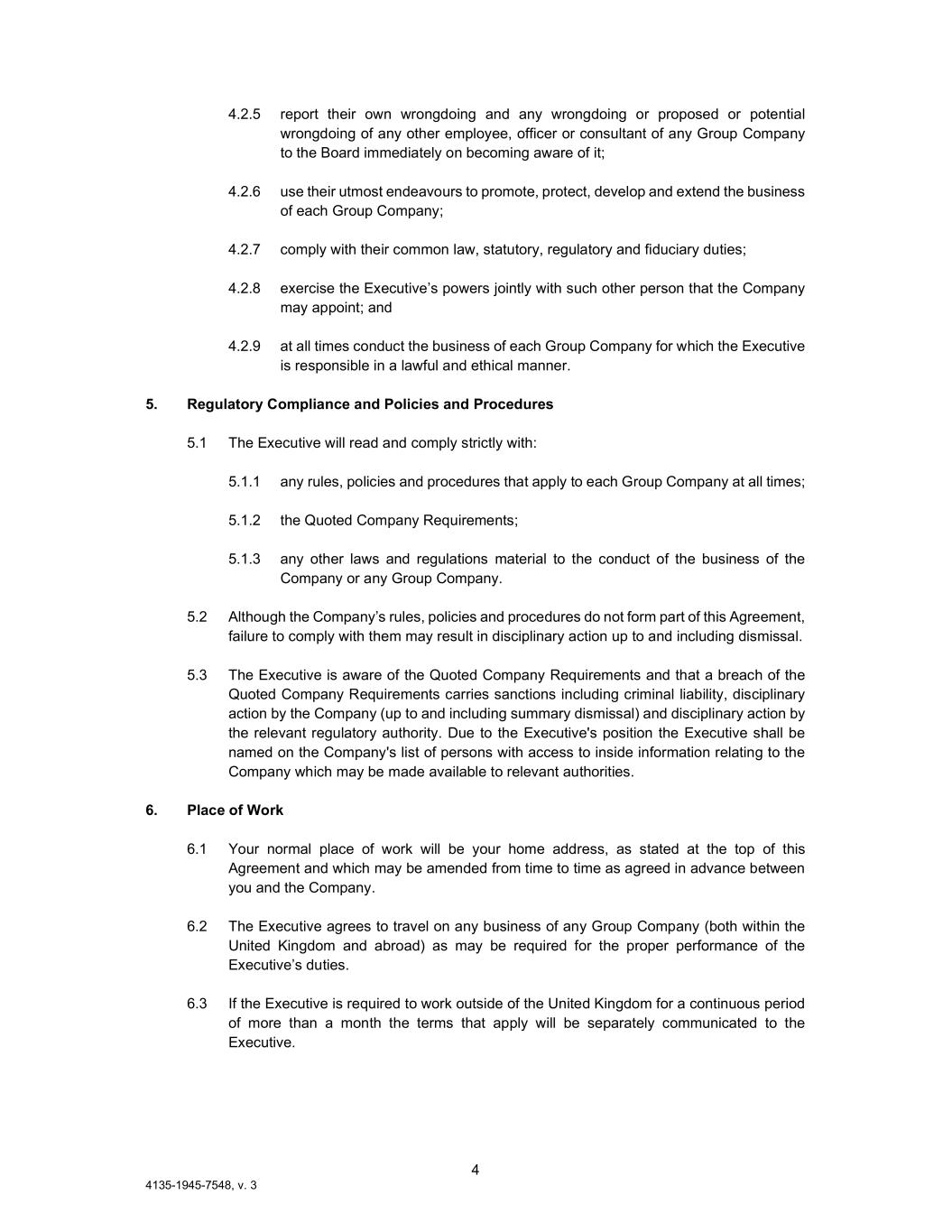 4 4135-1945-7548, v. 3 4.2.5 report their own wrongdoing and any wrongdoing or proposed or potential wrongdoing of any other employee, officer or consultant of any Group Company to the Board immediately on becoming aware of it; 4.2.6 use their utmost endeavours to promote, protect, develop and extend the business of each Group Company; 4.2.7 comply with their common law, statutory, regulatory and fiduciary duties; 4.2.8 exercise the Executive’s powers jointly with such other person that the Company may appoint; and 4.2.9 at all times conduct the business of each Group Company for which the Executive is responsible in a lawful and ethical manner. 5. Regulatory Compliance and Policies and Procedures 5.1 The Executive will read and comply strictly with: 5.1.1 any rules, policies and procedures that apply to each Group Company at all times; 5.1.2 the Quoted Company Requirements; 5.1.3 any other laws and regulations material to the conduct of the business of the Company or any Group Company. 5.2 Although the Company’s rules, policies and procedures do not form part of this Agreement, failure to comply with them may result in disciplinary action up to and including dismissal. 5.3 The Executive is aware of the Quoted Company Requirements and that a breach of the Quoted Company Requirements carries sanctions including criminal liability, disciplinary action by the Company (up to and including summary dismissal) and disciplinary action by the relevant regulatory authority. Due to the Executive's position the Executive shall be named on the Company's list of persons with access to inside information relating to the Company which may be made available to relevant authorities. 6. Place of Work 6.1 Your normal place of work will be your home address, as stated at the top of this Agreement and which may be amended from time to time as agreed in advance between you and the Company. 6.2 The Executive agrees to travel on any business of any Group Company (both within the United Kingdom and abroad) as may be required for the proper performance of the Executive’s duties. 6.3 If the Executive is required to work outside of the United Kingdom for a continuous period of more than a month the terms that apply will be separately communicated to the Executive.