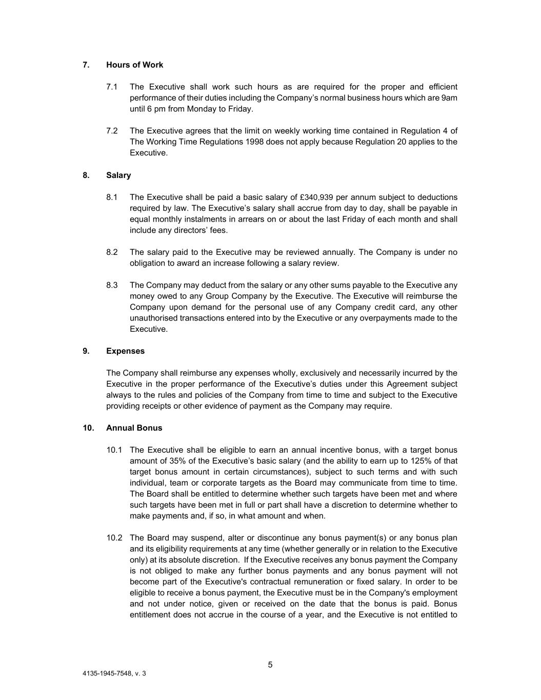 5 4135-1945-7548, v. 3 7. Hours of Work 7.1 The Executive shall work such hours as are required for the proper and efficient performance of their duties including the Company’s normal business hours which are 9am until 6 pm from Monday to Friday. 7.2 The Executive agrees that the limit on weekly working time contained in Regulation 4 of The Working Time Regulations 1998 does not apply because Regulation 20 applies to the Executive. 8. Salary 8.1 The Executive shall be paid a basic salary of £340,939 per annum subject to deductions required by law. The Executive’s salary shall accrue from day to day, shall be payable in equal monthly instalments in arrears on or about the last Friday of each month and shall include any directors’ fees. 8.2 The salary paid to the Executive may be reviewed annually. The Company is under no obligation to award an increase following a salary review. 8.3 The Company may deduct from the salary or any other sums payable to the Executive any money owed to any Group Company by the Executive. The Executive will reimburse the Company upon demand for the personal use of any Company credit card, any other unauthorised transactions entered into by the Executive or any overpayments made to the Executive. 9. Expenses The Company shall reimburse any expenses wholly, exclusively and necessarily incurred by the Executive in the proper performance of the Executive’s duties under this Agreement subject always to the rules and policies of the Company from time to time and subject to the Executive providing receipts or other evidence of payment as the Company may require. 10. Annual Bonus 10.1 The Executive shall be eligible to earn an annual incentive bonus, with a target bonus amount of 35% of the Executive’s basic salary (and the ability to earn up to 125% of that target bonus amount in certain circumstances), subject to such terms and with such individual, team or corporate targets as the Board may communicate from time to time. The Board shall be entitled to determine whether such targets have been met and where such targets have been met in full or part shall have a discretion to determine whether to make payments and, if so, in what amount and when. 10.2 The Board may suspend, alter or discontinue any bonus payment(s) or any bonus plan and its eligibility requirements at any time (whether generally or in relation to the Executive only) at its absolute discretion. If the Executive receives any bonus payment the Company is not obliged to make any further bonus payments and any bonus payment will not become part of the Executive's contractual remuneration or fixed salary. In order to be eligible to receive a bonus payment, the Executive must be in the Company's employment and not under notice, given or received on the date that the bonus is paid. Bonus entitlement does not accrue in the course of a year, and the Executive is not entitled to